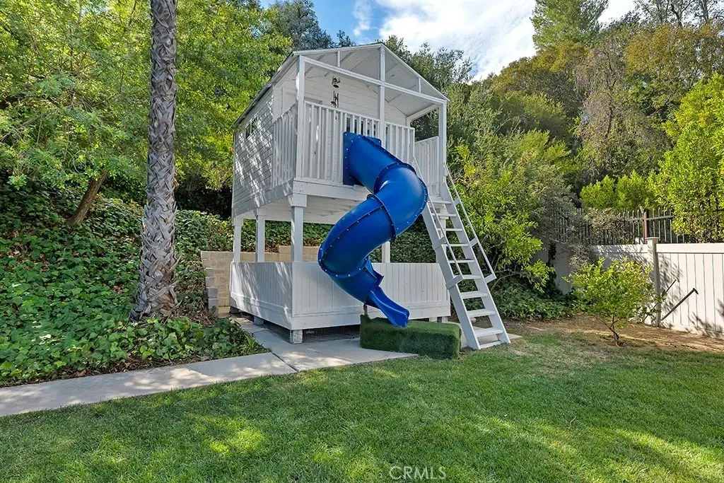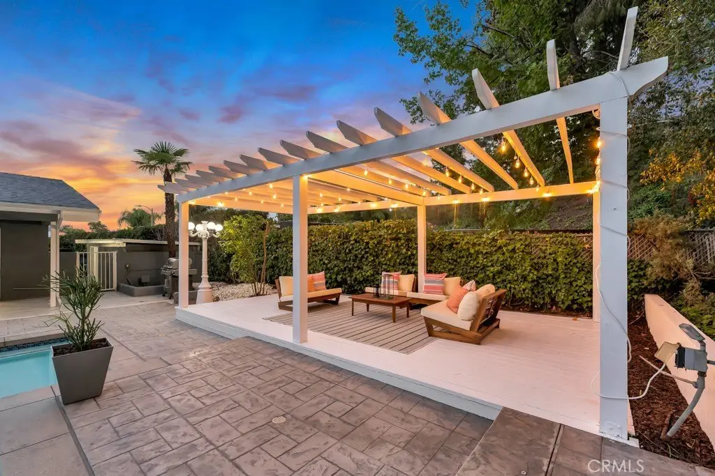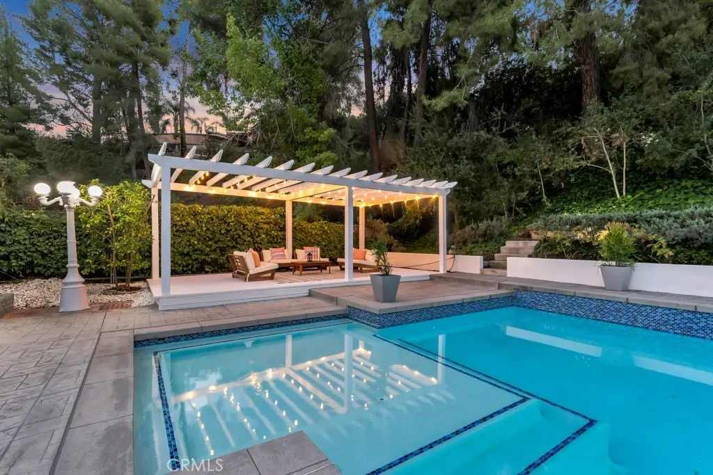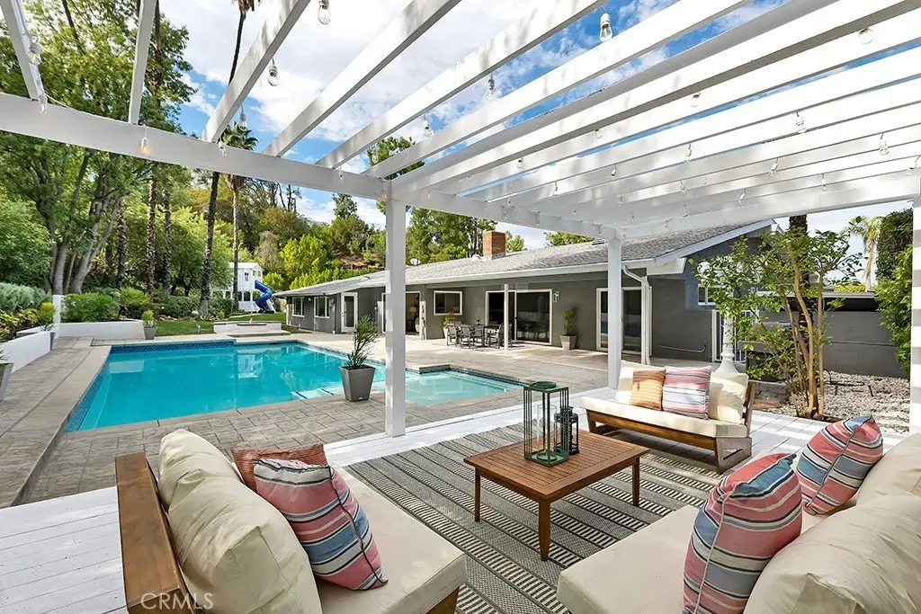 Welcome to your private sanctuary tucked away on a peaceful cul-de-sac in the highly sought-after hills of Tarzana. This luxuriously renovated single-story home offers 5 bedrooms, 4 bathrooms, and 3,386 sq ft of refined living space on a sprawling 21,529 sq ft lot designed for both relaxation and entertaining. Step inside to experience the seamless flow of this modern open-concept layout, filled with natural light and sophisticated finishes. The heart of the home is the designer kitchen, featuring custom cabinetry, a striking black arabesque tile backsplash, professional-grade stainless steel appliances, and an oversized granite island perfect for gatherings. The kitchen opens to expansive living and dining areas anchored by a floor-to-ceiling double-sided stone fireplace, creating an inviting ambiance for both casual and formal entertaining. Retreat to the spacious primary suite, complete with a walk-in closet, spa-inspired ensuite, and a private bonus room ideal for a home office, gym, or nursery. Each bedroom is thoughtfully positioned for privacy and comfort, including a guest suite with its own bath. Outside, experience your very own resort-style paradise. The sparkling pool with a Baja shelf invites you to unwind under the California sun, while the covered patio and string-lit pergola offer the perfect setting for al fresco dinners and weekend gatherings. A large grassy lawn provides space for kids or pets to play, complete with a charming 2-story treehouse and slide, while a hillside viewing deck delivers breathtaking sunset views over Tarzana’s rolling landscape. Blending luxury, comfort, and tranquility, this home perfectly captures the essence of Southern California living — a rare find in one of Tarzana’s most desirable neighborhoods. Close to premier shopping, dining, and top-rated schools, this property truly has it all.