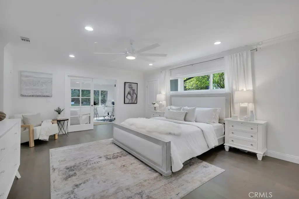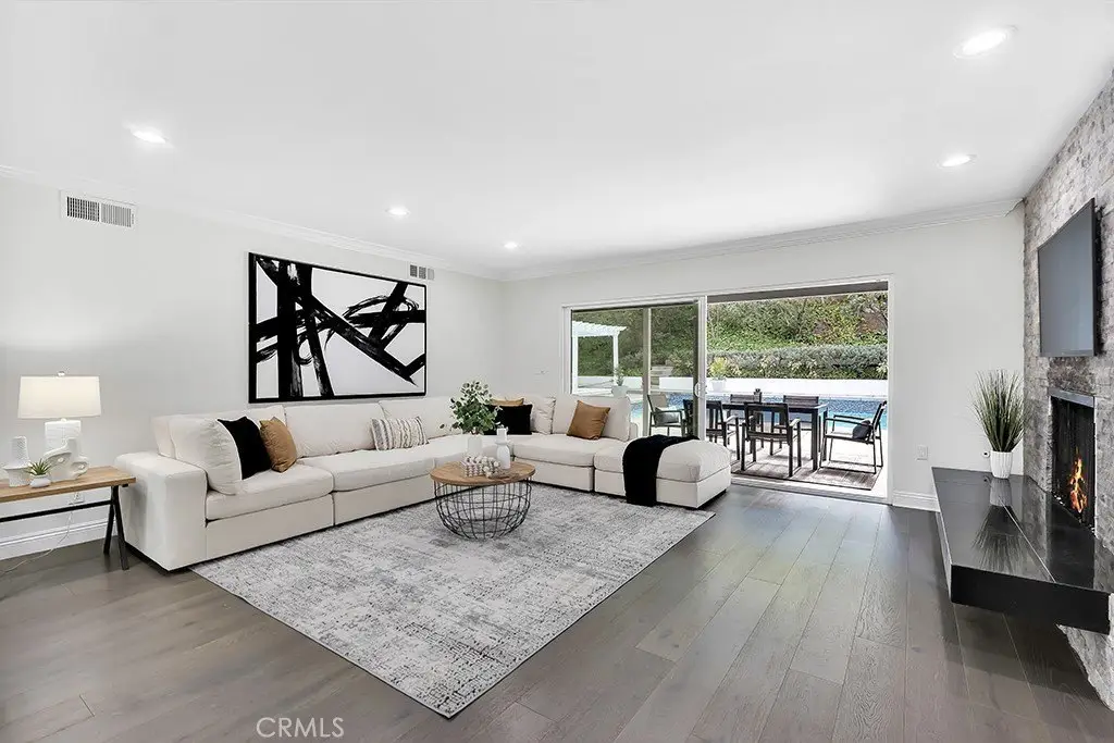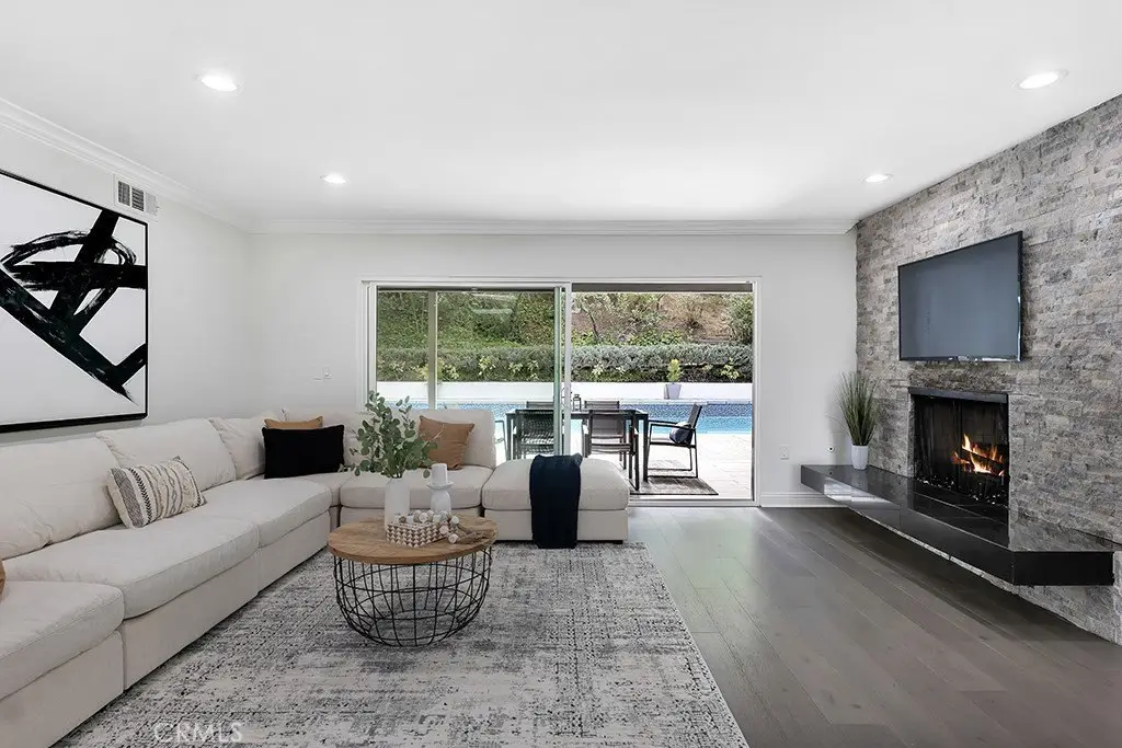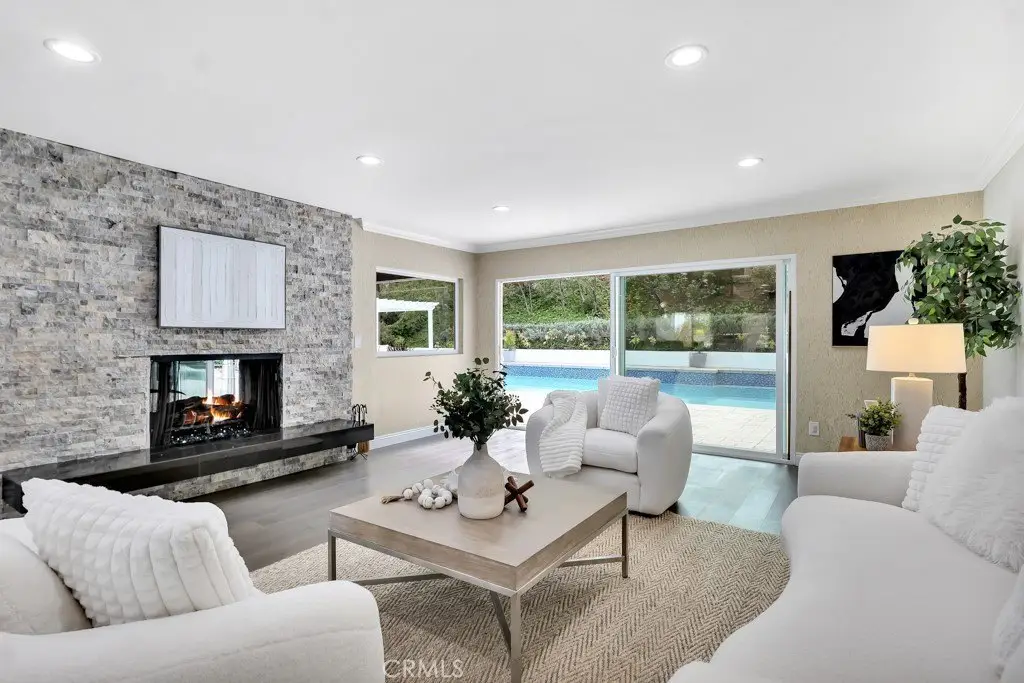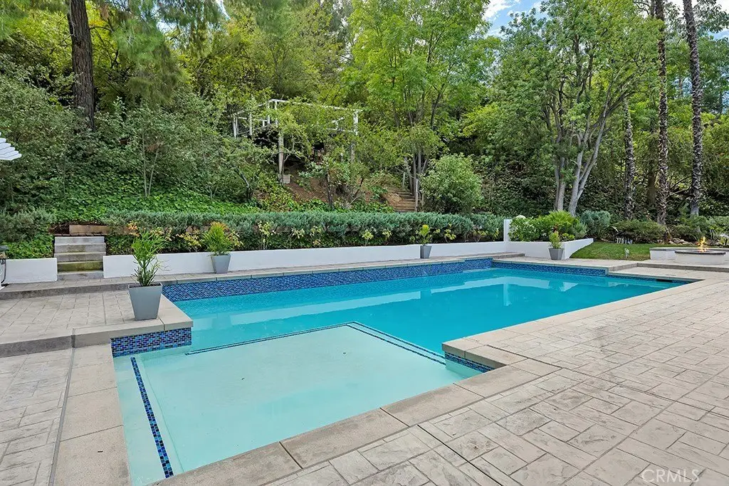Welcome to your private sanctuary tucked away on a peaceful cul-de-sac in the highly sought-after hills of Tarzana. This luxuriously renovated single-story home offers 5 bedrooms, 4 bathrooms, and 3,386 sq ft of refined living space on a sprawling 21,529 sq ft lot designed for both relaxation and entertaining. Step inside to experience the seamless flow of this modern open-concept layout, filled with natural light and sophisticated finishes. The heart of the home is the designer kitchen, featuring custom cabinetry, a striking black arabesque tile backsplash, professional-grade stainless steel appliances, and an oversized granite island perfect for gatherings. The kitchen opens to expansive living and dining areas anchored by a floor-to-ceiling double-sided stone fireplace, creating an inviting ambiance for both casual and formal entertaining. Retreat to the spacious primary suite, complete with a walk-in closet, spa-inspired ensuite, and a private bonus room ideal for a home office, gym, or nursery. Each bedroom is thoughtfully positioned for privacy and comfort, including a guest suite with its own bath. Outside, experience your very own resort-style paradise. The sparkling pool with a Baja shelf invites you to unwind under the California sun, while the covered patio and string-lit pergola offer the perfect setting for al fresco dinners and weekend gatherings. A large grassy lawn provides space for kids or pets to play, complete with a charming 2-story treehouse and slide, while a hillside viewing deck delivers breathtaking sunset views over Tarzana’s rolling landscape. Blending luxury, comfort, and tranquility, this home perfectly captures the essence of Southern California living — a rare find in one of Tarzana’s most desirable neighborhoods. Close to premier shopping, dining, and top-rated schools, this property truly has it all.