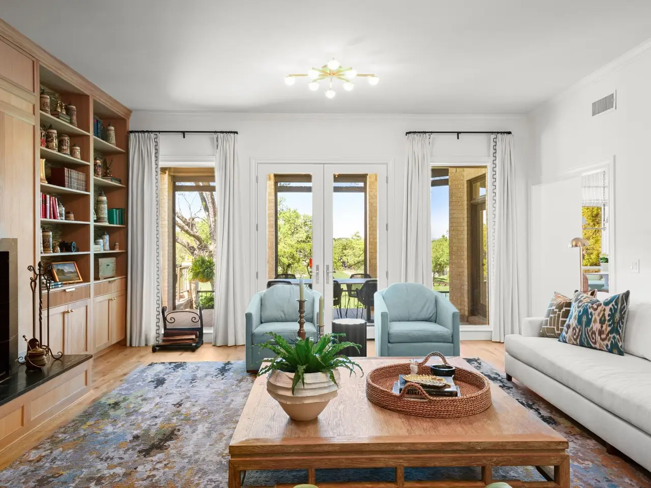 Wake up every morning in your own Palm Beach-inspired golf resort. This picturesque traditional family home has been renovated to perfection and sits on a private lot nestled in a cul-de-sac and on fairways #13 and #14 of The Hills of Lakeway golf course. Flawless interior design touches in every room, this vibrant family home is the ideal property for those seeking stunning views and quick access to the course and community clubhouse. This colorful two-story home features four bedrooms, four full and two half baths. A gourmet kitchen in the center of the home offers panoramic views and a breakfast nook overlooking the pond. The spacious primary bedroom on the first level includes breathtaking views of the course with a private fireplace, lounge area, and large walk-in closet and shower. There are two light-filled living areas downstairs, with a fireplace and formal dining, and an elevator to the second level, where the airy designs and classical details for each space continue. The second primary suite upstairs features a private balcony overlooking endless views of the greens. There are also two additional bedrooms on the second level, including an optional living/game room featuring a wet bar, and a study. Outside, the impressive driveway leads to a spacious two-car and golf cart garage, along with an attached workshop and garden room. The oasis-like pool is surrounded by lush greenery and opulent oak trees that offer additional privacy and natural ambience. Absolutely brimming with old-world glamor and sophistication with a modern twist, this home is sure to transport you to your own personal paradise!