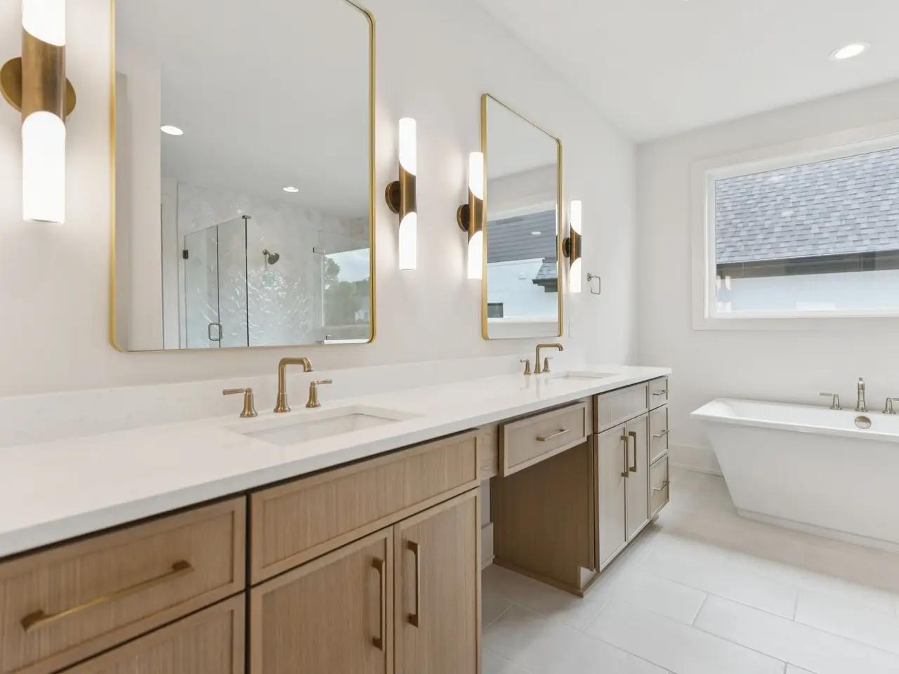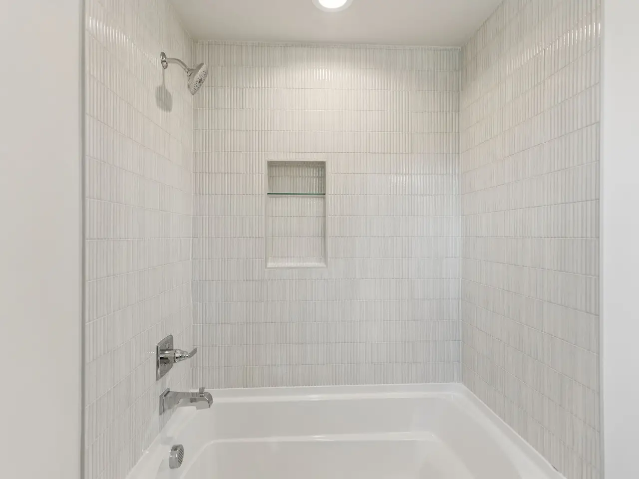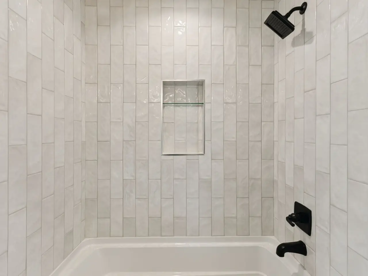 Floor-to-ceiling tiled shower in one of three full bathrooms