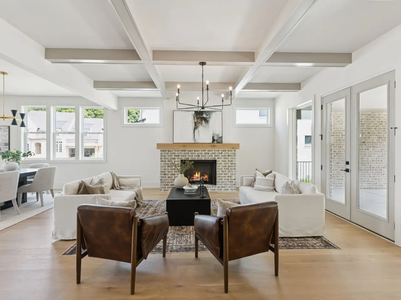 Open-concept living space with coffered ceiling