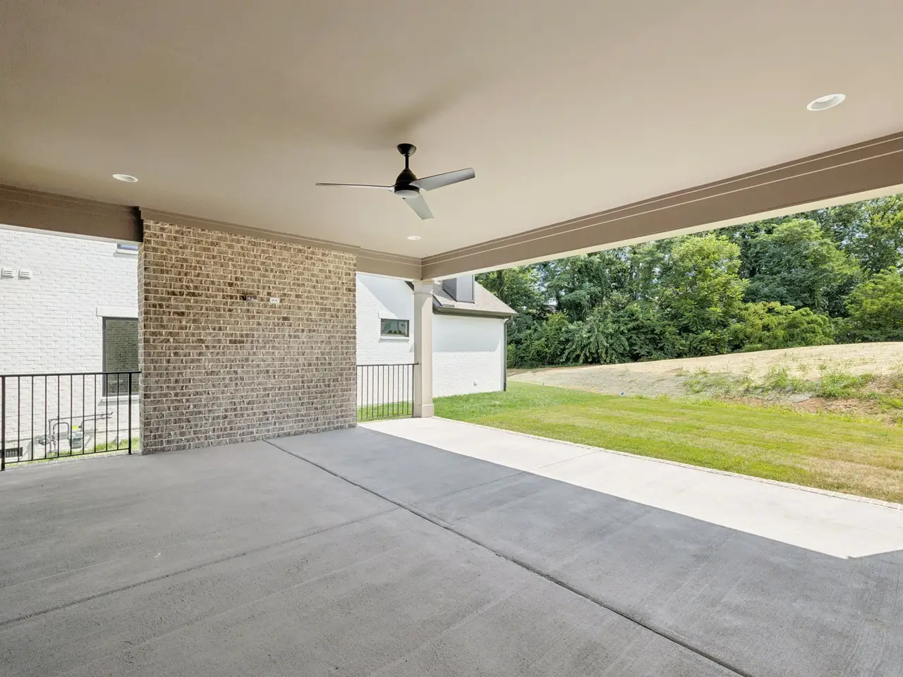 Covered back porch opening to spacious backyard