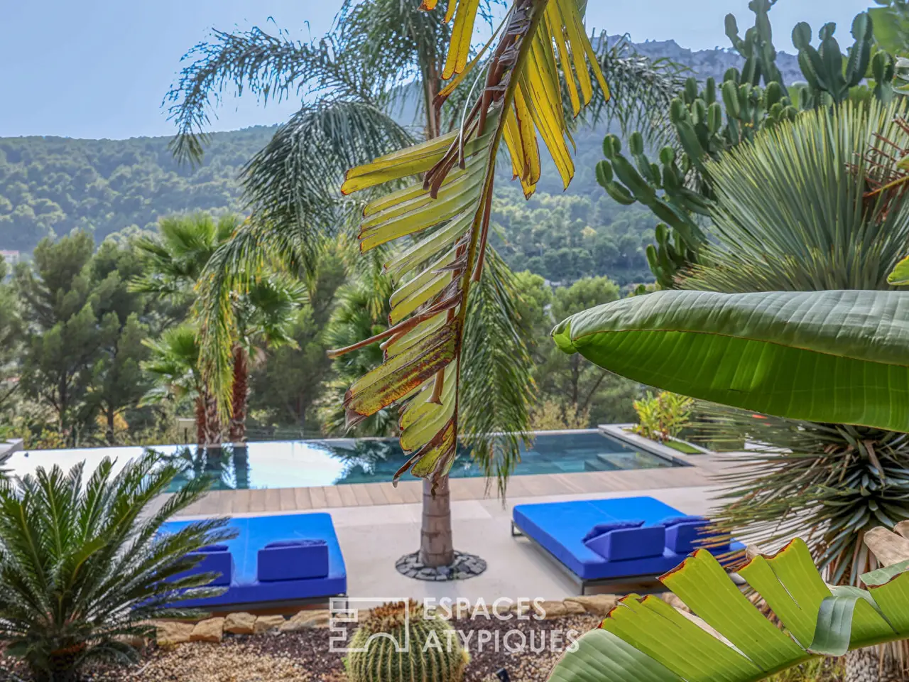 In a green setting just 10 minutes from the sea between Toulon and Hyeres in the Var region, this modern contemporary architecture house skillfully unfolds over 345 sqm offering a unique living experience, combining spectacular volumes, natural light, and design.