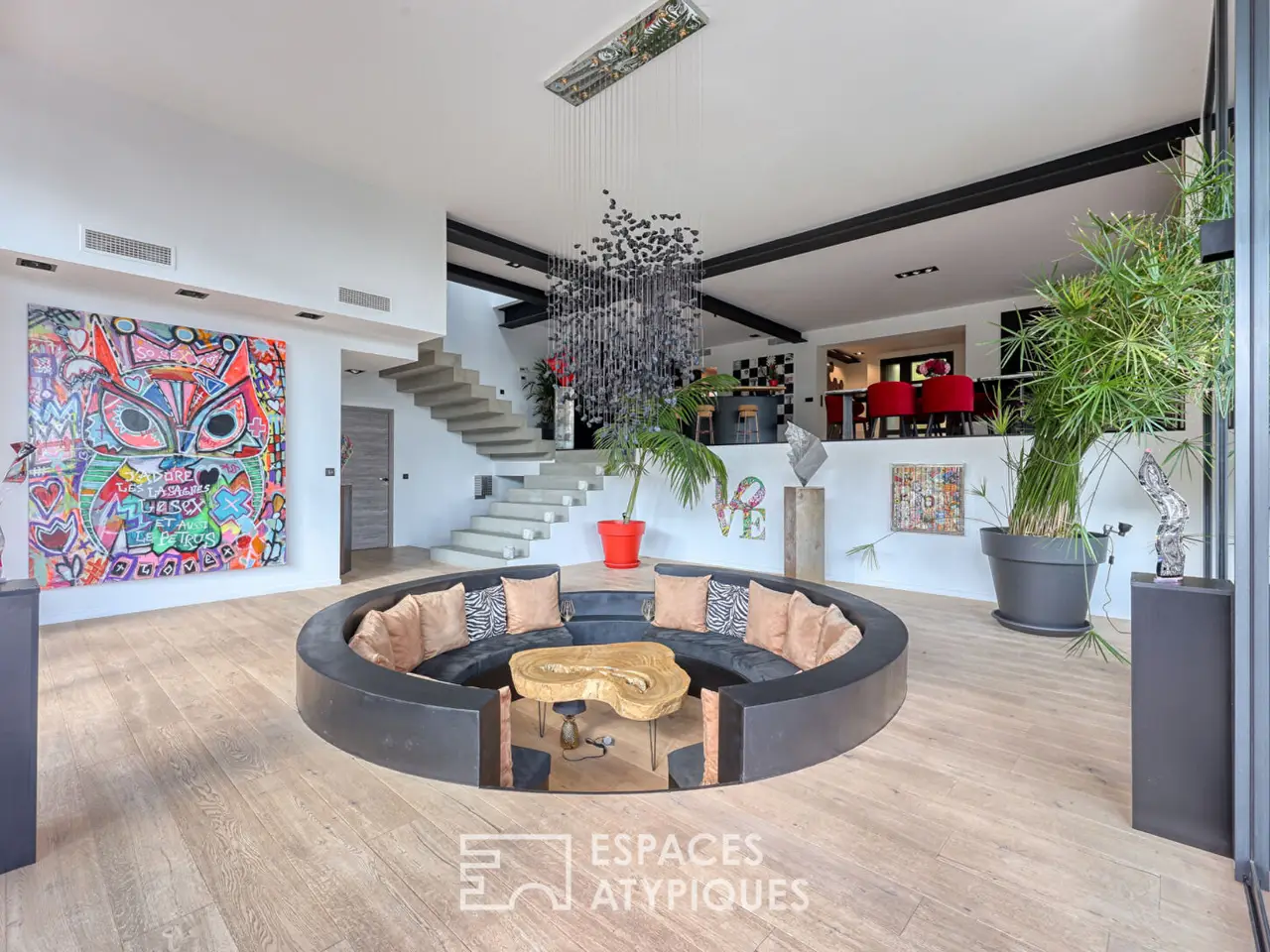 On the lower floor, an art gallery-style home office reveals itself as a confidential space, ideal for working. The atmosphere continues in a room dedicated to evenings, where billiards, pinball, fireplace and sofas create a convivial setting.