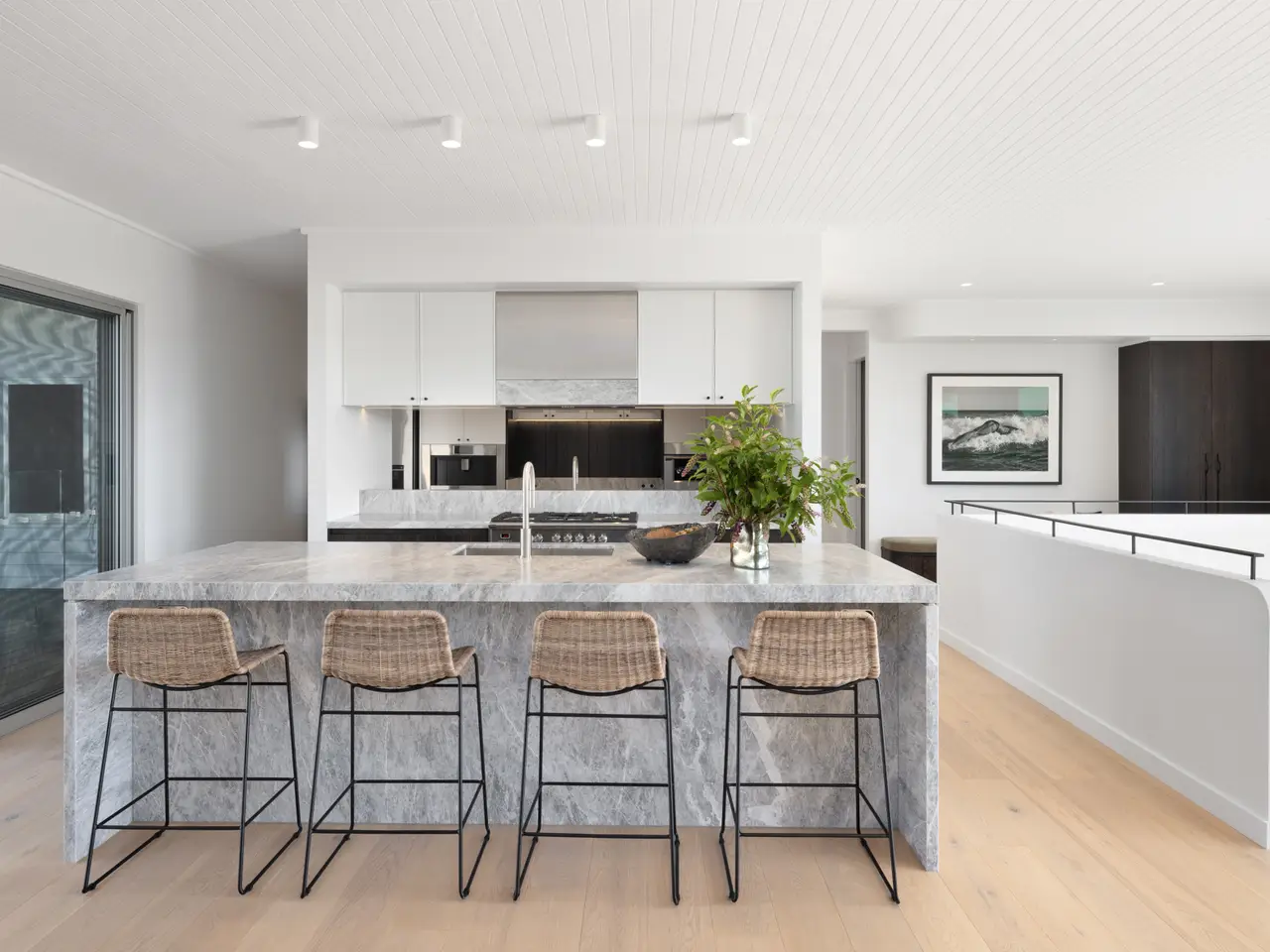 Chef's kitchen with marble island and Fisher & Paykel appliances