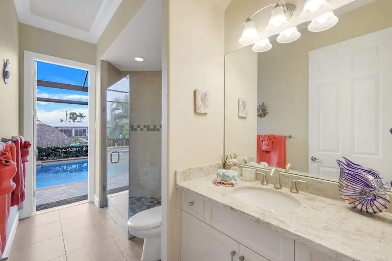 Experience the Ultimate Outdoor Lifestyle in Sunny Southwest Florida! Welcome to your personal tropical oasis! This stunning home features a tiki bar, outdoor kitchen, saltwater pool and spa, and a private dock with a tiki hut and boat lift offering direct Gulf access with no bridges or locks-just minutes to open water! As you arrive, you'll be greeted by a professionally landscaped yard filled with mature greenery, setting the tone for the beauty inside. Step through the elegant double-entry doors, and your eyes will be drawn to the sparkling pool with in-water seating, surrounded by a lush outdoor paradise. Inside, the home boasts tall ceilings, travertine flooring in the main living areas, crown molding, and tray ceilings. The chef in your family will love the dream kitchen, complete with custom wooden cabinetry, granite countertops, a breakfast bar, stainless steel appliances, and a large island with a wine fridge. The kitchen seamlessly flows into the living room, a casual eat-in area with pool views, and a formal dining space-perfect for entertaining. Slide open the glass doors to the expansive tiki bar, where you'll find a custom stone fireplace, charcoal and gas grills, an icemaker, dishwasher, pot filler, and outdoor burners, including a griddle. Relax by the heated (electric and solar) pool, grab a seat at the covered bar to catch your favorite sporting event, or enjoy your morning coffee on the canal-side dock. The primary suite is a serene retreat with access to the lanai, a spacious walk-in closet, and an ensuite bathroom featuring a separate tub and a walk-through shower. The home's split floor plan ensures privacy, with two guest bedrooms-one ensuite and the other adjacent to the pool bath-plus a versatile den/office currently set up as a fourth bedroom. This meticulously maintained home is being sold TURNKEY and exudes pride of ownership throughout. Live the vacation lifestyle every day with 5200 square feet of indoor/outdoor living! Built in 2014 by Frey & Sons, this home has not experienced any flooding. Call today to schedule your private showing and make this tropical retreat yours!