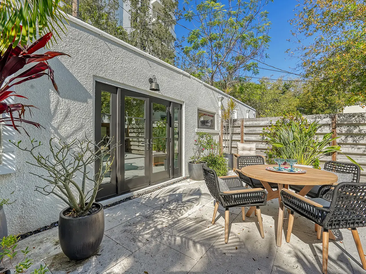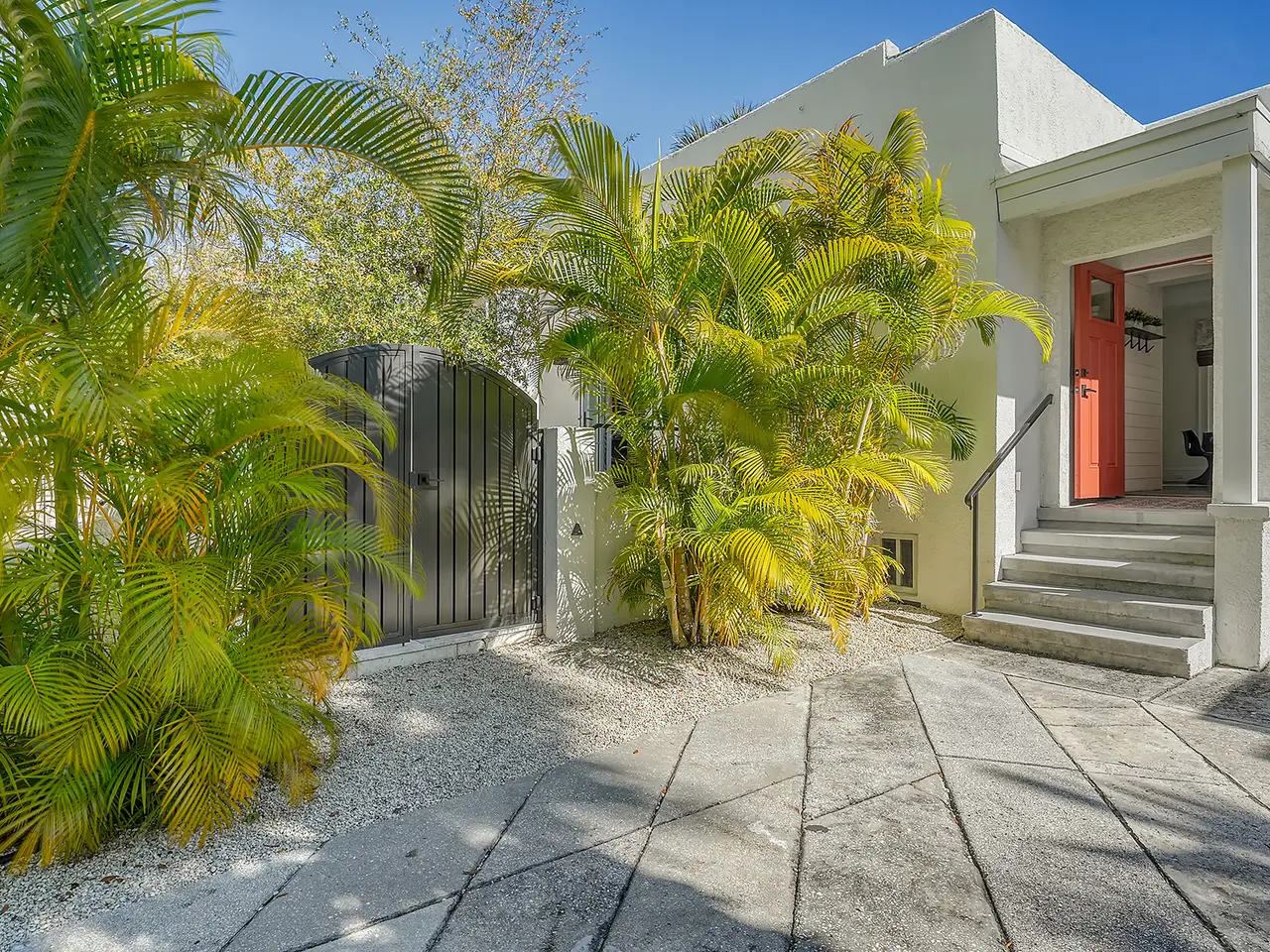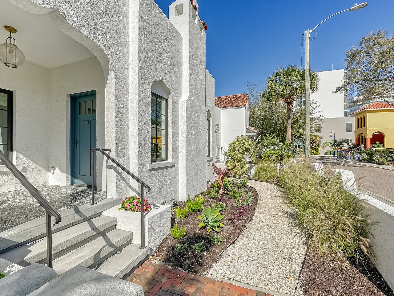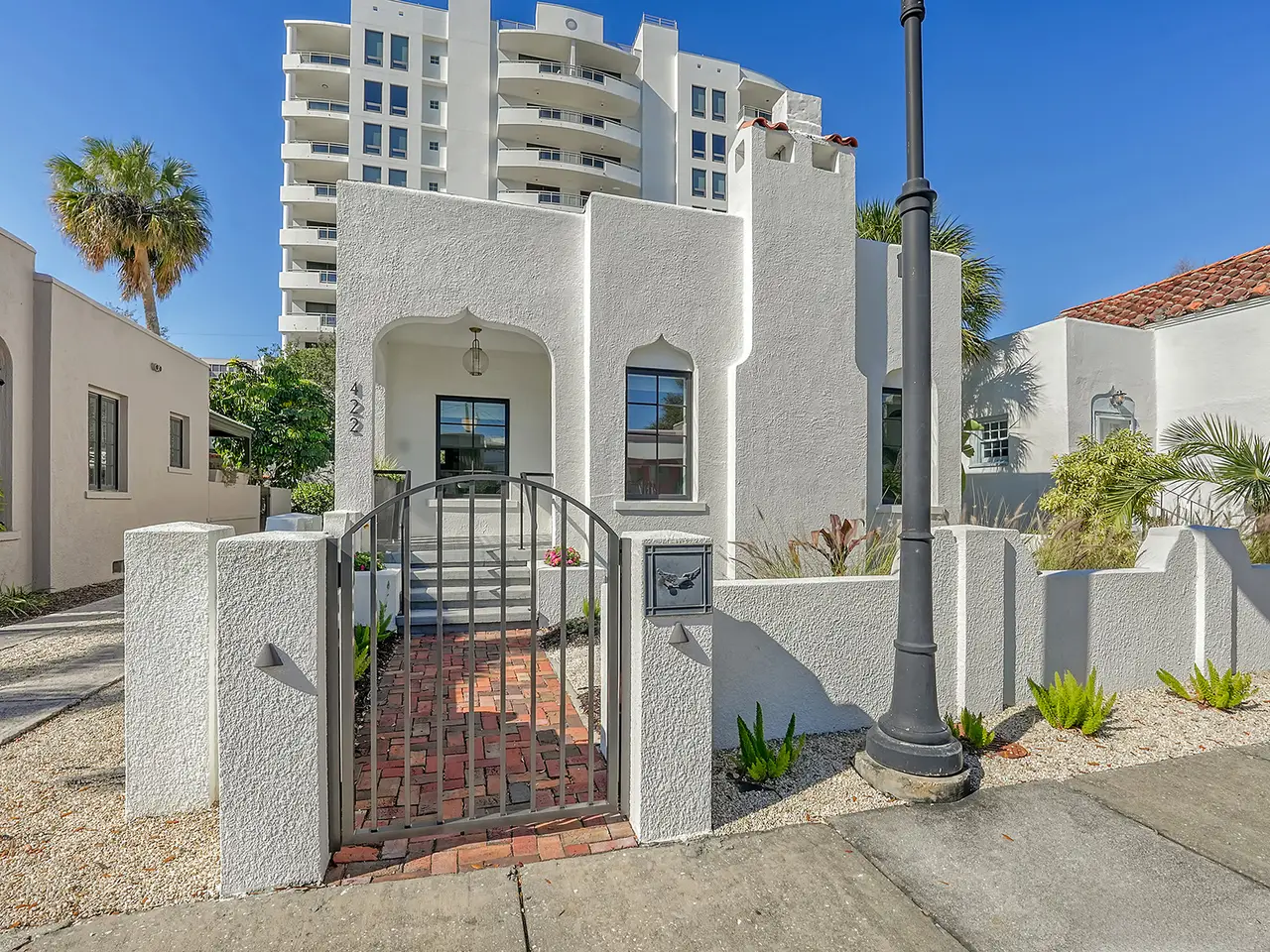 Welcome to Historic Burns Court! -- A quaint neighborhood dating back to the John Ringling Era, located in the heart of downtown Sarasota. This Spanish/Med bungalow has been featured and awarded many times across the span of a century. Recognized as one of 17 most breathtaking Mediterranean homes around the country, featured in an article published by TheSpruce.com. Built in the mid 1920’s by architect Thomas Reed Martin and recently renovated by Ryan Perrone of Nautilus Homes, with renowned interior designer, Ellen Hanson. Partnering together, they reimagined this petite bungalow using distinct Mediterranean Revival materials, seamlessly blending timeless elegance with modern comfort, all while retaining the home’s rich heritage. Greeted by a charming, gated front courtyard, with lush landscaping and with a few steps up: a lovely front porch with custom designer tile flooring. Once inside, you are immediately met with refined original wood flooring and custom window treatments throughout. The chef-inspired kitchen features high-end appliances, a discreet paneled refrigerator, soft-close cabinetry, a back door entry, and dining area, all with a timeless soft color palette. Down the hall, two bedrooms await, complete with custom light fixtures and window treatments, custom built-in closet cabinetry, and hard wood flooring. French doors from the rear bedroom lead to a serene backyard oasis, where you can dine al Fresco in the Florida sunshine on your private patio, featuring stone pavers, complete privacy fence and back gate. The separate guest quarters offer another bedroom, full bathroom, ample closet space, and a welcoming ambiance for visitors. Positioned in one of downtown Sarasota’s most highly desired urban neighborhoods, this bungalow offers unrivaled convenience, within walking distance to exquisite dining, art galleries, boutique shops, cozy cafes, Selby Gardens, the downtown farmer’s market, Marina Jack, and much more. Additionally, the property’s Downtown Core zoning classification allows for a variety of commercial uses, including retail shops, restaurants, office space and lodging. You can’t beat this extraordinary opportunity to own a piece of Sarasota’s history!