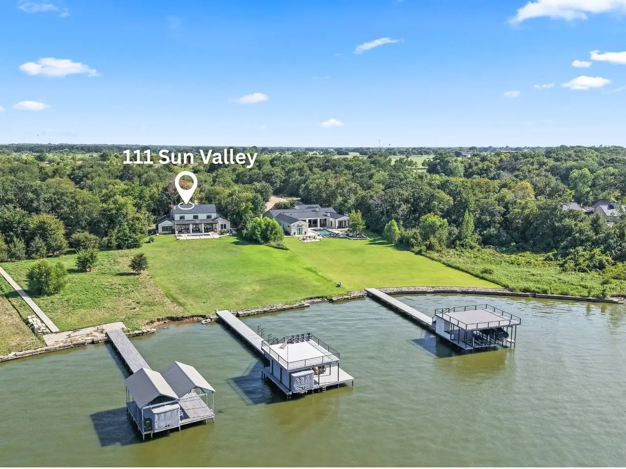 Nestled on 3.46 acres with 131 feet of open waterfront, this extraordinary estate is one of only 6 estate size homesites in the exclusive gated 505 Ranch just 45 minutes from Downtown Dallas. This premier community with 56 waterfront home sites lends lakefront luxury with ranch-style living across 505 pristine acres on the shores of Cedar Creek Lake. A long, wooded driveway leads to a striking modern lake home featuring open-concept great room flooded with natural light through tall windows that frame panoramic water views. A stone fireplace, built-ins, wood floors, and wood-beamed ceilings add warmth and character, while the state-of-the-art kitchen is a chef’s dream, featuring high-end appliances, a gas range, double ovens, and an expansive island with wine fridge and ice maker. The main level hosts two lake-view primary suites with baths along with a spacious utility room and a built-in workspace. Upstairs, the bonus room invites relaxation and entertainment with a large sectional, pool table, and wet bar equipped with a sink, fridge, and microwave. Two custom-designed bunk rooms, both with ensuite baths and water views, provide ample space for guests. Step outside to a large covered patio featuring a mounted TV, ceiling heaters, and a Coyote grill. Stunning pool with both heater and chiller, a stone firepit, and a lush lawn leads to private boathouse with composite decking, covered seating, two jet ski lifts, a boat lift and party deck. Estate size lot owners have option of keeping a horse on the property and the equestrian center. As part of 505 Ranch, residents enjoy exclusive access to over 400 acres of unmatched amenities including an equestrian center, guest cottages, polo field, pickleball courts, skeet range, hiking and ATV trails, stocked fishing ponds, a clubhouse, pool, sandy beach, and full-time ranch staff with concierge services. Whether you’re seeking a serene retreat or an active lifestyle, this rare offering delivers the best of both worlds.