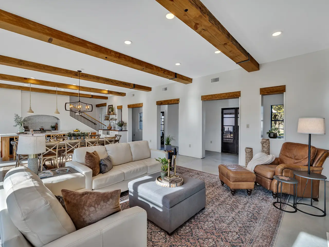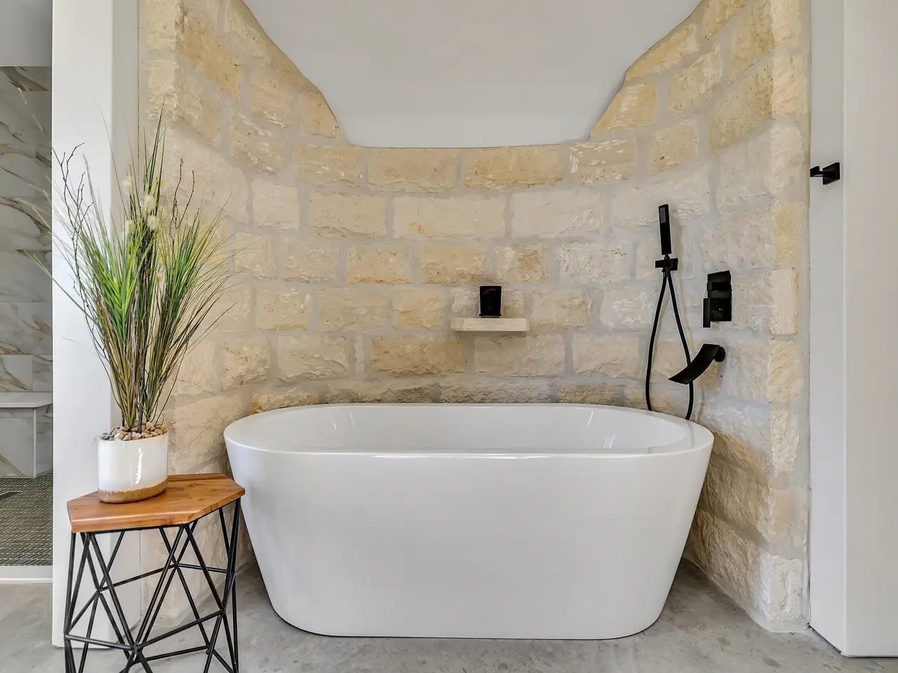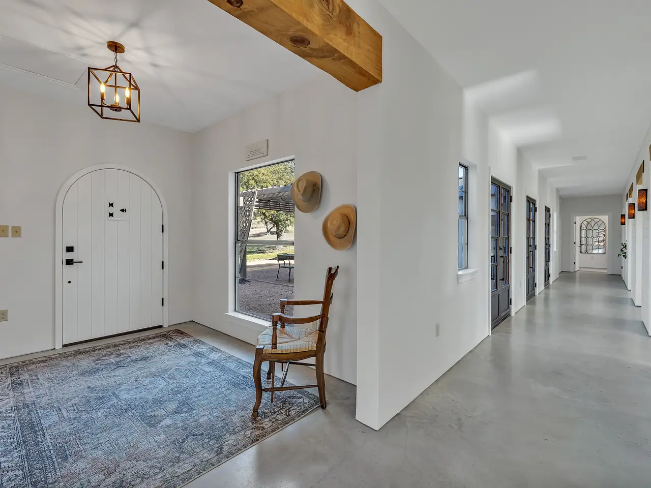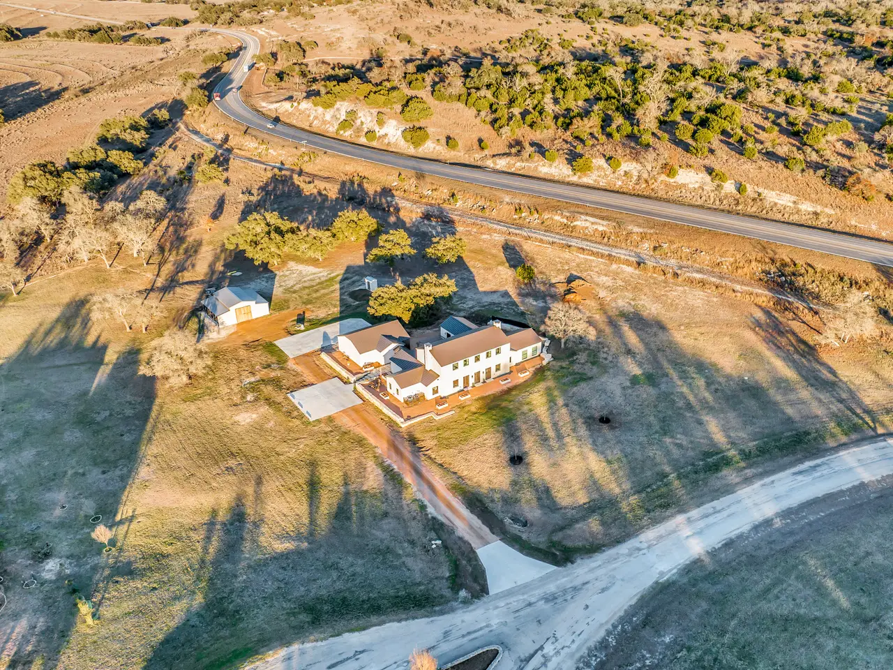 Experience serene luxury in a modern farmhouse nestled in the picturesque Texas Hill Country. The property is ideally located near the charming towns of Fredericksburg, Comfort, and Kerrville. Upon entering the property, an expansive limestone pathway leads to the entrance. The inviting courtyard adorned with a vine-covered pergola and twinkling lights provides a delightful spot to relax. The two-story home has been thoughtfully designed to blend functionality and luxury seamlessly. The first level features elegant hallways that guide you through the various rooms. The entire first level has heated flooring and recessed lighting with evening mood settings. The chef-ready kitchen is an excellent space for culinary enthusiasts, with multiple workstations, three sinks, high-end appliances, a butler's pantry, and quartz and woodblock countertops. The kitchen is perfectly set up for hosting events with separate stations for kitchen tasks, ample storage, and an 11-foot-long island that can accommodate up to five guests. The open floor plan leads to the dining area and living space, where large, rugged beams span the ceiling. The brick accent wall and wood-burning fireplace ground the light-filled room. Large solid steel entry doors line the exterior on each side of the home, providing easy access to the surrounding yard. The entire home is filled with natural light, and during the late afternoon, the main living area is transformed into a warm and serene space as the setting sun beams bounce off the floors, illuminating the space. The east wing of the home leads to the primary suite and office space. The elliptical arched ceilings with evening mood lighting provide an exceptional peaceful retreat. The en suite bath features a dual vanity, a freestanding porcelain tub, and a walk-in shower with a heated stone bench. The primary suite's dressing room boasts built-in shelving, a center console with storage, and a tri-fold mirror. The spacious and secluded office offers privacy and a reflective workspace. The second level features three spacious bedrooms, two full bathrooms, and a family room. The wood floors on the second level complement the abundance of natural light that fills the entire home. The property's detached oversized garage provides ample space for two cars, a golf cart/ATV, and extra storage. The barn, measuring 36x30 feet, is currently set up as a horse barn but can be restructured as a storage barn, among other options. Restful country living can be experienced at this tranquil, private home.