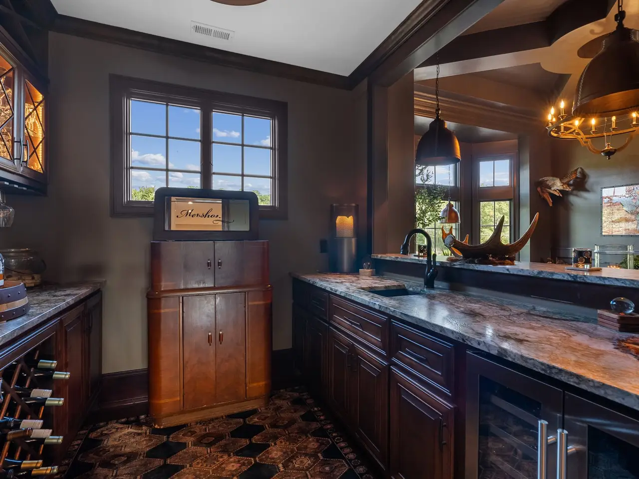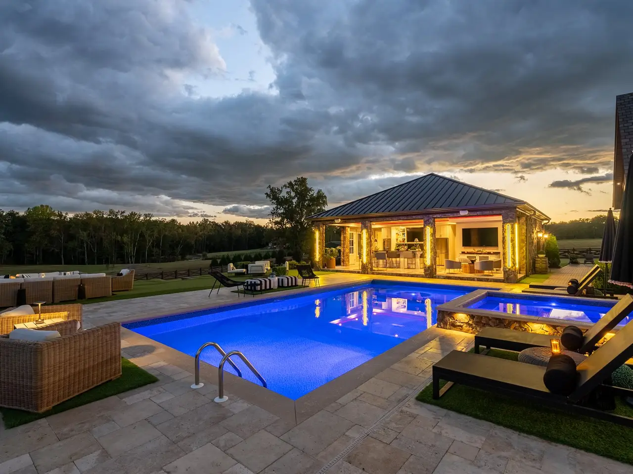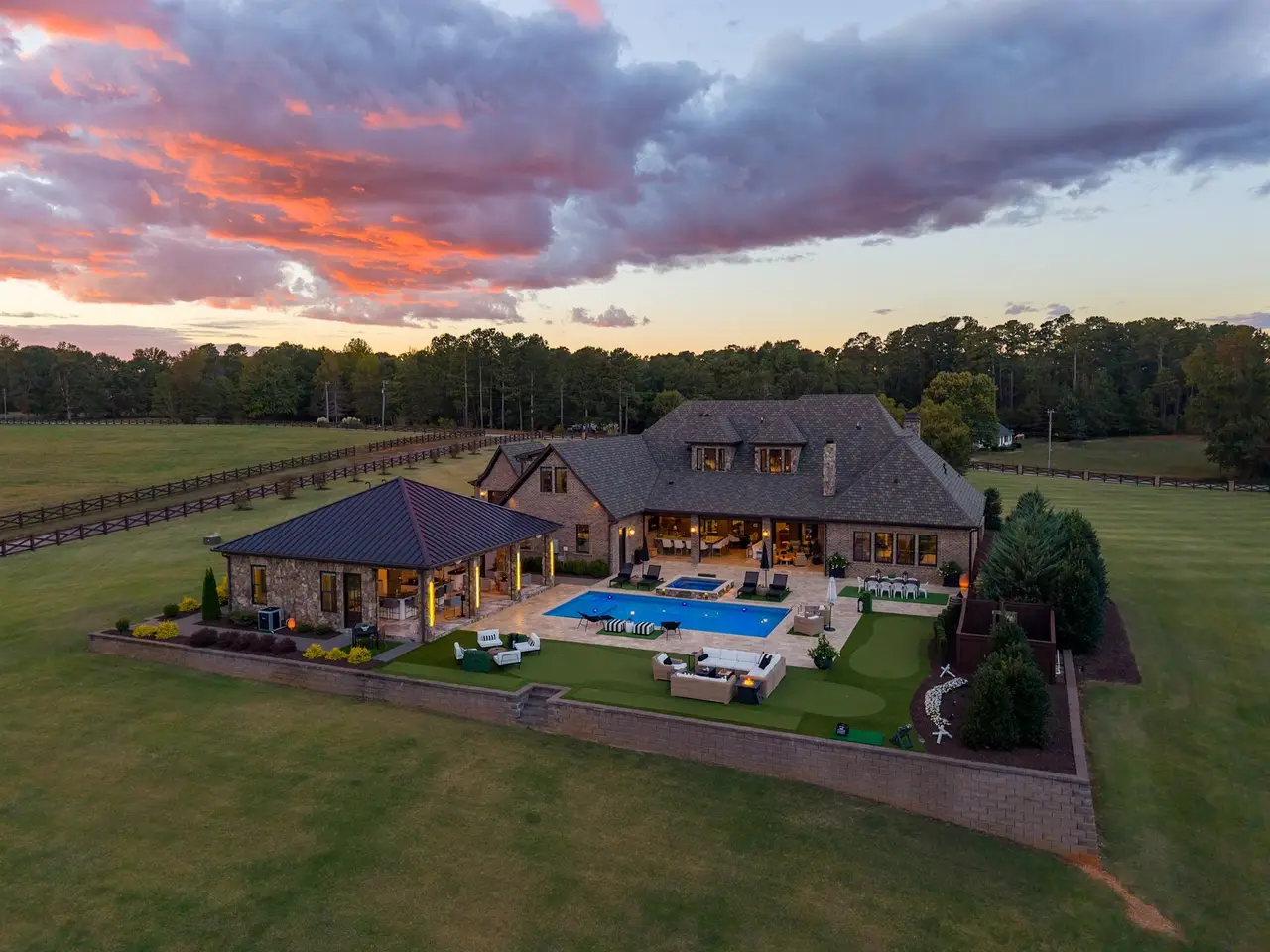 Imagine more than ten acres of pristine, perfectly curated land with an extraordinary home designed for entertaining at every level. Agape Acres Estate is tucked behind private gates, down a tree-lined paver driveway where a graceful fountain welcomes you home. This grand estate feels worlds away from everything, yet remains perfectly positioned close to all modern amenities in Simpsonville, SC. While every corner holds its own charm, the backyard truly steals the show- breathtaking, functional, and unforgettable. A sparkling saltwater pool with a spillover spa glistens beneath the Carolina blue sky, with a nearby putting green ready for friendly poolside competitions. An expansive covered porch spans the width of the home, featuring an outdoor living room, wood-burning fireplace, and full kitchen/grilling area. This space can be fully enclosed and climate-controlled for year-round comfort. Perfect for hosting holiday gatherings that flow effortlessly from indoors to the outdoor fireplace. Enjoy your morning coffee as the mist rises off the pond or unwind fireside beneath the stars. From game days to quiet nights, all the outdoor space has been intentionally designed for every South Carolina season. The pool house feels like a private resort suite, luxurious, stylish, and perfectly situated in the Carolina countryside. Inside, you'll find a hotel-inspired bedroom with ensuite luxury bath overlooking the lush backyard, an additional full guest bath, laundry area, and an attached garage with extensive storage. The poolside kitchen features a large hibachi grill ideal for brunches or alfresco dinners, and like the main porch, this entire area can be fully enclosed, and temperature controlled. These are the spaces where good food and laughter linger long after the plates are cleared. The land itself invites exploration, whether by four-wheeler or alongside a few barnyard friends. Horses or goats would feel right at home here, grazing by the pond stocked with Large Mouth Bass and Bream. The perfect spot for a quiet afternoon of fishing. Roughly four acres are fully fenced, offering a sense of peace, privacy, and panoramic views at every turn. Inside, the same sense of warmth and refinement continues. Rich hardwoods and elegant tile run throughout, with no carpet in sight. The great room, anchored by a grand fireplace and custom built-ins, flows seamlessly into the chef's kitchen, breakfast area, and elegant dining room. The formal dining space feels both sophisticated and inviting, complete with an adjoining bar that turns dinner parties into lasting memories. Imagine hosting the upcoming holidays in this elegant yet comfortable setting. The main-level primary bedroom suite is a serene retreat with a showstopper gas-log fireplace, sitting area, and two custom closets with washer/dryer area. It has the most amazing view of the backyard/pool. Two additional bedrooms with full ensuite baths, an elegant office or sitting room with a gas fireplace, and a home theater room with a wet bar/kitchenette for movie nights are all located on the main level. You'll also find two conveniently placed powder rooms and a spacious walk-in laundry room on this floor. Head to the second level to find two additional ensuite bedrooms, each with beautifully custom-tiled baths, along with an extra office, and a spacious recreation/living area featuring a well-appointed kitchenette. This home is ideal for multi-generational living or hosting long-term guests. With over ten acres of land, there's enough room to add future home sites or additional amenities. Every detail of this grand estate has been carefully curated, from the custom ceiling designs and designer lighting, to the fully finished, epoxy-coated five-car garage. Every closet custom, and every space designed to showcase exceptional craftsmanship. This is a home that seamlessly blends indoor and outdoor living spaces together. You will certainly have a hard time choosing your favorite spot.