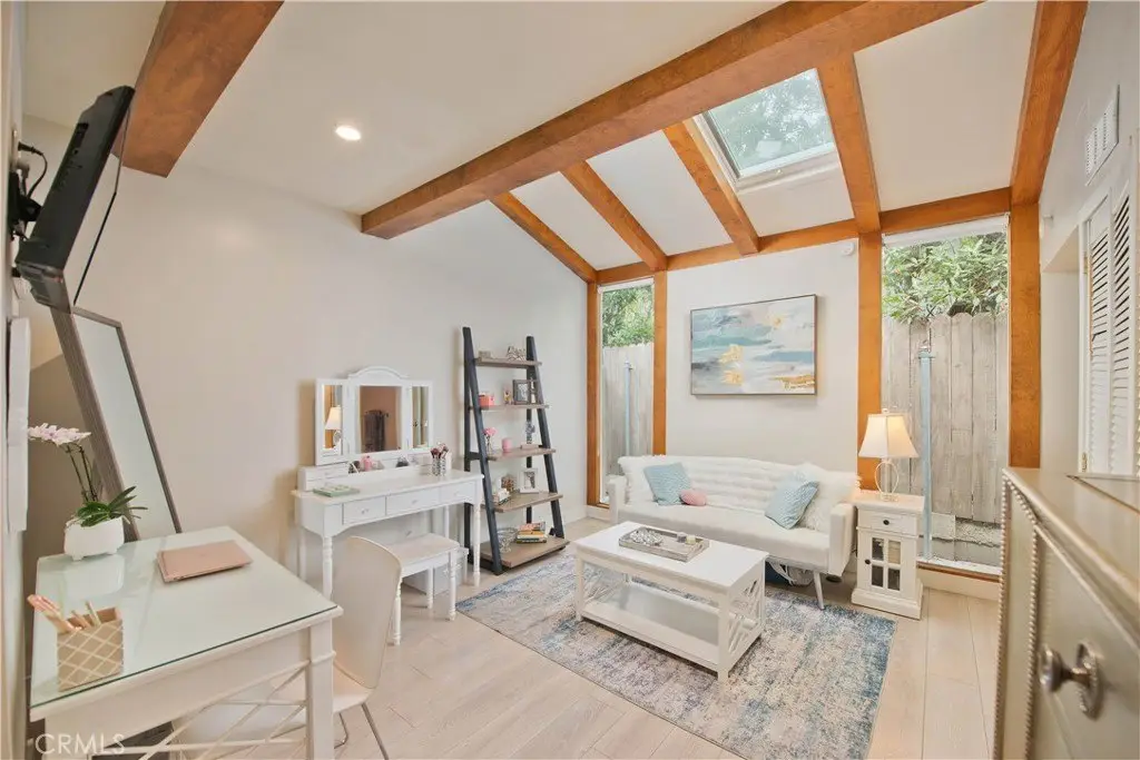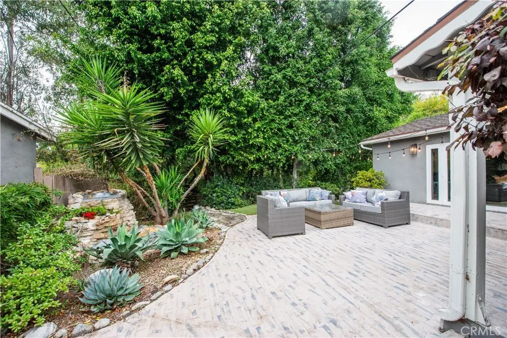 Nestled down a secluded, gated private driveway in the highly desirable Fashion Square district, this exceptional single level residence is highlighted with elegant wood and tile floors, loads of natural light and its timeless designer details. Upon entering the main living area, you are immediately captivated by the dramatic space, enhanced with its soaring ceilings, central fireplace, generous picture windows and French doors that pour in natural light. Opening from the living room is the expansive dining room that flows naturally into the perfectly updated kitchen, equipped with stainless steel appliances, custom cabinetry, and beautiful quartz countertops. Both the primary and secondary bedroom feature updated en-suite bathrooms, both enhanced by their luxurious wood beamed ceilings, with the oversized third bedroom offering direct access to the private rear yard patio. Step outside and decompress in the ultra-private rear yard with expansive entertaining areas surrounded by mature landscape, enhanced by the tranquil sound of its custom water feature, enjoy a round at your private putting green or explore the rear garden set under a canopy of lush trees. This home offers a rare combination of privacy and convenience tucked away from it all, yet moments from premier shopping and dining venues. Don’t miss this opportunity to enjoy a timeless home with distinctive character and beautiful updates in a premier Sherman Oaks location!