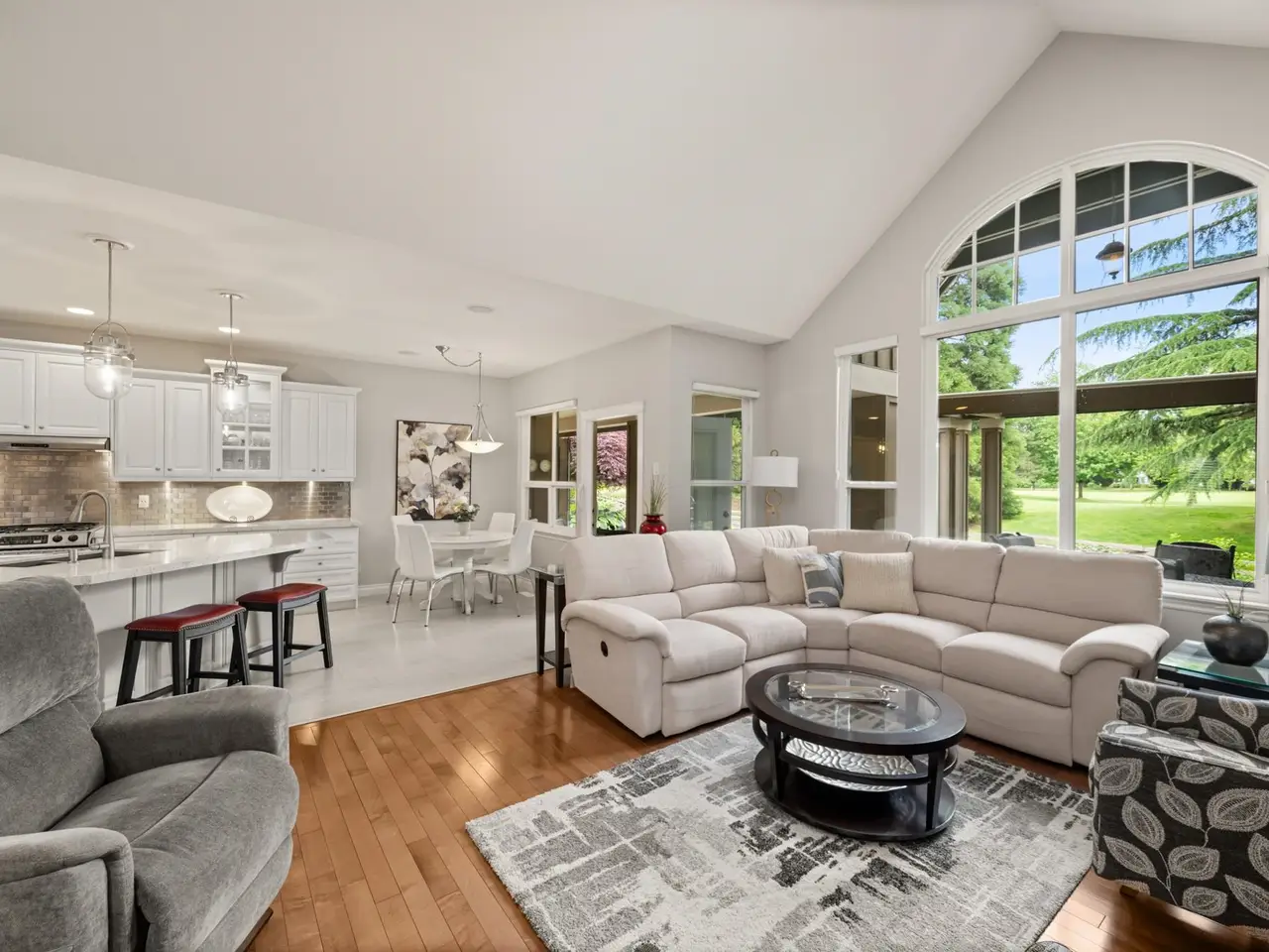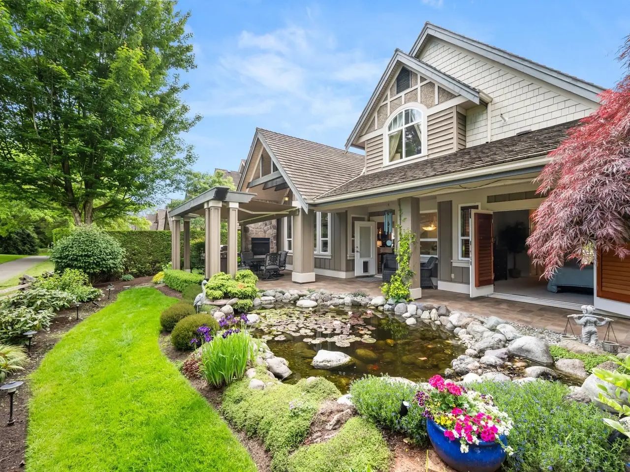Welcome to Carriage Green in Morgan Creek! This stunning Genex-built golf course 4,088 SF home backs onto the 11th green and showcases quality craftsmanship throughout. Featuring 4 beds/3.5 baths with the primary on the main, it offers vaulted ceilings, a dedicated office, formal dining/great room and an updated kitchen that opens to a covered patio with fireplace, tranquil water feature, and gorgeous golf course views. Upstairs are 2 spacious beds and a full bath. The lower level impresses with a custom bar, wine room, gym, rec room, and guest suite. Enjoy year-round comfort with A/C, new high-efficiency furnace and heat pump. Walk to Morgan Creek Golf Club, local dining, parks and top schools: Morgan Elementary, Grandview Heights, and Southridge. The perfect blend of home and lifestyle!