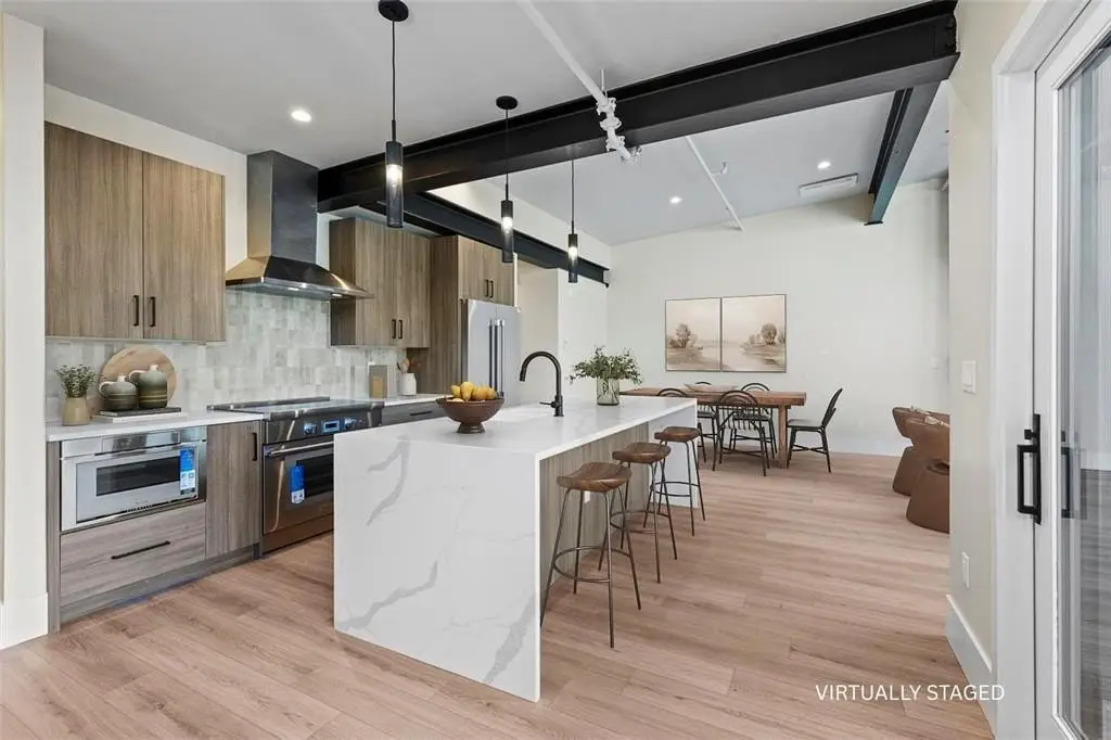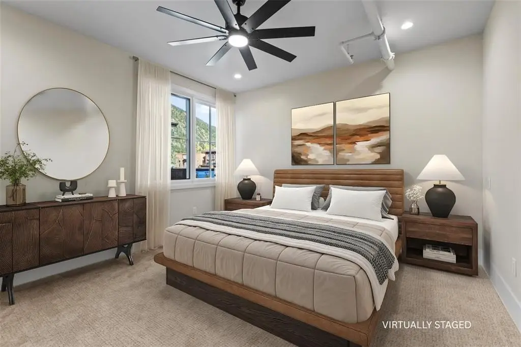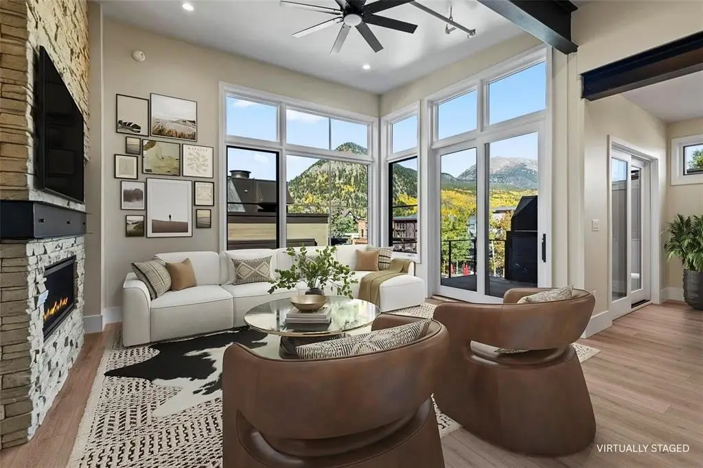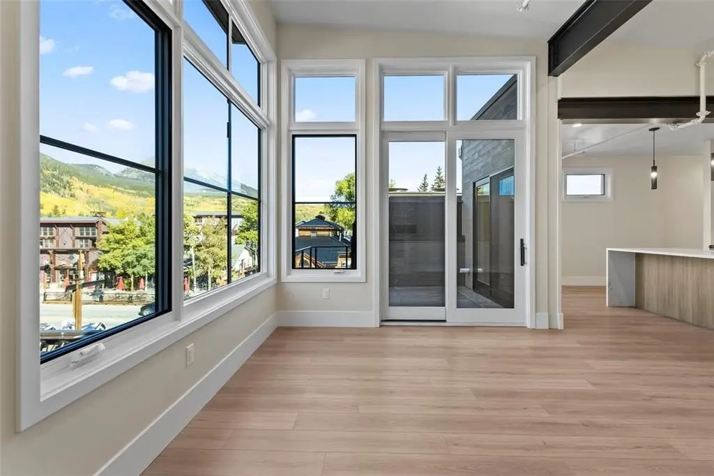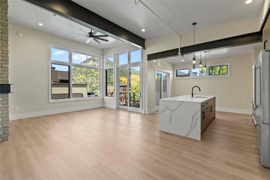 Experience urban mountain living with sweeping views from Buffalo Mountain to Peak 1. This corner one-bedroom features vaulted ceilings, exposed steel beams, radiant in-floor heating, and a gas fireplace. Upstairs, the kitchen offers Thermador appliances, an induction range, and a large island, with a powder room off the great room. Enjoy the private deck and parking that includes a heated garage plus a covered tandem space. This Main Street condo is centrally located in Prospectors Marketplace. The marketplace combines local eateries including Crepes A La Carte, Back to Texas BBQ, Fresh Press’d, Kanto x Wasabi, Chucky’s Burgers, Chimayo Grill, Lazo Empanadas and Groovy’s Mac n’ Cheese with McCoy’s Bar on the lower-level location and another bar on the upper-level complete with arcade games and a rooftop patio. The marketplace is tastefully designed and inspired by the rich mining history of Summit County. Just steps away, enjoy all that Main Street has to offer including shops, additional dining, casual bars and bus stops, with easy access to Copper, Vail, and the rest of Summit County.