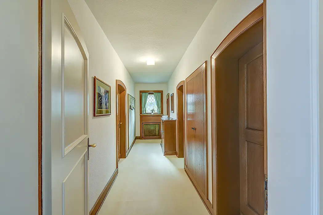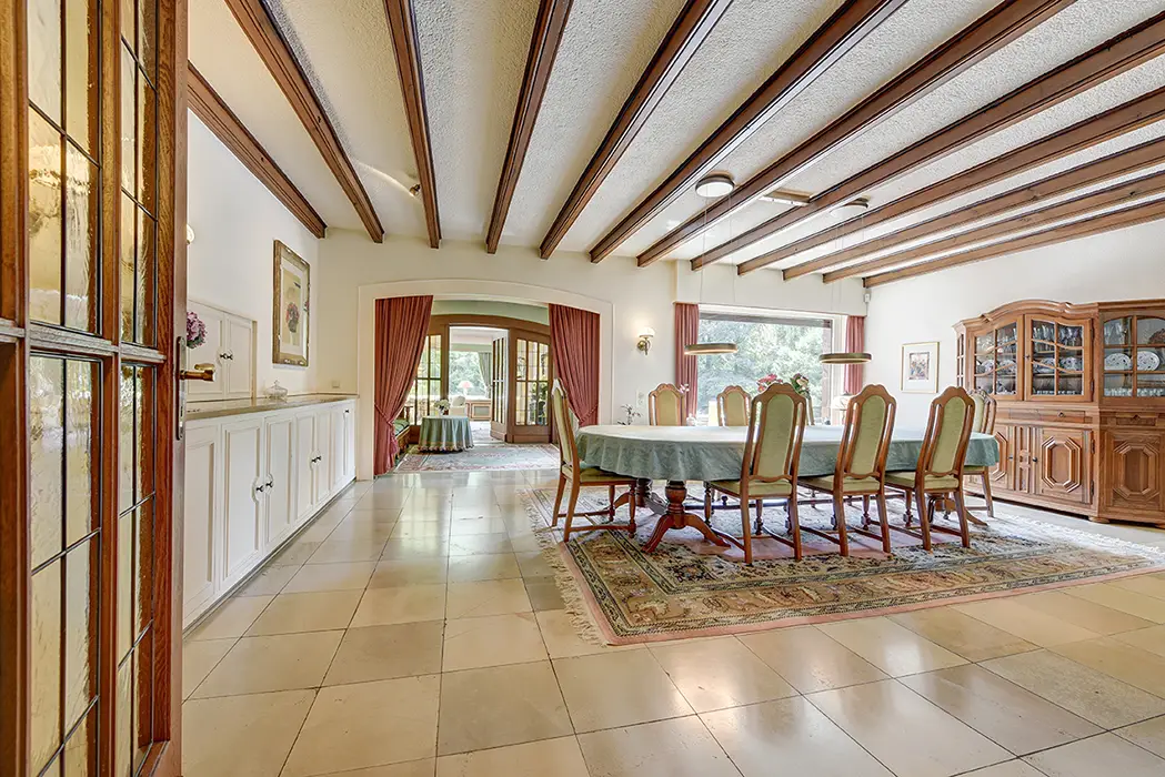 This spacious single-family home, built in 1954, sits on an impressive plot of approximately 5,860 m² and, with approximately 630 m² of living and usable space, offers ample space for individual lifestyles. The property is ideal for families who prefer living close to nature and value spatial diversity and privacy. The total area is divided into a total of 10 rooms, which, thanks to their attractive architecture and well-thought-out floor plan, offer flexible usage options. You will be warmly welcomed in the inviting entrance area, which offers ample space for a cloakroom and reception area. From here, you will access the various living areas, designed for spaciousness and offering numerous options for individual living ideas. The living space on the ground floor is approximately 241 m² and impresses with three spacious bedrooms, an extra-large living room with an adjoining piano room, a representative, spacious dining room, and a separate kitchen. In addition, there is a master bathroom with two showers and a sauna, as well as two separate guest toilets, which together offer first-class living comfort for the whole family. The oversized sun terrace is accessible from the hallway via the dining room. From the terrace, you can enjoy a magnificent view of the expansive garden and the adjacent forest. The garden boasts mature trees, numerous shrubs, and plants – ideal for creative landscaping. A pond at the rear of the property provides an additional, tranquil atmosphere. Adjacent to the property is a spacious garage with a basement, perfect for tradespeople and hobby gardeners. A toilet and another room offer additional comfort for every user. The attic is comfortably converted and offers approximately 165 m² of usable space. Here, you'll find ample space for your hobbies, or you can use it as a combined living and working area under one roof. Connections for a kitchen are available, and a modern bathroom completes the offering. The spacious garden offers a wide range of possibilities for individual design. It offers space for both play areas for children and quiet areas for relaxing hours in the fresh air. The size of the property also offers potential for ambitious garden projects. A spacious parking area in front of the garage is available for your vehicles. The property is located in a quiet residential area with good transport links. Shopping facilities, schools, and public amenities are easily accessible. The property is well-maintained, in keeping with its age, and offers scope for individual modernization options. The furnishings are also appropriate for its age, allowing for flexibility in design according to your wishes.Thanks to its size and versatility, this single-family home is ideal both as a long-term family residence and as a home for both living and working under one roof. Get a personal impression of the design options and see for yourself the exceptional space available during a viewing. We would be happy to provide you with further information and arrange a viewing appointment. Read more Location Description This property is located amidst picturesque nature, right on the edge of the forest. From here, beautiful walks and bike rides beckon. Grafenmühle, the Haniel spoil heap, the Gasometer, and Oberhausen Castle are all within easy reach by bike or car. The nearby town center of Königshardt offers numerous shops for daily needs. Schools and kindergartens are also nearby. Various restaurants and an ice cream parlor complement the dining options. A nearby bus line provides easy access to surrounding towns, while short journeys to the A3, A516, and A2 motorways offer additional convenience.