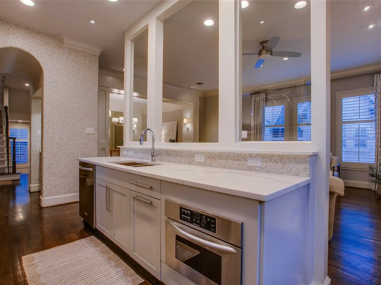 Nestled beneath mature oaks in one of Dallass most walkable pockets, this residence feels like a quiet retreat wrapped in the energy of Turtle Creek in SoHiP Neighborhood. Its stone-and-brick exterior, lantern lighting, and wrought-iron details set a timeless, welcoming tone that continues inside. Through the gated entry, a light-filled foyer opens to French doors leading to a private courtyard gardenlush with ferns, soft groundcover, and sculptural trees that create a rare moment of calm in the city. On the main living level, natural light moves across crisp millwork and dark hardwoods. The living room centers around a modern fireplace and transitions easily into a serene dining room shaped by warm neutrals and soft lighting. Arched openings and paneled details add texture and depth, giving every space a thoughtful sense of rhythm. The kitchen blends beauty and function with custom cabinetry, stone counters, mosaic tile, premium appliances, and a fully integrated butlers pantry. Framed openings keep it visually connected, allowing light and conversation to move naturally throughout the home. Upstairs, the primary suite offers a true sense of retreat with vaulted ceilings, a wall of windows, and a generous sitting area. The adjoining bath features layered stonework, a freestanding tub, dual vanities, towel warmer, and a walk-in showercrafted for restorative daily rituals. A nearby third bedroom perfect for an office provides dedicated space for work or creativity. A private first-floor guest suite adds flexibility and comfort for visitors or multigenerational livingan elevated alternative to the typical townhome layout, and an easy plan to add elevator. Throughout the home, thoughtful updates and careful maintenance reflect years of intentional stewardship. Just moments from Turtle Creek Park, the Katy Trail, cafs, and Oak Lawns dining and cultural scene, this residence blends architecture, comfort, and lifestyle into one beautifully considered experience.