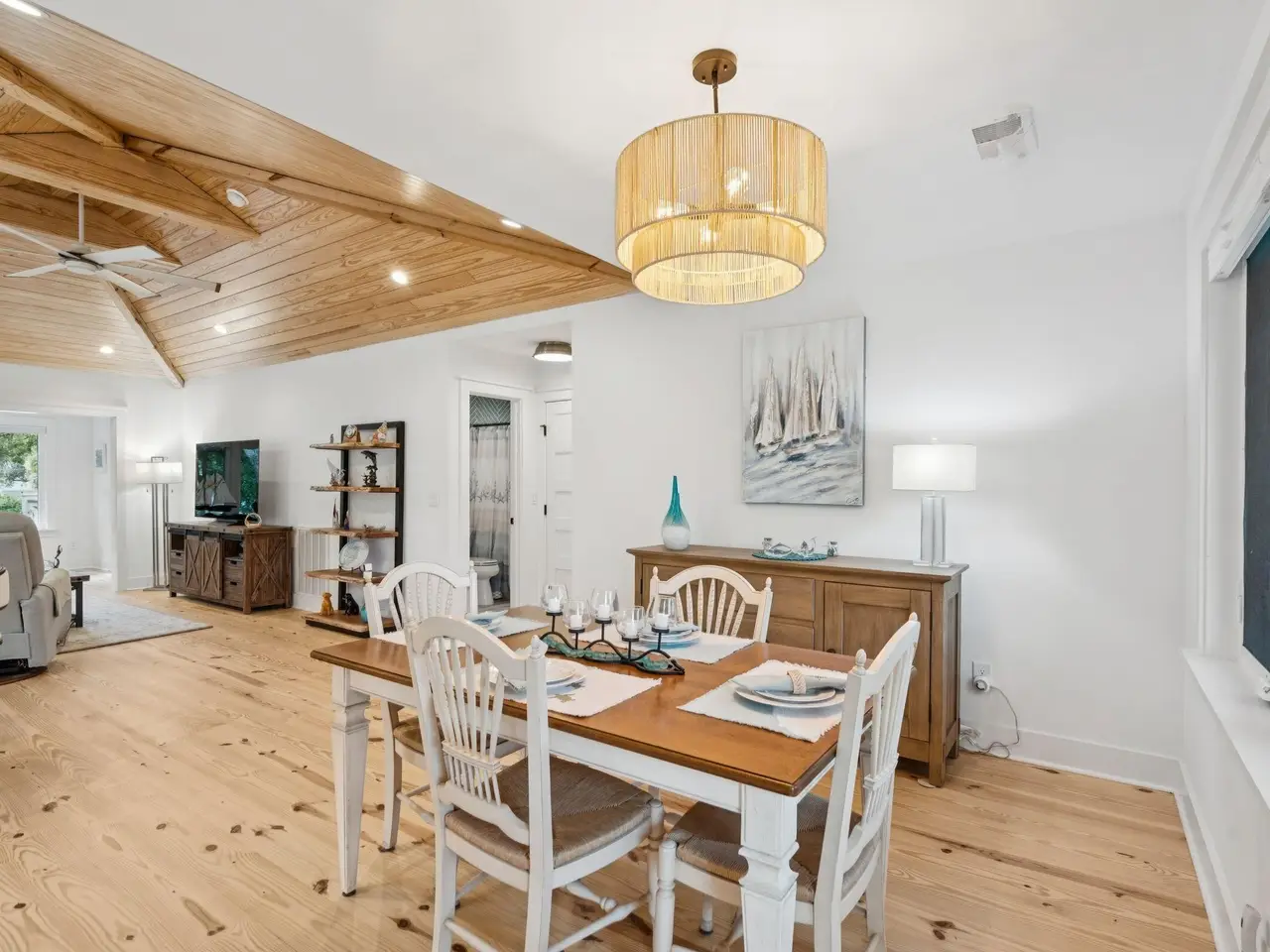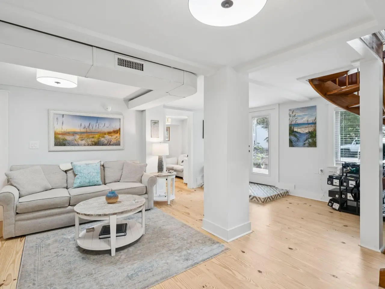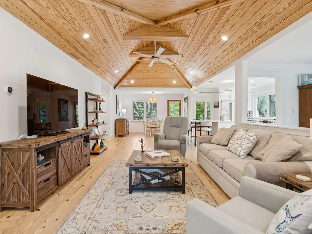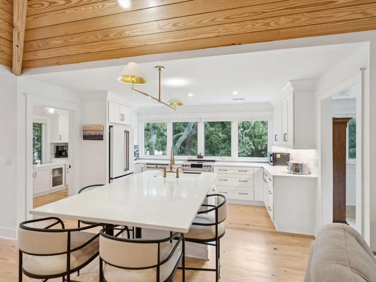 Experience the best of coastal living in this stunning and beautifully renovated beach cottage on the desirable south end of Isle of Palms. Located just two blocks from the beach access, this home has been meticulously updated from the studs out, ensuring modern comfort and peace of mind.Inside, the light-filled interior is a testament to sophisticated design. The open-concept main floor features beautiful new pine flooring and a vaulted pine ceiling in the living area, creating an airy and inviting atmosphere. The gourmet kitchen is a chef's dream, with a large island, custom cabinetry, quartz countertops, a Brizo kitchen faucet, and top-of-the-line GE Cafe series appliances, including a convection double oven.Main level includes a spacious primary suite with an en-suite bathroom, a guest bedroom, a full bathroom, and a large pantry for beach life entertaining. A beautiful wood spiral staircase leads to the lower level, which offers a versatile second living or play area, two additional bedrooms, and a large full bathroom. Outdoor living is a breeze with a large, private porch and a private outdoor shower. This wonderful home provides ample parking with six off street spaces and a one car garage. The home is equipped with new cement plank siding, impact-rated windows and doors, and new plumbing, electrical, and HVAC systems. Additional features include hurricane shutters, gutter guards, climate controlled storage room and new window treatments by Seaside Window Treatment. Only a short walk to island shops and restaurants and only a short drive to Downtown Charleston. This is an incredible opportunity to experience true beach life in the Lowcountry.