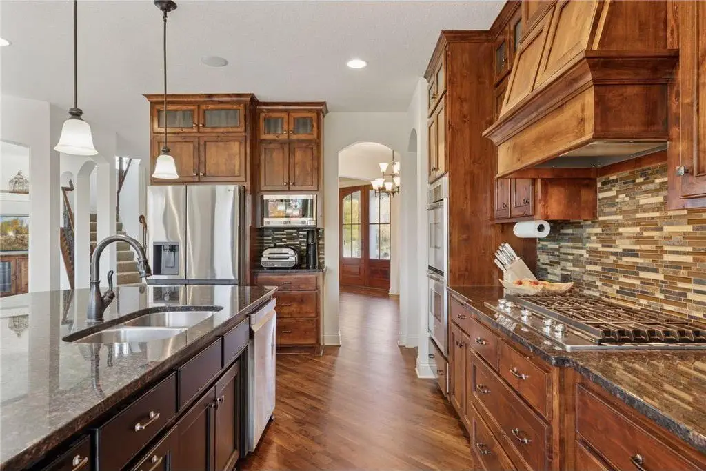 This exceptional North Oaks home offers timeless craftsmanship, luxurious finishes, and serene pond views - perfectly combining elegance & everyday comfort. Enter the main level to rich walnut wood floors that flow into the Great Room through graceful arched entryways. The Great Room features knotty alder built-in cabinetry, a stone-hearth gas fireplace, and tall windows overlooking the backyard & pond. A Sun Room & Informal Dining area flow seamlessly from the Kitchen, which boasts a large slate-gray island, knotty alder cabinetry, granite counters, stainless double oven, gas cooktop with commercial-grade hood, built-in microwave & a spacious walk-in pantry. The formal Dining Room includes a granite-topped enamel buffet set with a stunning arched niche, and a private Office offers knotty alder wood built-ins. Step out to the Deck off the Informal Dining area for outdoor living. Upstairs, you'll find four bedrooms include a luxurious Primary Suite boasting dual vanities, a soaking tub with pond views, large tiled walk-in shower with bench & double shower head, and a oversized walk-in closet. Bedrooms 2 & 3 share a Jack-and-Jill Bath with dual sinks and separate tub/toilet area; Bedroom 4 has its own private ¾ Bath. A spacious Laundry Room with sink & folding area completes the upper level. The finished walk-out basement is ideal for entertaining with a full Wet Bar featuring seating, granite counters, knotty alder cabinets & wine rack, Game/Billiard Room, Family Room with stone-hearth fireplace, an Exercise Room convertible to a 6th Bedroom, plus a 5th Bedroom & a Full Bath. The expansive, flat backyard opens to trees & pond vistas. Residents enjoy the Rapp Farm sub-association pool and pool house, plus North Oaks’ private walking trails, tennis courts, sports fields, parks, lakes & beach. Combining refined materials, flowing spaces, and exceptional craftsmanship, this home offers luxury living in a truly picturesque setting. Within Mounds View schools, too!