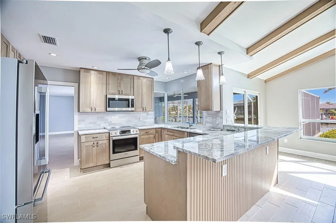 Welcome to your dream waterfront retreat on Sanibel Island! This stunning 3-bedroom, 2-bathroom ground-level home has been completely renovated, offering modern coastal elegance with a prime location. Situated on an elevated lot, this home stands higher than most ground-level properties, providing extra peace of mind while maintaining easy, step-free access. As you arrive, a charming white fence welcomes you, leading to a lush flower bed that frames the entryway, setting the tone for the beauty that awaits inside. The professionally landscaped yard enhances the home's curb appeal, creating a serene and inviting atmosphere. Inside, the spacious layout is perfect for both relaxation and entertaining. The living room, dining room, and TV room/den are thoughtfully separated from the bedroom wing, offering privacy and a great flow for hosting guests. A wood-burning fireplace adds warmth and charm, creating a cozy ambiance on cooler island nights. The kitchen features a breakfast bar and a pass-through window to the outdoor bar, making it easy to serve drinks and meals while enjoying the outdoor space. The primary suite is a private retreat, featuring his-and-hers closets for ample storage. The additional bedrooms are well-appointed, offering comfortable accommodations for family or guests. Step outside to a true backyard oasis. The enclosed lanai provides both shaded areas and sun-drenched spaces, making it perfect for year-round enjoyment. Beyond the lanai, a large pool is surrounded by beautiful slate tile, adding a luxurious touch to this serene setting. Enjoy breathtaking views of the manatee- and dolphin-filled canal as you relax by the water. Boating and wildlife lovers will appreciate the direct water access, while beach enthusiasts are just minutes from Sanibel's world-famous shelling shores. Located in a sought-after area, this home offers easy on-and-off access to the Sanibel Causeway, making island living convenient while keeping you close to shopping, dining, and mainland amenities. Whether you're seeking a full-time residence, vacation getaway, or investment opportunity, this canal-front gem has it all! Don't miss the chance to own a piece of paradise.