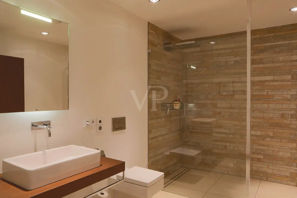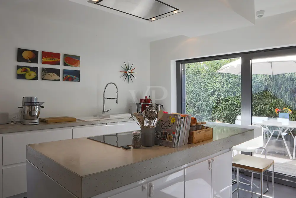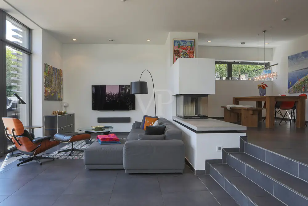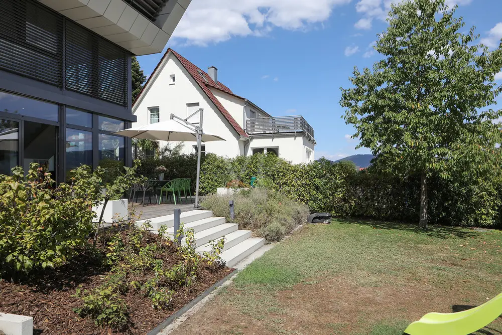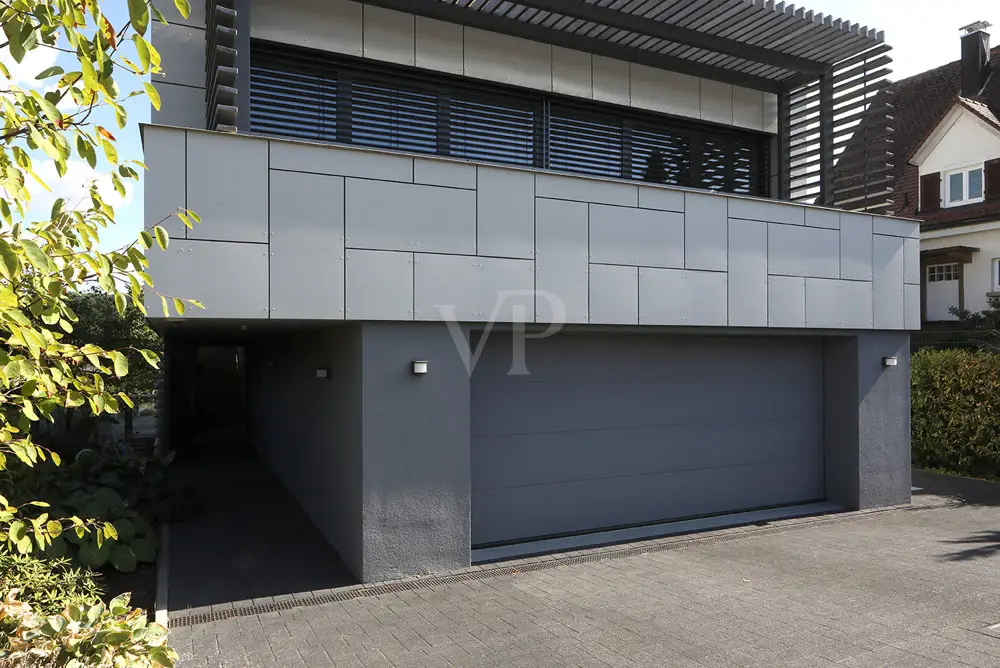Unique architect's house in a top location in Gaggenau. Dreamlike jewel, with approx. 320 m² of living space and fantastic views, offering you and your family luxurious and peaceful living. But also the opportunity to work in the office in a quiet location. The luxurious standard is reflected in the attention to detail. There are numerous exclusive special features and high-quality detailed solutions that make this property unique. Starting with the room-high glass fronts with triple glazing as windows and as doors to the terrace, high-quality exterior blinds, hardwood flooring on the terraces, large-format stoneware on the ground floor, controllable lighting system with downlights embedded in the ceiling throughout the house. Open fireplace as one of the highlights in the living/dining area. A high-quality kitchen with Gaggenau appliances and outdoor terrace directly in front of the kitchen. Extravagant wooden floorboards on the upper floor. Studio with adjoining spacious and sunny roof terrace. Large fitness room with saunas and associated wet/sanitary area. The house has a total of 3 floors and a basement. In the basement you will find the technical and storage rooms as well as a utility room. There is also a bright and spacious fitness area, which could easily be designed as a private gym with saunas and the corresponding wet rooms. You can access the first floor via the sheltered and covered entrance area or through the large double garage into a separate hallway area which leads you through the hallway to the kitchen or down the stairs to the basement. On the first floor, you enter the spacious and very bright living and dining area through the vestibule, with two levels, the open fireplace as a room divider and direct access to the south-facing terrace. The open kitchen to the dining area leaves nothing to be desired and is equipped with Gaggenau appliances. In front of the kitchen you have a spacious terrace which you can also access from the kitchen. The staircase takes you to the 1st floor with the enclosed area of the master bedroom, the dressing room and the associated bathroom en suite. There are also two further large rooms on this level with their own balcony, a bathroom, a further utility room and a large open space. The large studio with loggia and fantastic views can be reached via the hallway and staircase. This studio is currently used as a private office space. Directly adjacent to the studio is the very large roof terrace with storage rooms, water connections etc. This terrace invites you to treat yourself to an undisturbed sunbath or to enjoy the sunset. The entire property is fenced, in the area facing the quiet residential street with a large wall and the electrically operated access gate and in the remaining area the property boundaries are secured and overgrown with a hedge. The south-facing terrace is covered with wooden planks and extends across the entire width of the house and, like everything else, is generously proportioned. Steps lead up to the lawned part of the garden. This description is only an excerpt. Only a personal viewing will allow you to fully experience the charm and quality of the property and discover many other details.