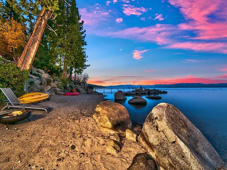 Amazing Rubicon Lakefront with a private sandy cove and one of the few houses to still have a sandy beach even during high water years. Zodiac to be included in sale for boat taxiing! SELLER FINANCING AVAILABLE AND PROPERTY TRADE OPTION available if you have something that suits seller's needs! This custom-built mountain-style lakefront lodge truly encompasses Lake Tahoe, living in a more pure and genuine capacity than measurable. A once in a lifetime opportunity. Escape from the hustle and bustle of the outside world and indulge in a gathering place that is anxiously awaiting for you to kick-back, relax, reconnect, and smell that mountain air. Feel life giving water, and get back to what's really important. Located on the awe-inspiring, iconic West Shore of Lake Tahoe, this private sanctuary truly embraces the serenity of its surroundings. Perfectly situated on a pristine white sand beach cove, protected from the elements by rock jetties at each end, you can truly indulge in the seclusion and privacy this property provides and soak in the infinite benefits of this natural paradise. Built with unparalleled craftsmanship and attention to every last detail, this custom-built mountain-style lodge offers a truly elevated living experience. Prepare to be captivated by sweeping vistas of both the lake and mountains from almost every room. Featuring four ensuite bedrooms, a lakeview den with fireplace, bunk room, family room, and a massive, jaw-droppingly stunning great room, this property was meticulously designed to create an exceptionally comfortable living space allowing for effortless entertaining all the while, providing plenty of privacy. The breathtaking foyer graced with durable walnut flooring overlooks the great room’s soaring vaulted ceilings with grandiose fir trusses and warmly embraces you with a luxurious yet leisurely feel. An exquisitely custom staircase adorned with hand-forged metal railings leads down to the well-appointed chef's kitchen, featuring stainless steel Viking appliances and elegant fixtures that overlook the crystal clear waters of Lake Tahoe. The great room is open and welcoming. Complete with a custom-built pewter bar, handcrafted in Portugal and a massive granite fireplace, this spacious yet cozy gathering place is where cherished memories are waiting to be made. Simplicity is key to lake and mountain life alike, and the Lutron lighting system that brilliantly illuminates every corner with just a touch of a button certainly helps keep things easy. Travertine in-floor hydronic heating adds to the list of the many thoughtful amenities and the custom hardware throughout adds so much character, giving this gorgeous lakefront lodge a sense of sophistication and class. Finally, retreat to the primary suite, which boasts a granite fireplace, walk-in closet, and spa-like bathroom with shower stall and soaking tub, allowing you to unwind and marvel at those captivating turquoise Tahoe waters after a long day of playing outside. Enjoying the lake is of course #1 and with 4 buoys (2 permitted) and you can have all the lake toys you've always dreamed of, accessible via your own PRIVATE white sand beach cove! Attention to every single detail offers as much heartwarming comfortability as it does extravagance. It's Tahoe, it's family, it's friends, it's captivating, it's magical and it's absolutely priceless. Property is part of the optional Rubicon Tahoe Owner's (RTO-South Beach) HOA. The HOA provides beach access, shared pier, buoy rentals, water sport equipment storage (i.e., paddleboards and kayaks), and a volleyball court.