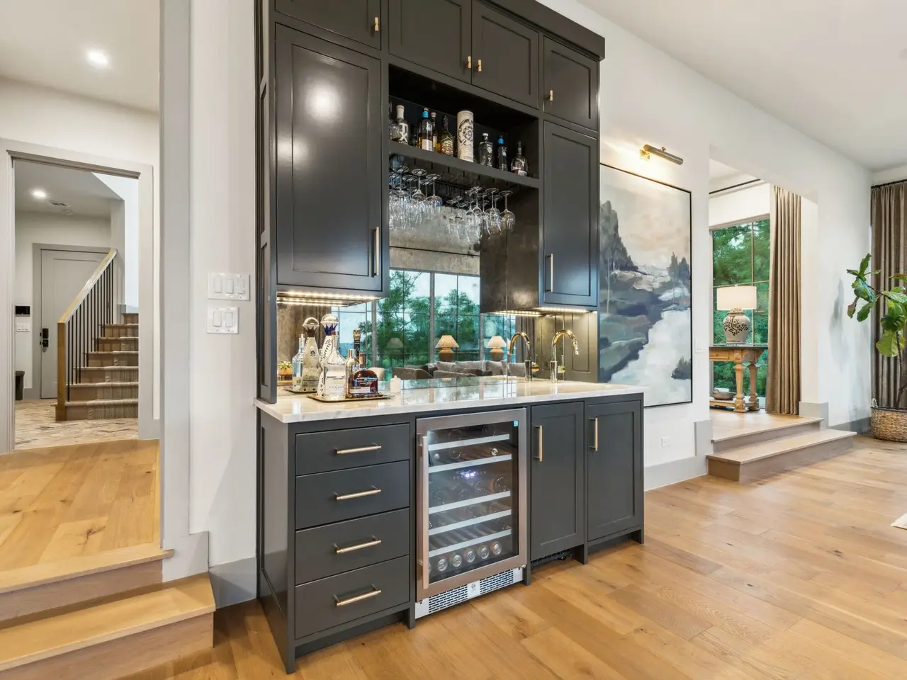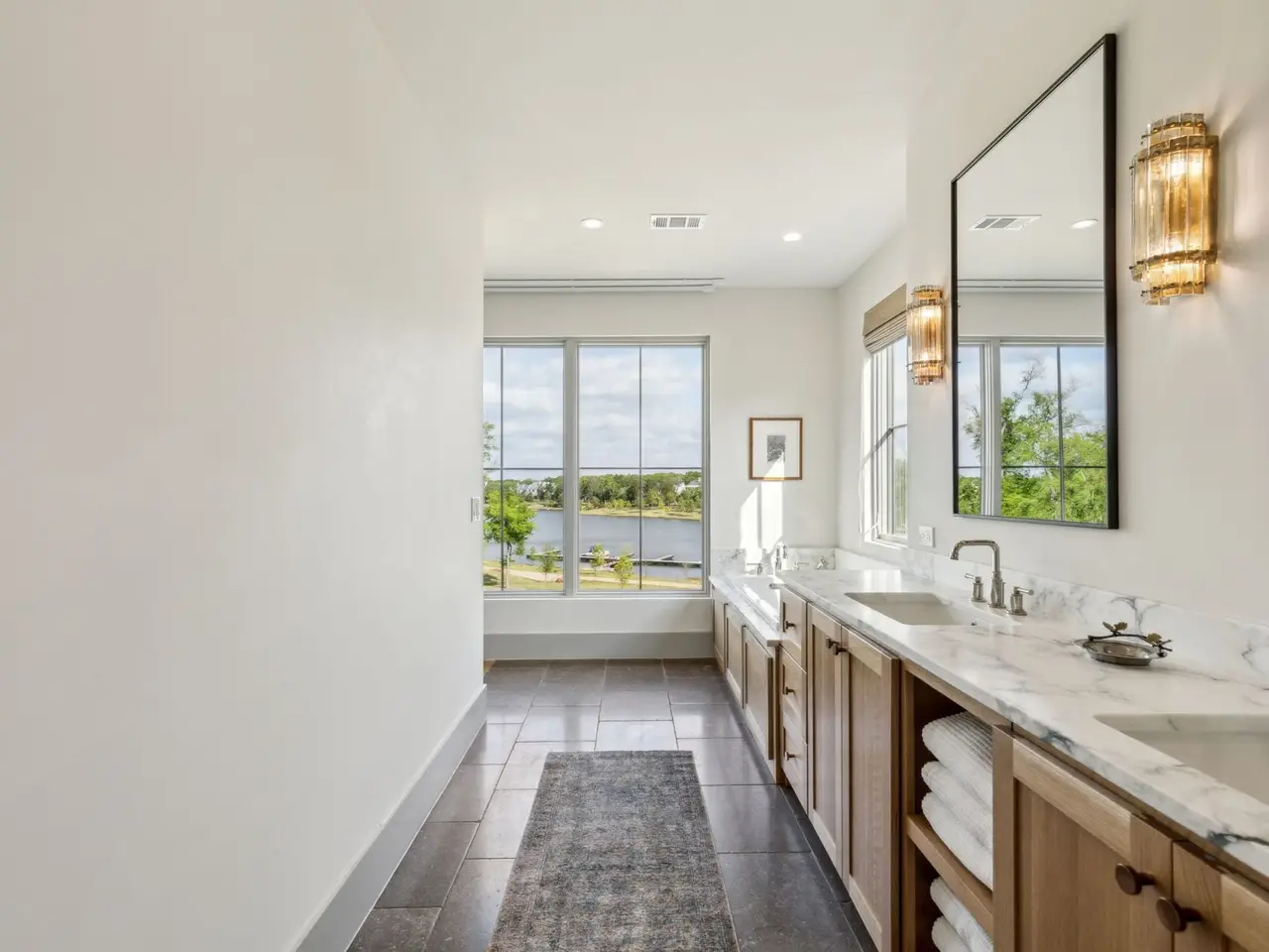 Tucked beneath a canopy of trees on a premium oversized lakefront lot in Long Cove, 13160 Woodsy Way blends luxury, comfort, and privacy in a beautifully designed retreat. With over 4800 square feet, plus additional bonus space above the garage, this custom oasis offers stunning lake views and direct access to the shoreline trail, perfect for long walks or golf cart rides. The open-concept layout connects expansive indoor and outdoor living spaces. A premium sound system runs throughout the home, including the large upstairs game room and covered outdoor porch with motorized screens, outdoor wood-burning fireplace, and built-in patio heaters, perfect for year-round entertaining. Gather around the outdoor fire pit or soak in the views from the sunning deck, all framed by a professionally designed landscape. Inside, the chef's kitchen features Taj Mahal quartzite countertops, premium appliances, custom cabinetry, a spacious walk-in pantry, and a large island ideal for entertaining. A marble-clad primary bathroom, Providence Lane custom drapery and window shades, Visual Comfort lighting, and a two-office setup, including one with incredible lake views, elevate the lifestyle even further. Each of the additional four large bedrooms features its own en-suite bathroom, with one bedroom designed as a bunk room accommodating two California King beds and two twin beds. Practical elegance continues with a spacious mudroom, custom cubbies, and herringbone brick flooring. An outdoor breezeway is designed to hold two golf carts and connects the home to a two-car garage and carport, and turfed dog yard for furry friends. Peace of mind comes built-in with full exterior video monitoring, lightning rods, a whole-house water filtration system, and a backup generator. Whether you're looking for the perfect weekend escape or a forever home, 13160 Woodsy Way delivers resort-style living in a private, wooded setting just steps from the lake.