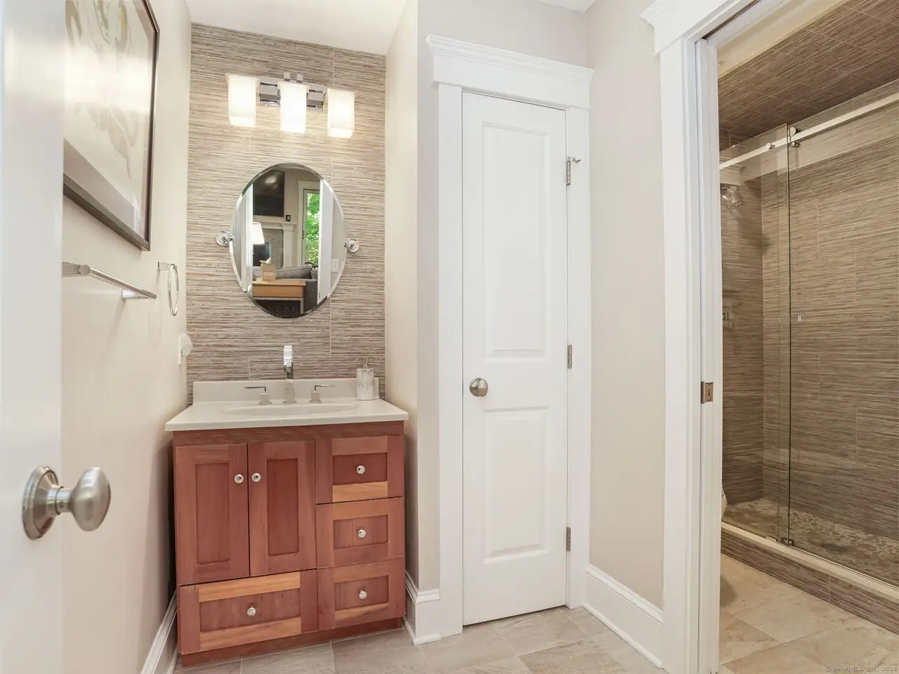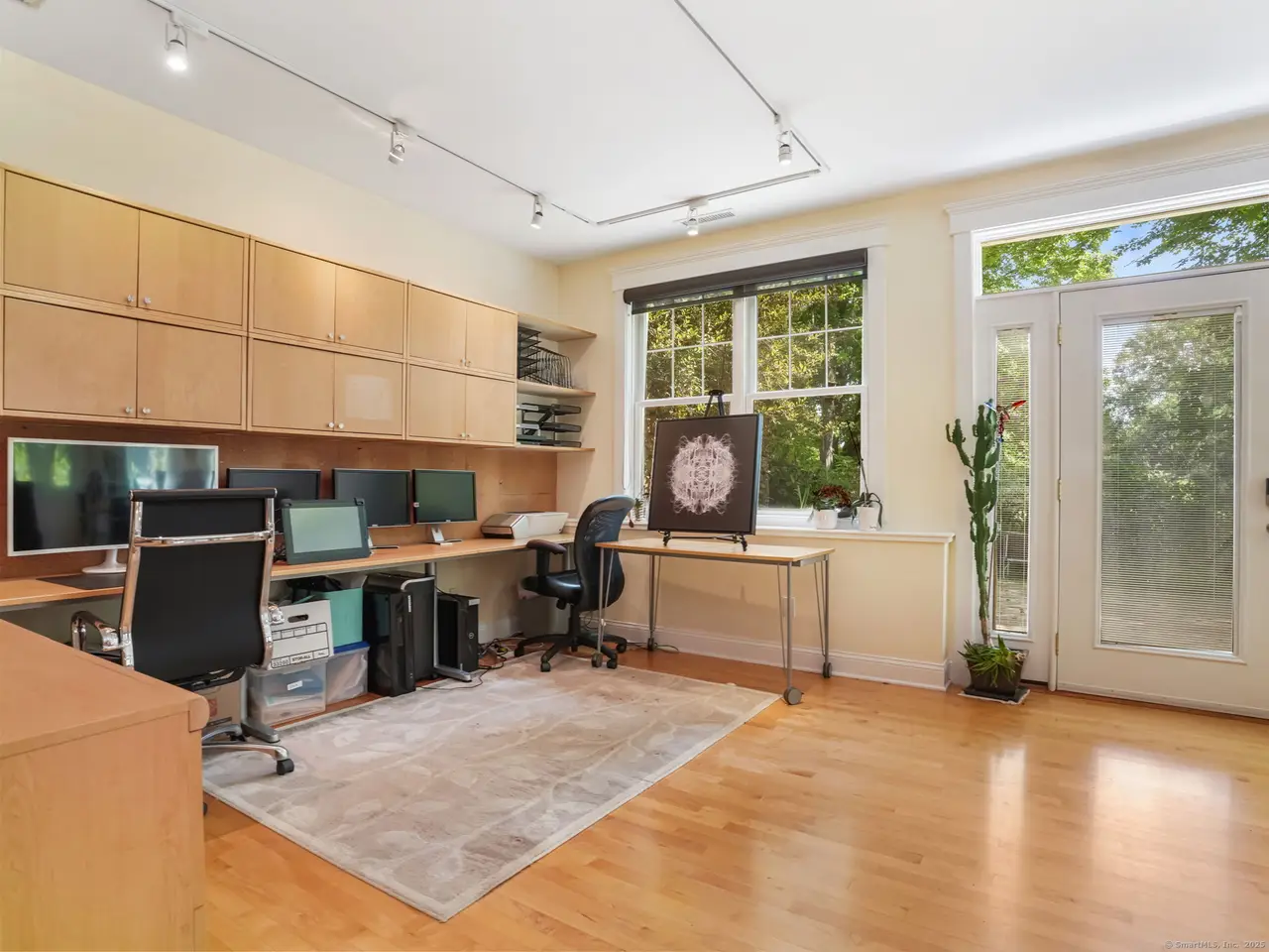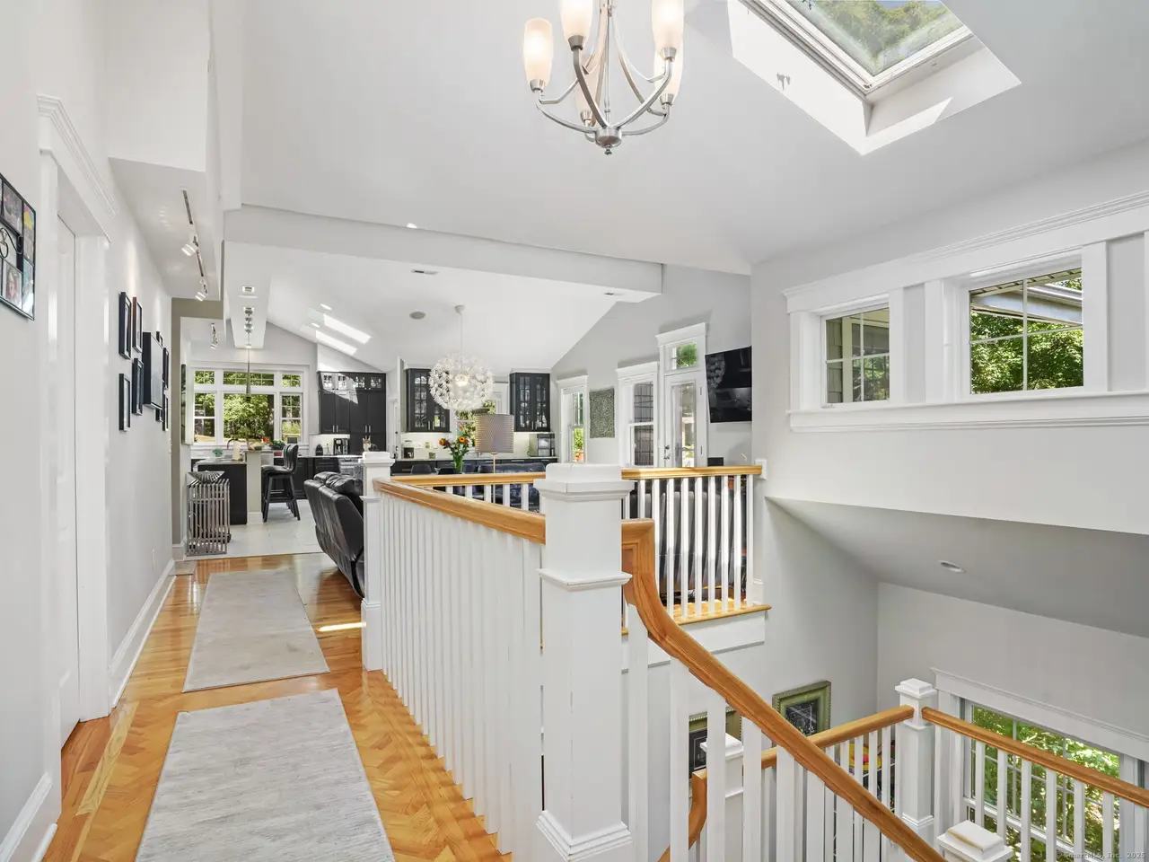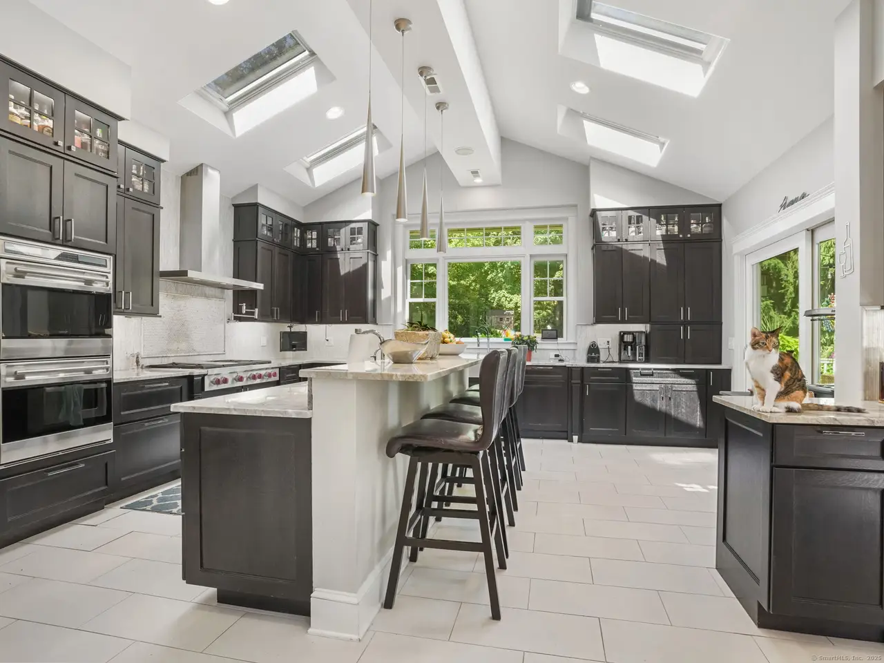 A stunning architecturally designed custom home located in the desirable Porter's Hill section of Trumbull & within the Daniels Farm Elementary School District. Conveniently close to schools, parks, shopping, restaurants, & highways, this commuter's dream offers 7 to 8 bedrooms & 6 full bathrooms, each finished with high-end tile, fixtures, and amenities.Professional audio system throughout. The impressive 2-story foyer with open staircase sets the tone for a sun-filled interior highlighted by skylights, unique lighting, and custom pendant lighting. The gourmet kitchen is equipped with Wolf appliances including a gas cooktop, double ovens, warming drawers, Sub-Zero refrigerator, wine chillers, and three sinks, high end Brazilian Quartzite countertops all complemented by custom cabinetry. The home features a cedar sunroom with a full-size Thermo-spa hot tub, a spacious mudroom with built-ins and shelving, and an expansive 25x25 foot walk-out office with a full bath that can also serve as an au pair, or in-law. The primary suite offers cathedral ceilings, built-in bookcases, a fireplace, surround sound, and a luxurious bathroom with a steam shower, whirlpool tub, double vanities, and decorative tile. Outside, the property has been professionally landscaped by a landscape architect with specimen trees, lavender walkway, and an oversized Trex deck, creating a private, tranquil, and breathtaking outdoor oasis that perfectly complements this extraordinary home.