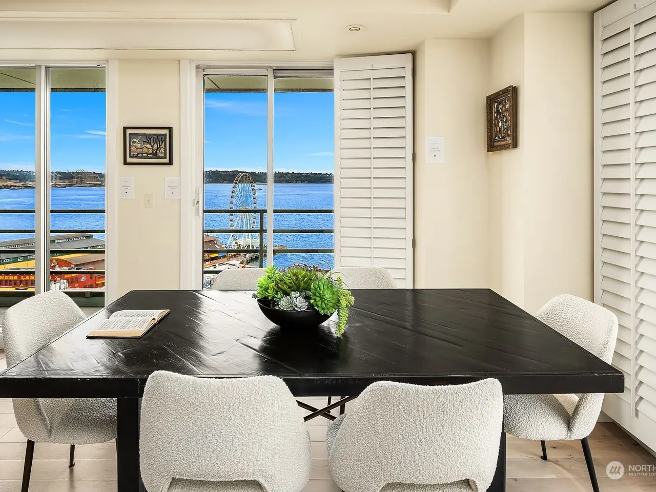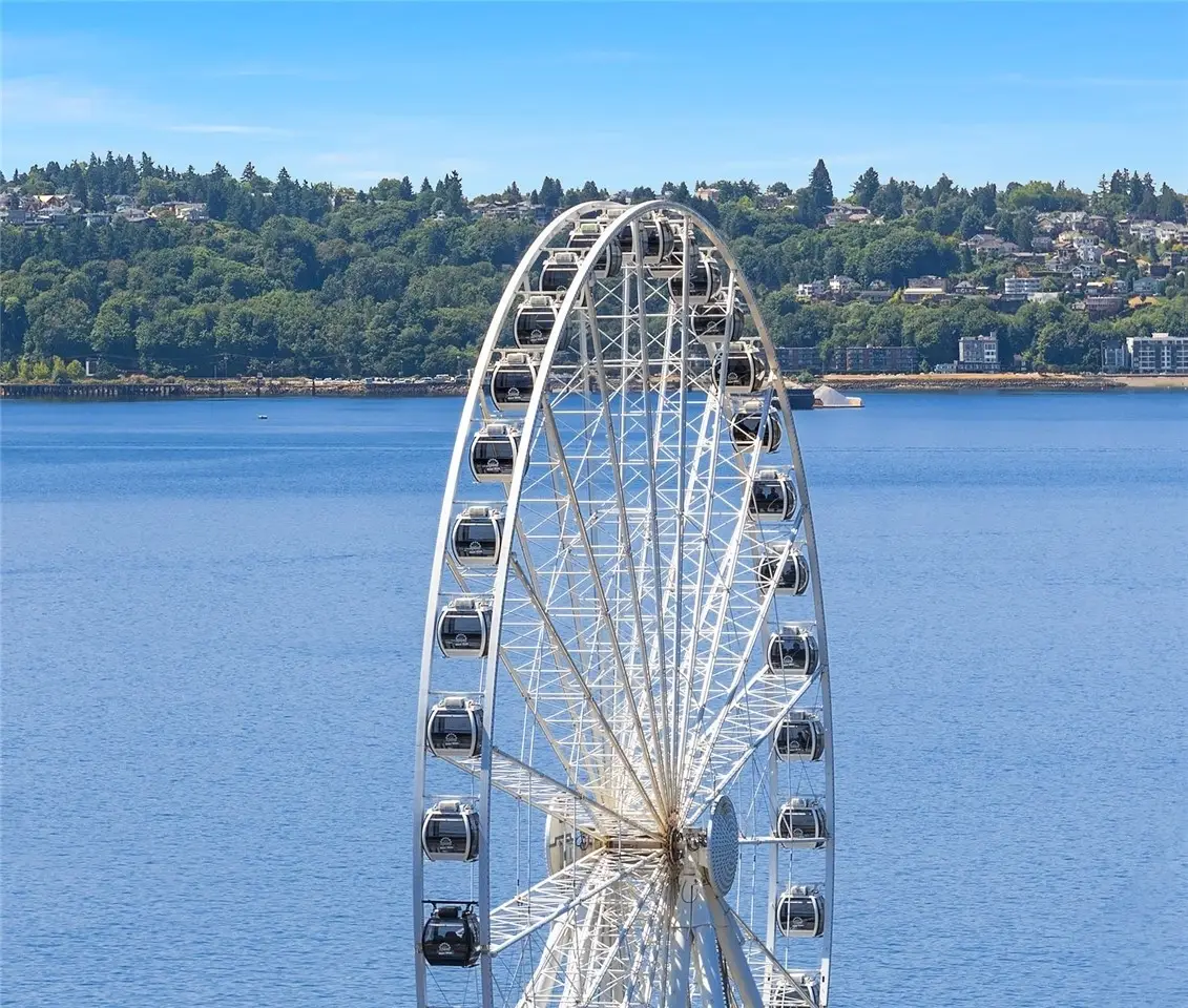 Live luxuriously front & center above it all. Updated & re-launched, this home floats elegantly above the Wheel & the exciting new Waterfront. Spacious 3-BR home w/ serenity & seclusion. 2 units combined along the entire western span of this luxury concierge building. Wrap-around patios present unobstructed views of Elliott Bay, Olympic Mtns & striking sunsets. Each space in this U-shaped unit conveys comfort & smart design. Formal entry presents ample wall space for art enthusiasts & a great first impression. Walls of windows welcome light. Built-ins & closets provide generous storage. Kitchen/family rms gaze north to Pike Place Mkt. 2 pkg spaces & storage. Close to SAM, Four Seasons for dining or spa visits, Benaroya Hall & the Market.