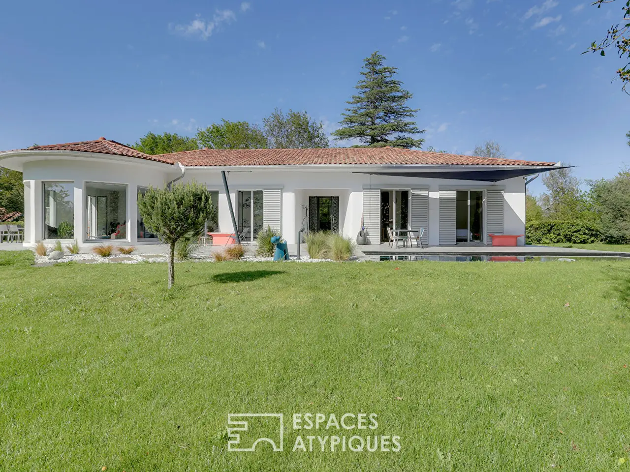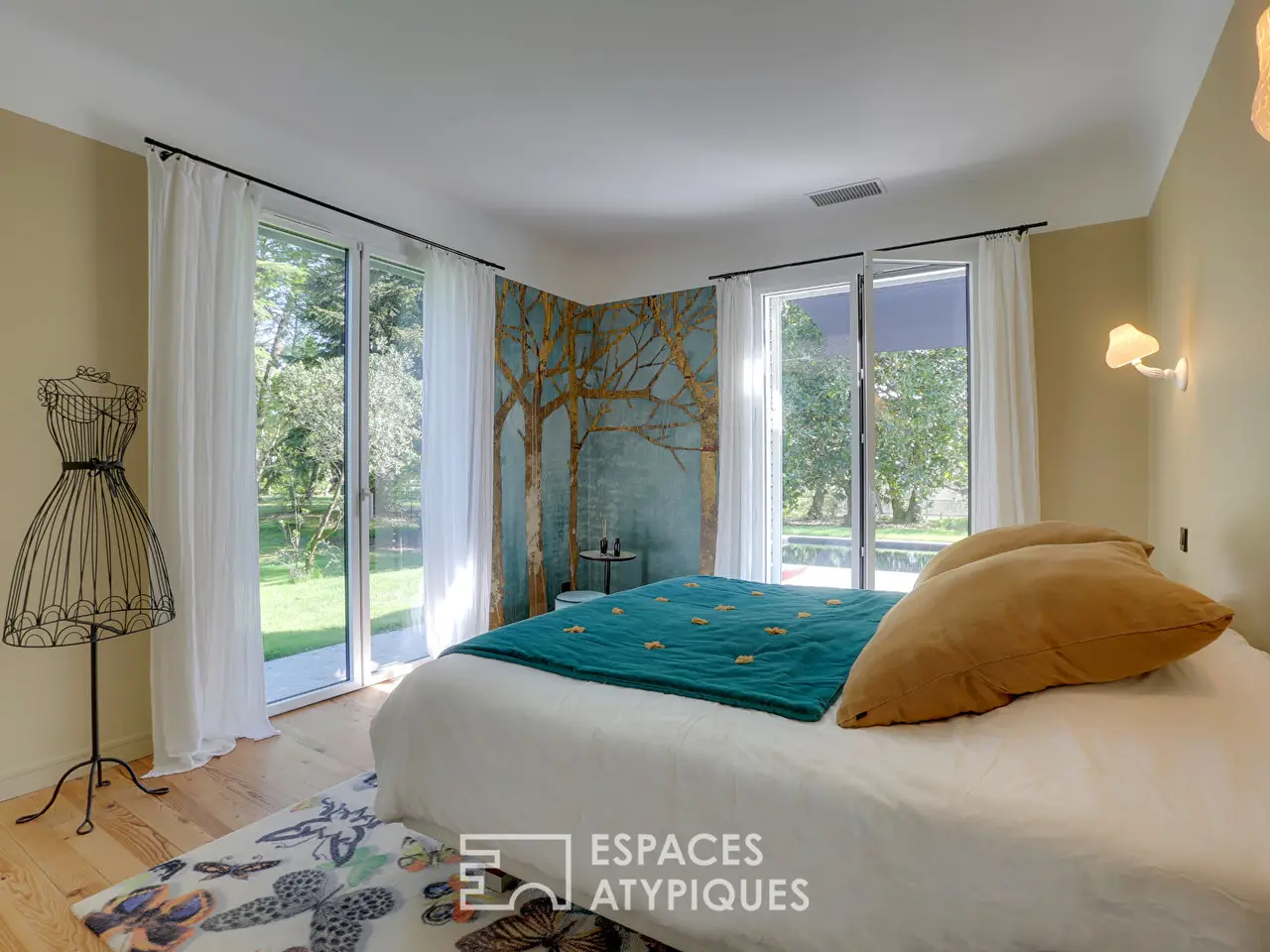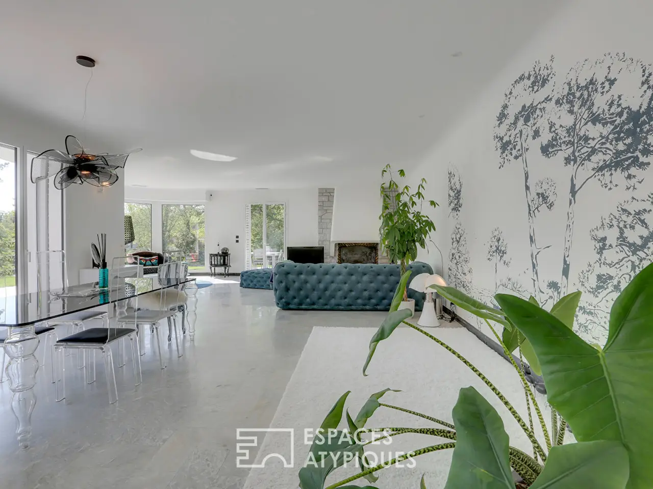 In a peaceful setting, close to Lake Leon, this 1960s house underwent a complete renovation in 2023, orchestrated by an architect. Built on one level on a landscaped plot of over 2,300 sqm, it benefits from a preserved environment thanks to the presence of adjoining natural areas. The facade with its retro-chic charm and its ornate front door announce the unique character of the place, combining contemporary elegance and living comfort. The entrance leads to a vast living room bathed in light, organized around a welcoming lounge with a stone fireplace, and a generous dining area. The clean lines and the choice of soft colors create a refined atmosphere. The custom-made kitchen, with its resolutely modern design, is thought out down to the smallest detail to combine elegance and functionality. It is distinguished by its textured matte fronts, its marble-effect worktop, and its integrated equipment. The layout optimizes the fluidity of movement: four independent and welcoming bedrooms each have their own bathroom. Outside, the wooded garden surrounds the house and hosts a swimming pool perfectly integrated into its environment. Several relaxation areas allow you to fully enjoy the Landes climate. A double garage optimizes the practicality of the place. The land is landscaped to guarantee privacy and calm. The complex is located in a sought-after residential area, just a few minutes from Leon's shops, schools and access to the beaches of the Atlantic coast. This house with undeniable charm stands out for its architecture, its natural light and its volumes which make it a place full of character. ENERGY CLASS: C / CLIMATE CLASS: A Estimated average amount of annual energy expenditure for standard use, established from 2021, 2022 and 2023 energy prices: between 2040 euros and 2810 euros. Contact: Magali MALBEC at 06 77 52 99 54 RSAC: 490 450 723- DAX REF. 10753EALD Additional information * 6 rooms * 4 bedrooms * 4 shower rooms * Outdoor space : 2314 SQM * Parking : 3 parking spaces * Property tax : 1 960 € Energy Performance Certificate Primary energy consumption c : 133 kWh/m2.year High performance housing