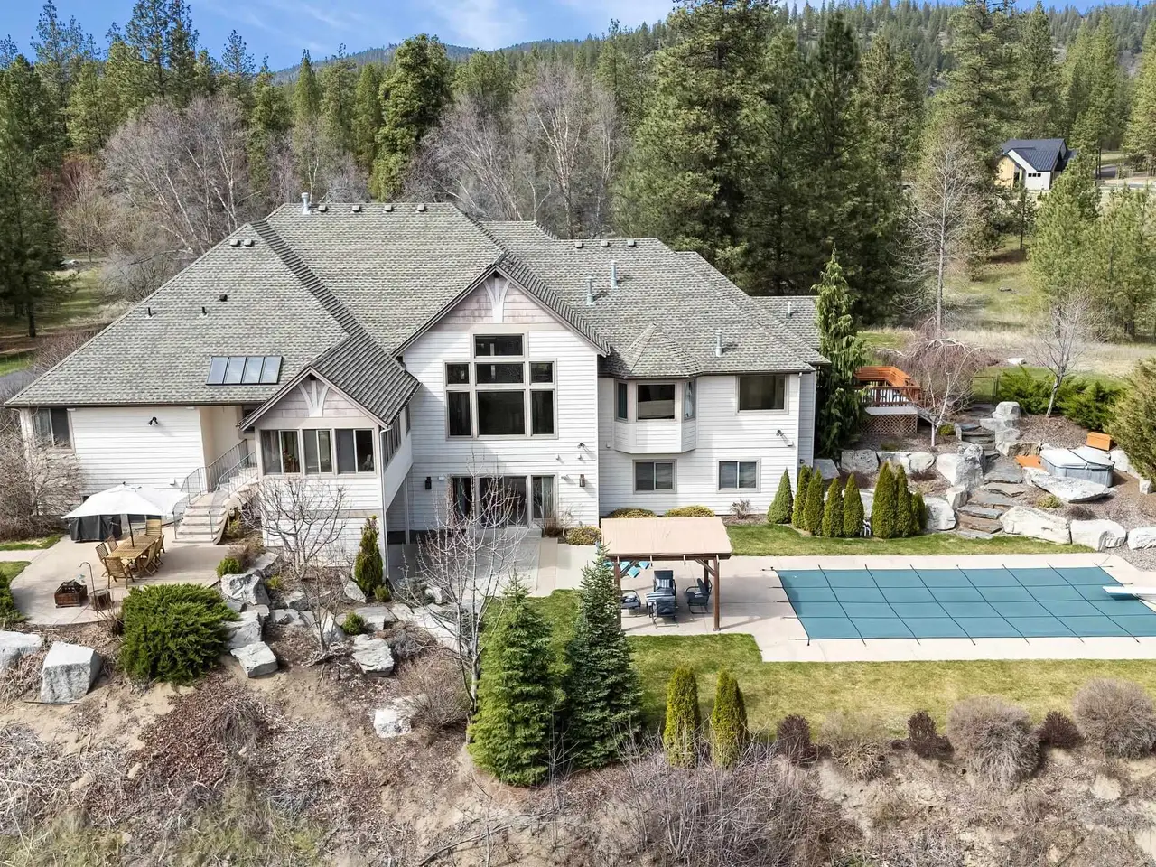 Located on over 10 spectacular acres behind the gates in exclusive Riverbluff Estates, the location + setting of this exquisite, custom Craftsman is private + serene, yet shopping, restaurants, St. George's School, the Little Spokane River Natural Area + Kalispel Golf + Country Club are only minutes away. Amenities include a beautiful open floor plan, generously appointed rooms, vaulted ceilings w/exposed beams, natural stone fireplaces + accents, spacious island kitchen, luxurious primary suite, sun room, fully finished lower level, private backyard space with patio, in-ground pool + hot tub, and room for a shop. Home comes equipped with all of the expected features of a home in this class, and the lower level could function easily for multi-generational living. This is a truly spectacular property!