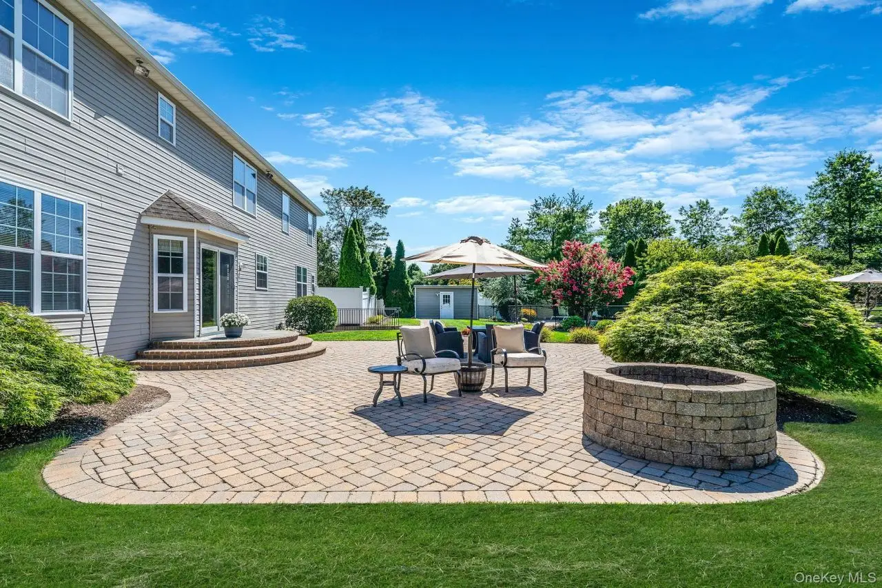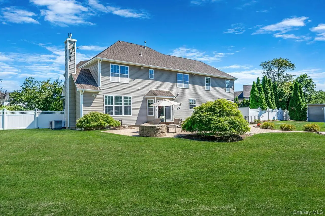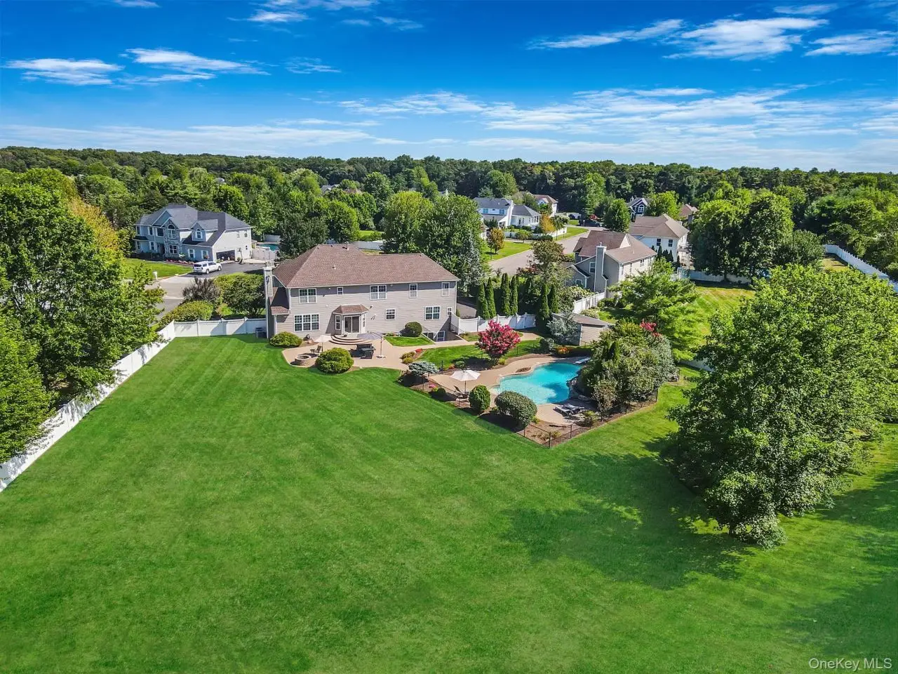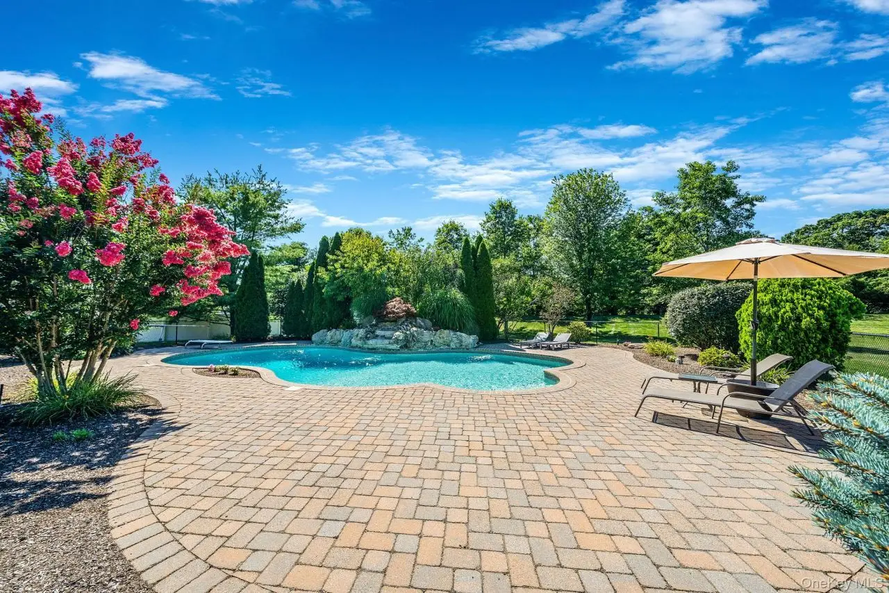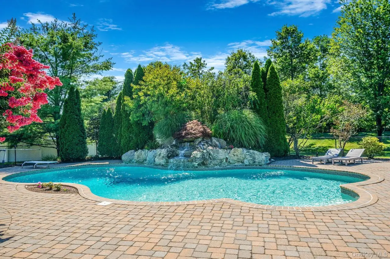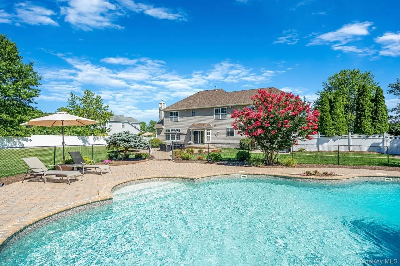Set on a premium 1.25-acre parcel in Country Manor Estates, this post-modern colonial blends everyday comfort with resort-style outdoor living. Approximately 3,672 square feet above grade with a sunlit, open flow: a 2023 designer kitchen with custom cabinetry, full-height granite backsplash, built-in refrigerator, double wall ovens and center island opens to the breakfast area and great room. Formal living room with gas fireplace and a separate dining room; a full main-floor guest/au-pair suite adds flexibility. Two-story foyer, rich millwork and hardwood floors throughout. Upstairs, the primary retreat offers two walk-in closets and a spa bath with Jacuzzi tub, glass shower and dual vanity, plus four additional bedrooms, an updated hall bath and convenient laundry. Outside, a new driveway (2022) leads to paver walkways and an expansive patio overlooking the free-form waterfall pool-liner 2018, new gas heater 2024-framed by mature landscaping and fencing. The walk-out lower level provides a wet-bar lounge, recreation/media zones, a bath and direct patio access for easy indoor-outdoor living. Major updates: new architectural roof 2024, full HVAC replacement 2021, 200-amp electric, central vacuum, full irrigation; natural gas, public water, cesspool. Shoreham-Wading River Schools and a quiet cul-de-sac setting close to beaches, parks and village conveniences.