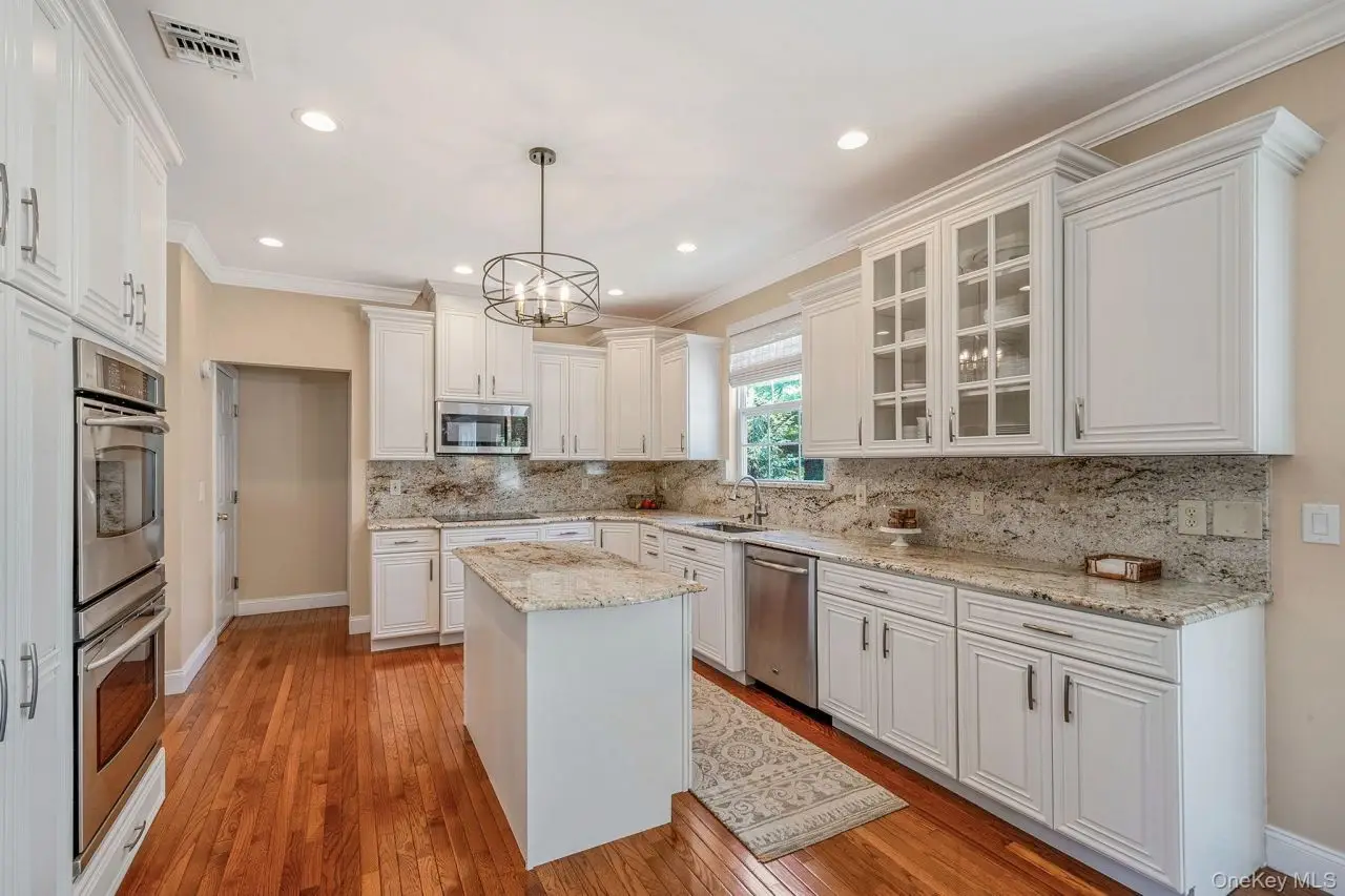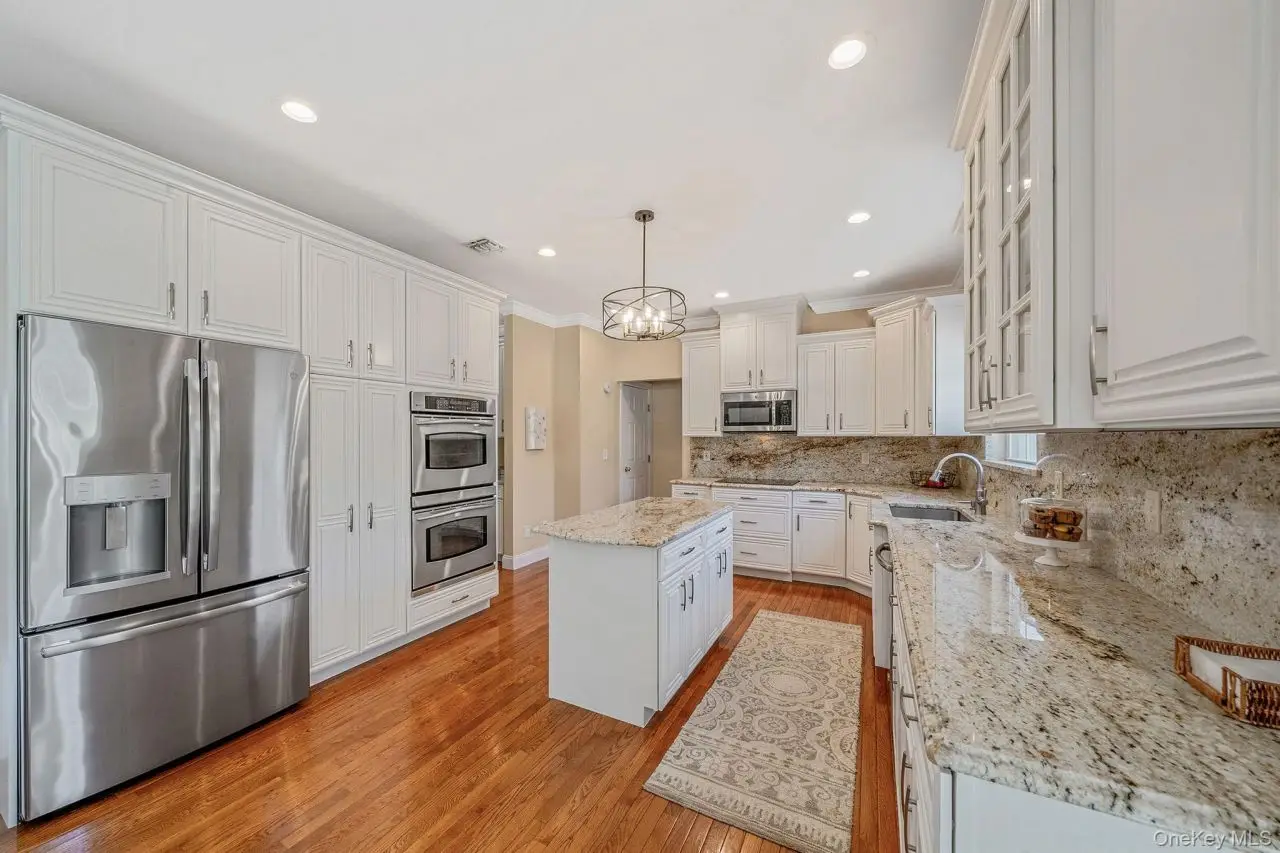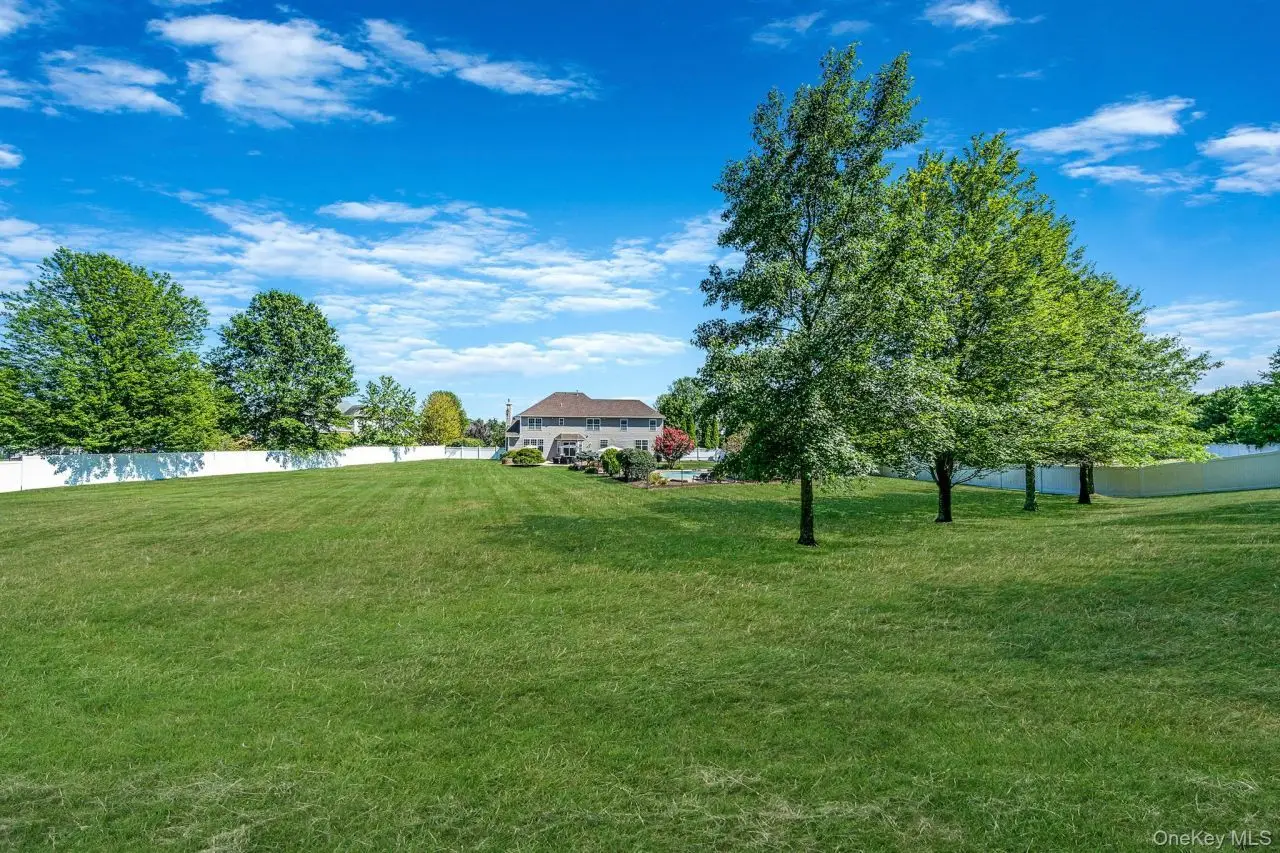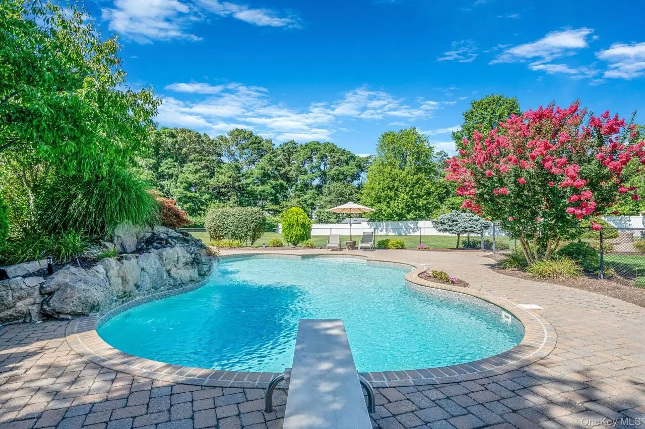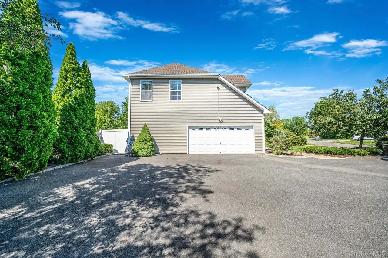 Set on a premium 1.25-acre parcel in Country Manor Estates, this post-modern colonial blends everyday comfort with resort-style outdoor living. Approximately 3,672 square feet above grade with a sunlit, open flow: a 2023 designer kitchen with custom cabinetry, full-height granite backsplash, built-in refrigerator, double wall ovens and center island opens to the breakfast area and great room. Formal living room with gas fireplace and a separate dining room; a full main-floor guest/au-pair suite adds flexibility. Two-story foyer, rich millwork and hardwood floors throughout. Upstairs, the primary retreat offers two walk-in closets and a spa bath with Jacuzzi tub, glass shower and dual vanity, plus four additional bedrooms, an updated hall bath and convenient laundry. Outside, a new driveway (2022) leads to paver walkways and an expansive patio overlooking the free-form waterfall pool-liner 2018, new gas heater 2024-framed by mature landscaping and fencing. The walk-out lower level provides a wet-bar lounge, recreation/media zones, a bath and direct patio access for easy indoor-outdoor living. Major updates: new architectural roof 2024, full HVAC replacement 2021, 200-amp electric, central vacuum, full irrigation; natural gas, public water, cesspool. Shoreham-Wading River Schools and a quiet cul-de-sac setting close to beaches, parks and village conveniences.