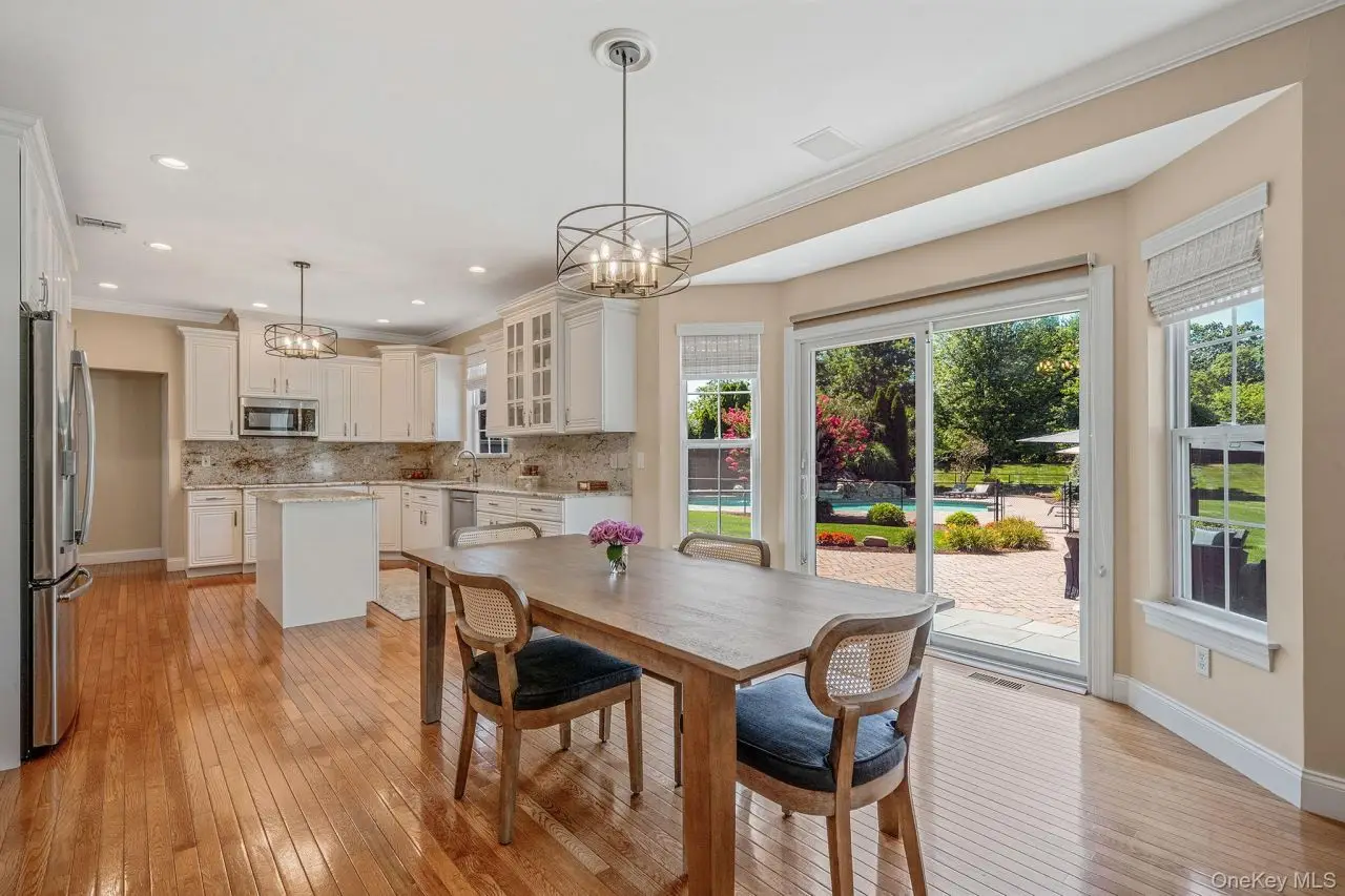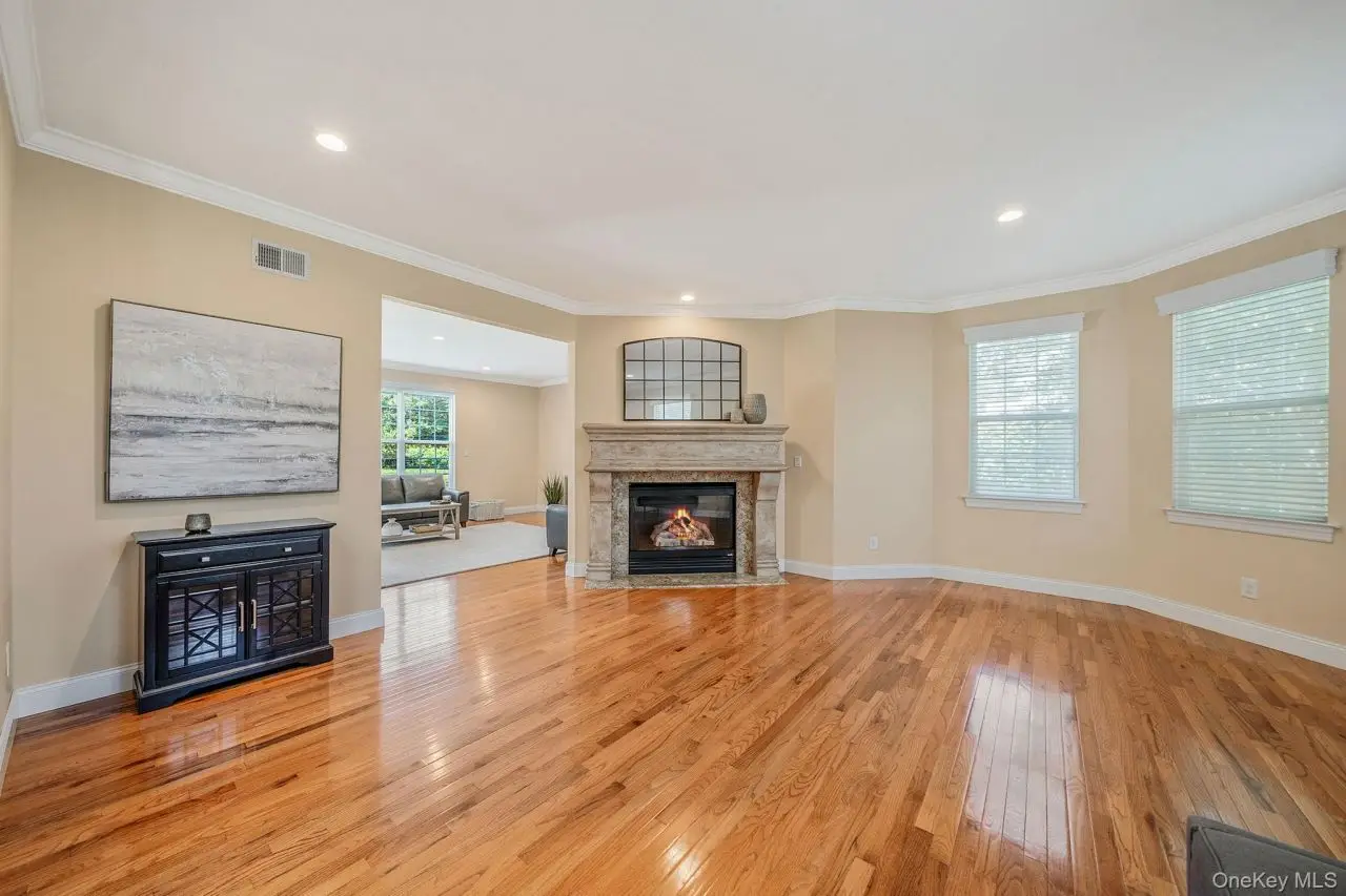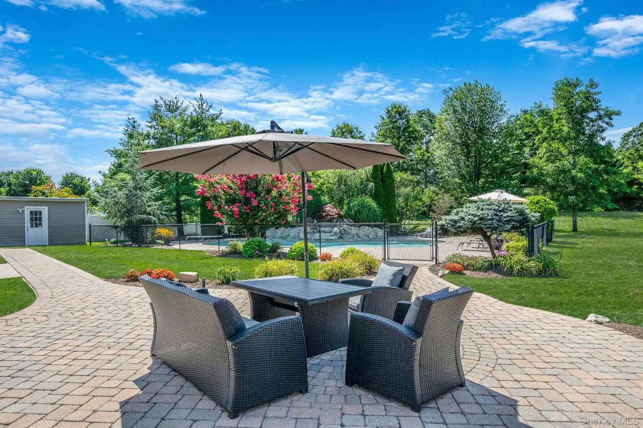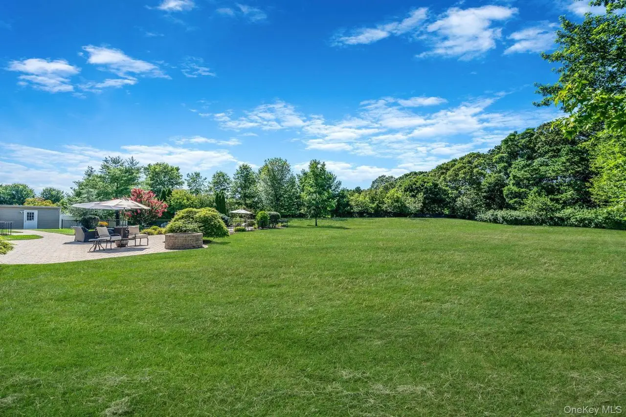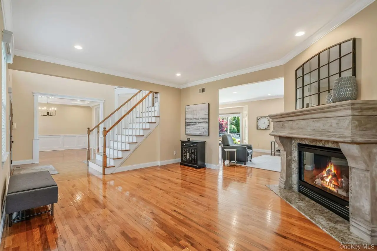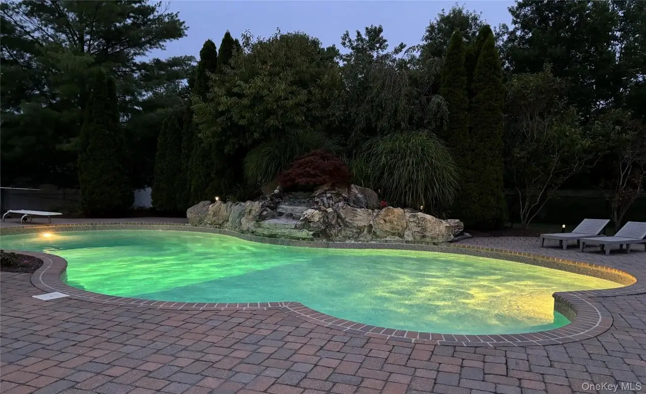 Set on a premium 1.25-acre parcel in Country Manor Estates, this post-modern colonial blends everyday comfort with resort-style outdoor living. Approximately 3,672 square feet above grade with a sunlit, open flow: a 2023 designer kitchen with custom cabinetry, full-height granite backsplash, built-in refrigerator, double wall ovens and center island opens to the breakfast area and great room. Formal living room with gas fireplace and a separate dining room; a full main-floor guest/au-pair suite adds flexibility. Two-story foyer, rich millwork and hardwood floors throughout. Upstairs, the primary retreat offers two walk-in closets and a spa bath with Jacuzzi tub, glass shower and dual vanity, plus four additional bedrooms, an updated hall bath and convenient laundry. Outside, a new driveway (2022) leads to paver walkways and an expansive patio overlooking the free-form waterfall pool-liner 2018, new gas heater 2024-framed by mature landscaping and fencing. The walk-out lower level provides a wet-bar lounge, recreation/media zones, a bath and direct patio access for easy indoor-outdoor living. Major updates: new architectural roof 2024, full HVAC replacement 2021, 200-amp electric, central vacuum, full irrigation; natural gas, public water, cesspool. Shoreham-Wading River Schools and a quiet cul-de-sac setting close to beaches, parks and village conveniences.