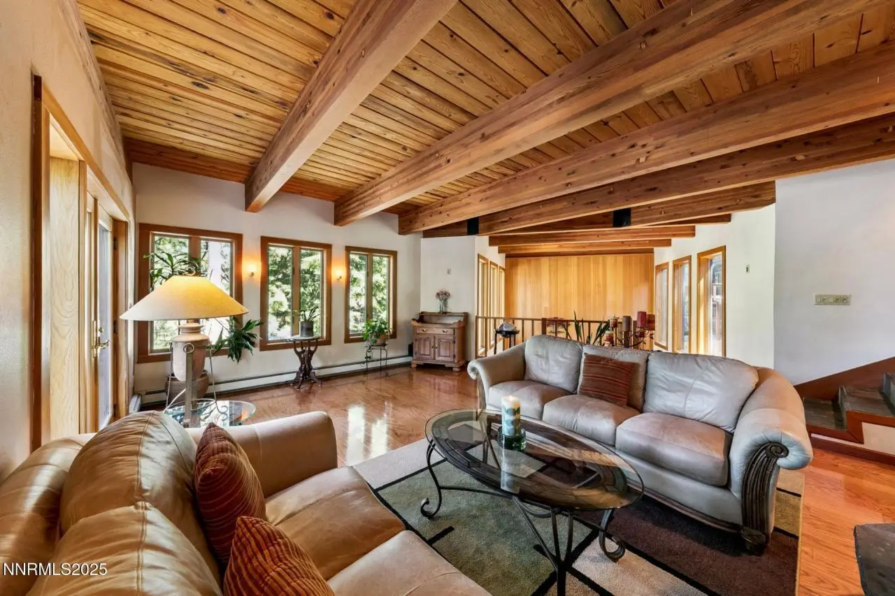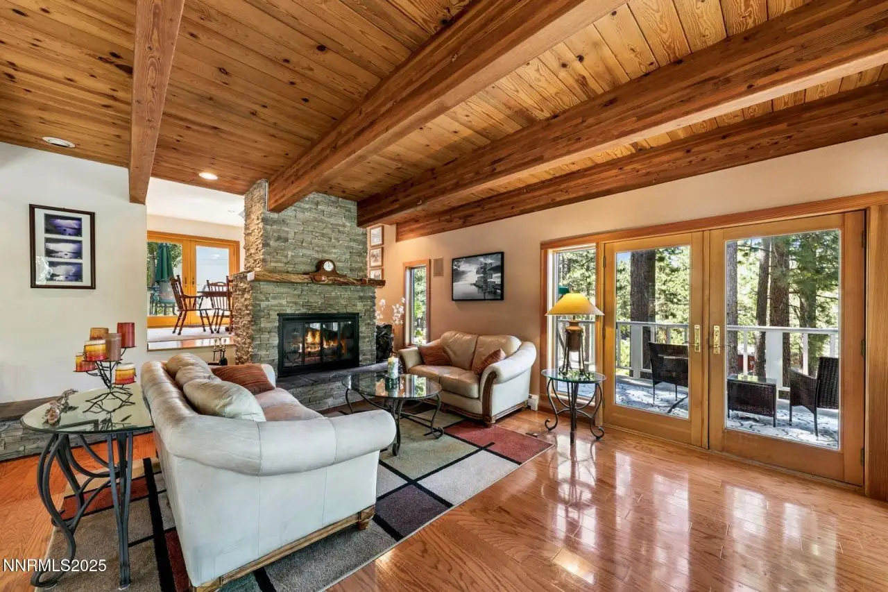 Embrace life in a coveted neighborhood where stunning mountain views greet you each morning from multiple outdoor decks. This home is nestled on a beautifully landscaped .34-acre lot with 2996 sq. ft. of living space. The peaceful and scenic backyard is a true refuge. With 4 spacious bedrooms, 2.5 attractively appointed bathrooms, and attached two car garage, this home offers very versatile family living. Upon entry you'll be greeted by soaring open beam ceilings along with abundant natural light from the many large picture windows showcasing expansive mountain views. Enjoy the warmth and ambiance of the stone veneer fireplace in the heart of the living room and the standalone gas fireplace in the family room. The home has been updated with the perfect blend of Alpine charm and modern comfort. Step into the heart of the home with a spacious and attractively updated kitchen designed for family living and entertainment along with ample storage and a separate pantry. Featuring modern stainless-steel appliances, generous counter space, stylish cabinetry, and a large center island perfect for gatherings. The spacious primary suite includes a walk-in closet, jacuzzi tub, and separate shower. The adjoining outdoor deck is also wired for a large jacuzzi. Perfectly positioned near Heavenly Ski Resort, Lake Tahoe Beaches, restaurants and recreation areas. Shows pride of ownership and timeless appeal.