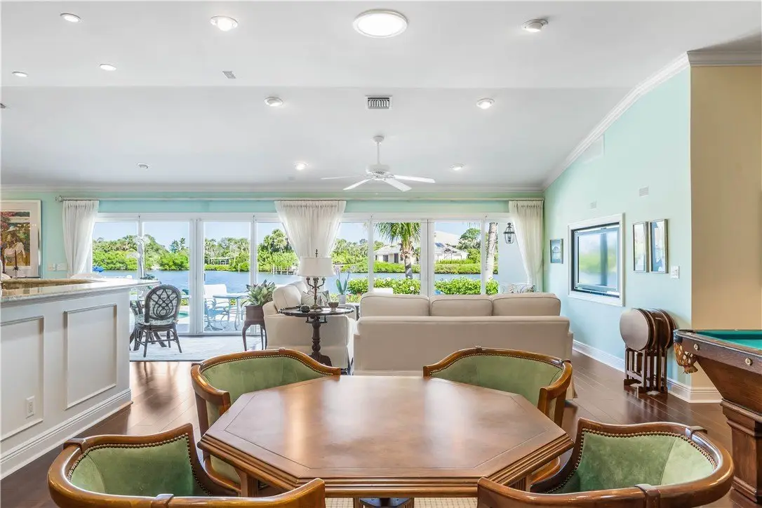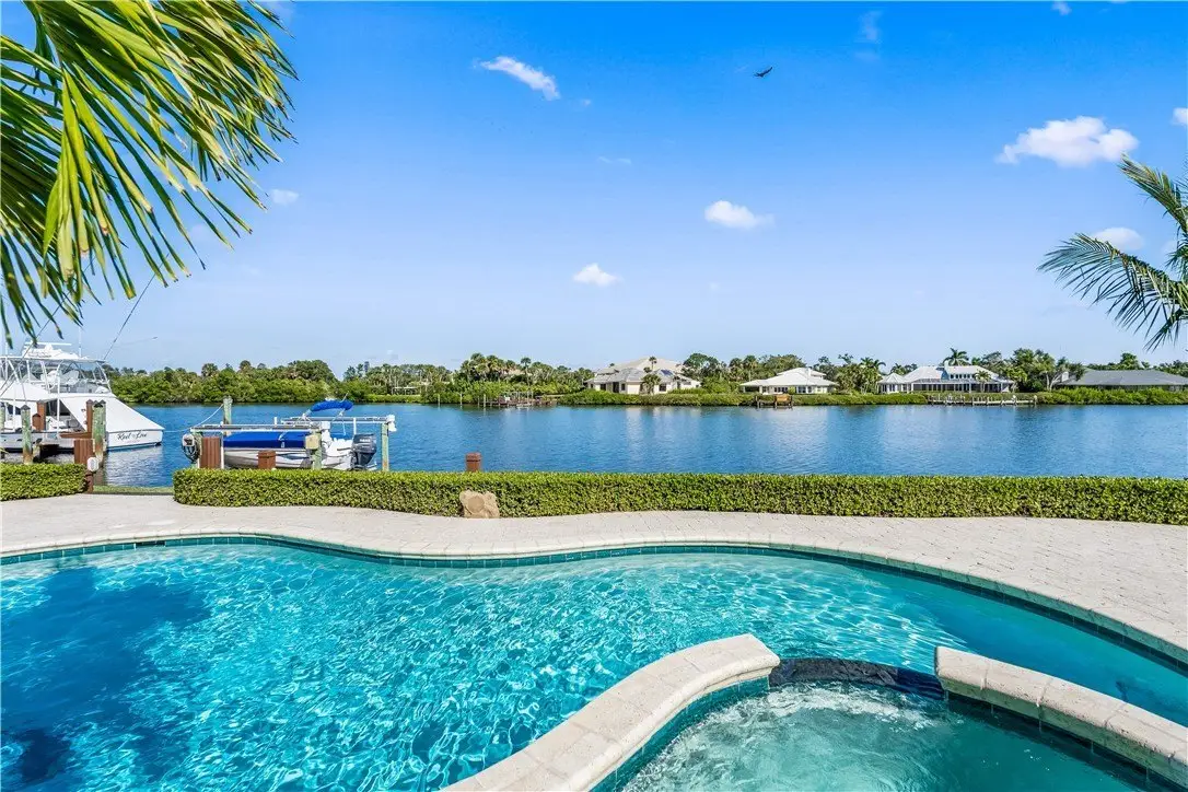 Elegant 3BR/3.1BA home exudes Old-Florida charm at the end of a cul-de-sac in Riomar Bay. Approach the residence via a circular drive. The tray-ceilinged entry foyer with rich wood floors opens to a bright and open floor plan. Kitchen has granite countertops, gas range, custom cabinetry. Formal living/dining areas enjoy pool views. A coffered ceiling and wall to wall built in accentuate the distinguished den. A retractable awning creates lovely poolside gathering area. Private dock/lift, impact glass, generator, pool bath, central vac, garden fountain, and panoramic Intracoastal views.