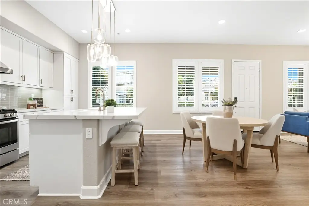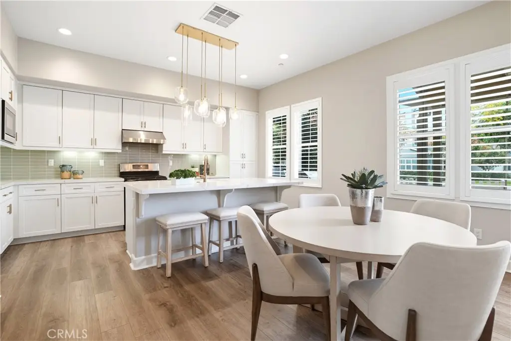 Offered by the original owner, this beautifully upgraded home blends modern design with luxury finishes throughout. From the moment you arrive, you'll be captivated by the spacious front yard, and oversized covered patio--complete with built-in seating and a cozy firepit, perfect for entertaining or enjoying a quiet evening outdoors. Step inside to discover an open-concept layout featuring elegant vinyl plank flooring, fresh interior paint, plush new carpet, recessed lighting, and upgraded baseboards. The bright and airy living room flows effortlessly into a dining area and a chef-inspired kitchen equipped with stainless steel Energy Star appliances, a gas range with hood and griddle, a self-cleaning convection oven, modern tile backsplash, gorgeous quartz countertops, and a large center island with farmhouse sink and breakfast bar. Upstairs, the luxurious primary suite offers a true retreat with a spacious walk-in closet, beautifully upgraded ensuite bathroom with tiled shower and floor, quartz countertops and dual vanities. Two additional bedrooms, a full guest bathroom with dual sinks, and an upper-level laundry room with added cabinetry provide plenty of space and convenience for daily living. The third-level covered rooftop deck boasts panoramic mountain views and is ideal for BBQs, al fresco dining--with a built-in sink, refrigerator, and counter space--or simply lounging with a built-in TV setup. Additional home features include touchless keypad entry, custom window coverings including wood shutters and blinds, double pane windows, upgraded light fixtures, downstairs framed mirror, modern hardware, direct access 2-car garage with overhead storage and ball rack, and Energy Star features integrated throughout the home. You will also have access to award-winning amenities such as baseball fields, playgrounds, a sports park, the Canyon House, Blue Hummingbird Coffeehouse, The Pond, Lagoon and Lake, Camp Out facility, resort-style pools, the farms, an arcade, state-of-the-art workout gyms, dog park, a zipline, splash pads, biking trails, NEV roads, and tennis and pickleball courts (to name a few). Additionally, it is just 15 minutes from the beach and conveniently located near the 241 freeway.