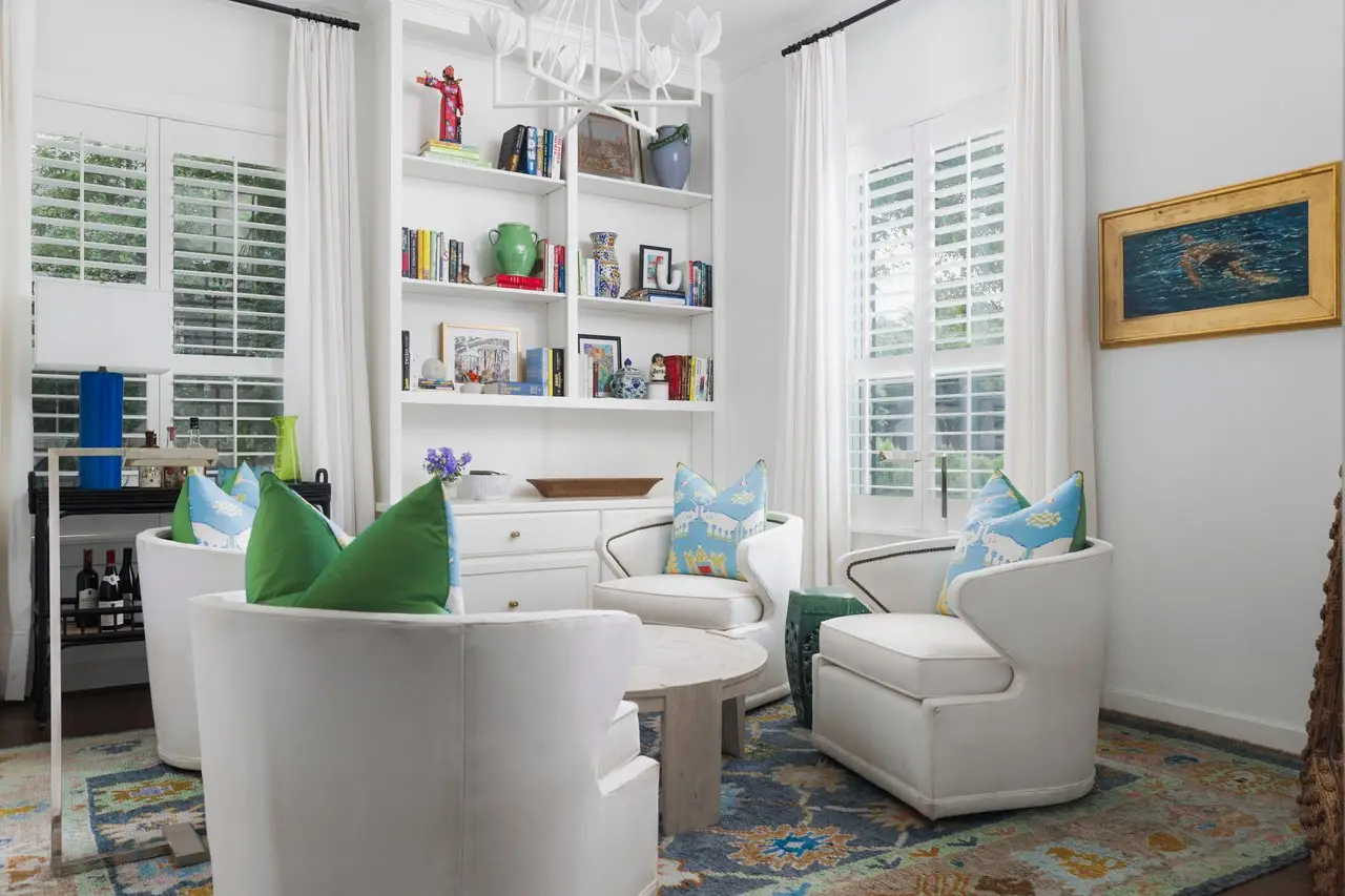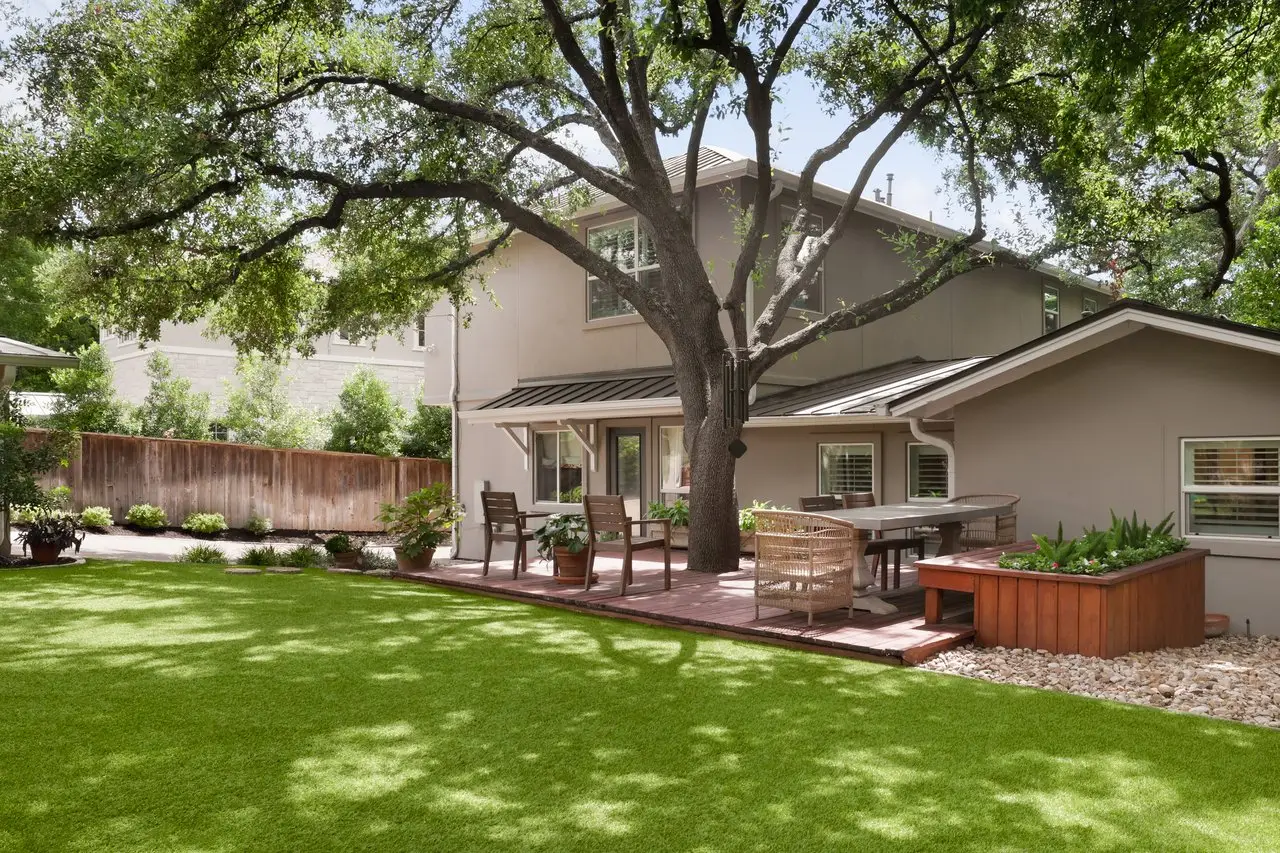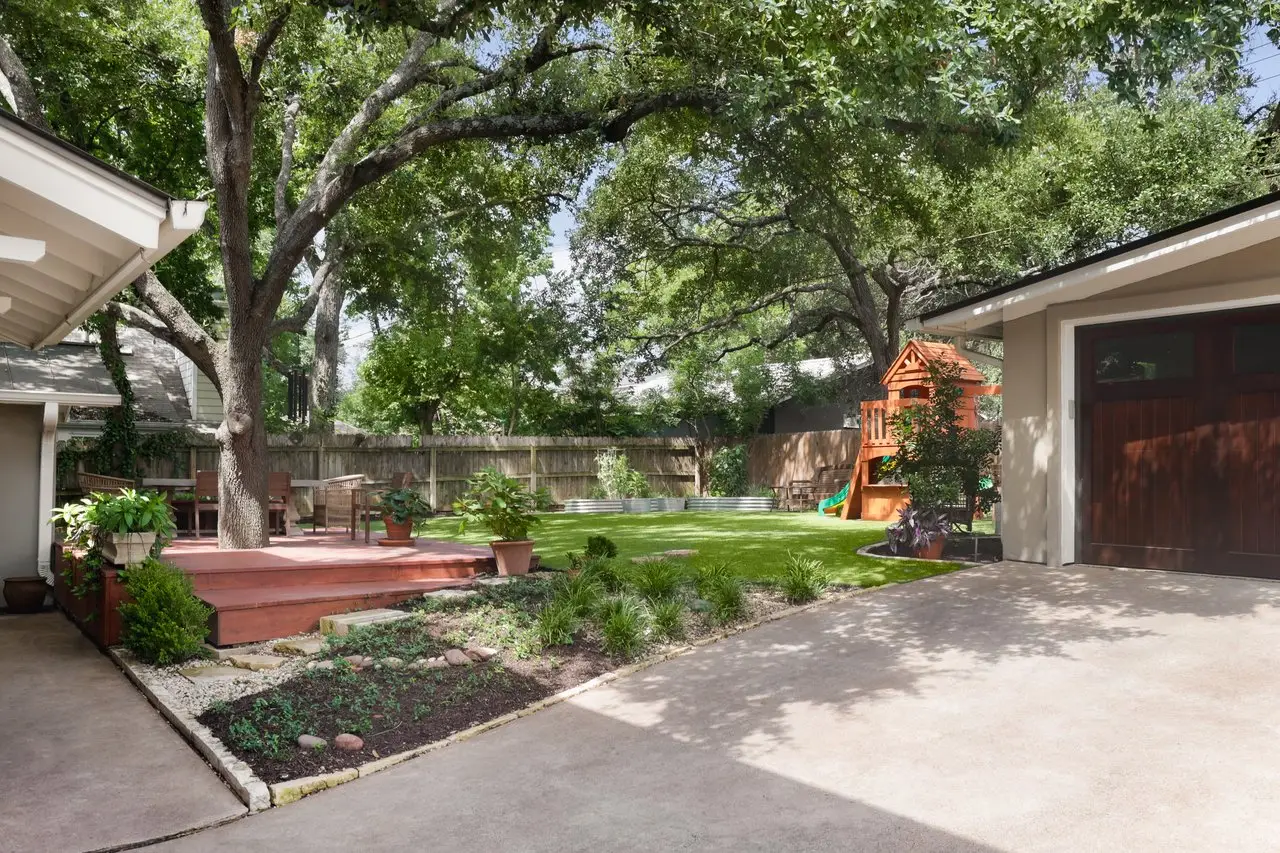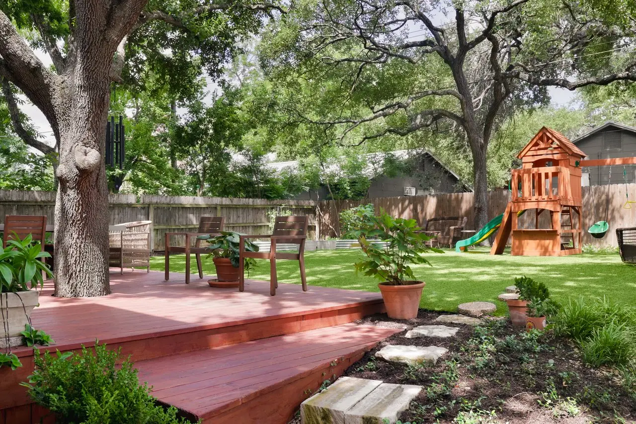 Situated on a spacious quarter acre lot in the heart of Tarrytown, this home boasts a 5 or 6 bedroom, 4.5 bath floorplan offering light filled spaces, colorful accents and easy living. As you enter, you are greeted with a bright, cheerful and spacious open living, dining and kitchen area. Gorgeous wood floors, custom white shutters, touches of wallpaper and a fun pop of color on the stair runner. A light filled sitting room or office overlooking the lush front yard includes built-in storage and shelving. The expansive living space is also anchored by millwork including shelving, storage and media area. The kitchen includes a 6-burner gas Wolf range, double ovens, walk-in pantry, plentiful storage and oversized breakfast bar and island. The adjacent dining area includes built-in bench seating – beautifully upholstered in sunny yellow. An entertainer’s delight! The current floorplan utilizes 3 bedrooms downstairs and 3 bedrooms upstairs, with the primary bedroom located on the second level overlooking the treetops and backyard. The primary bath features an oversized dual shower, dual vanities and two walk-in closets. As an option, there is plenty of flexibility to utilize some rooms as office and gym spaces, or additional living. The generously sized turfed backyard has ample room for play, grilling, dining and gardening. A wood deck offers a space for dining al fresco under gorgeous mature trees. The gated driveway leads to a two car garage. Don’t miss this fantastic opportunity to live in one of Austin’s most desirable neighborhoods. Walkable tree-lined streets, close to shopping, dining, trails and the best of Austin. www.2106schulleave.com