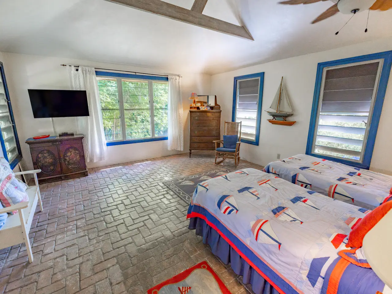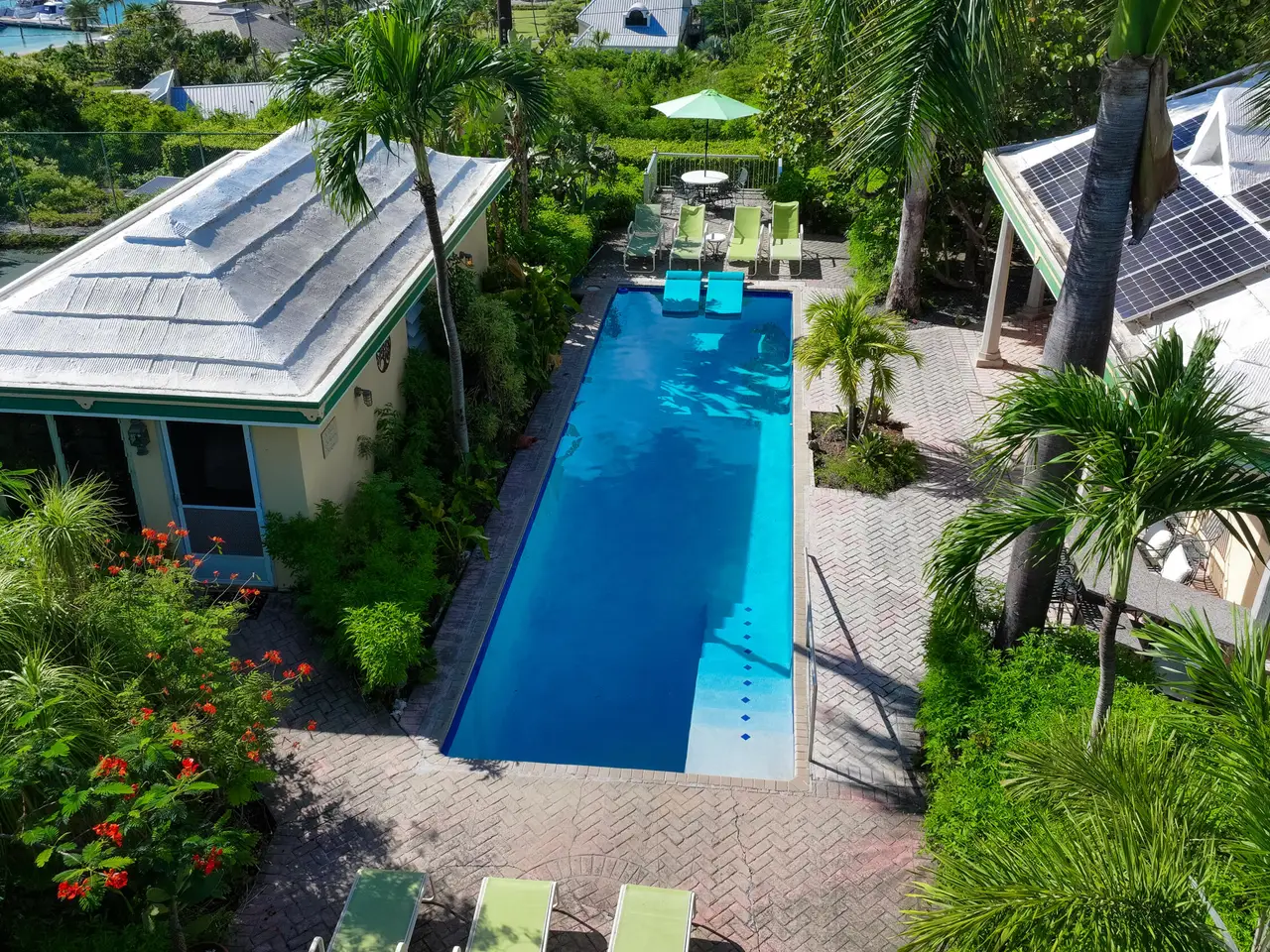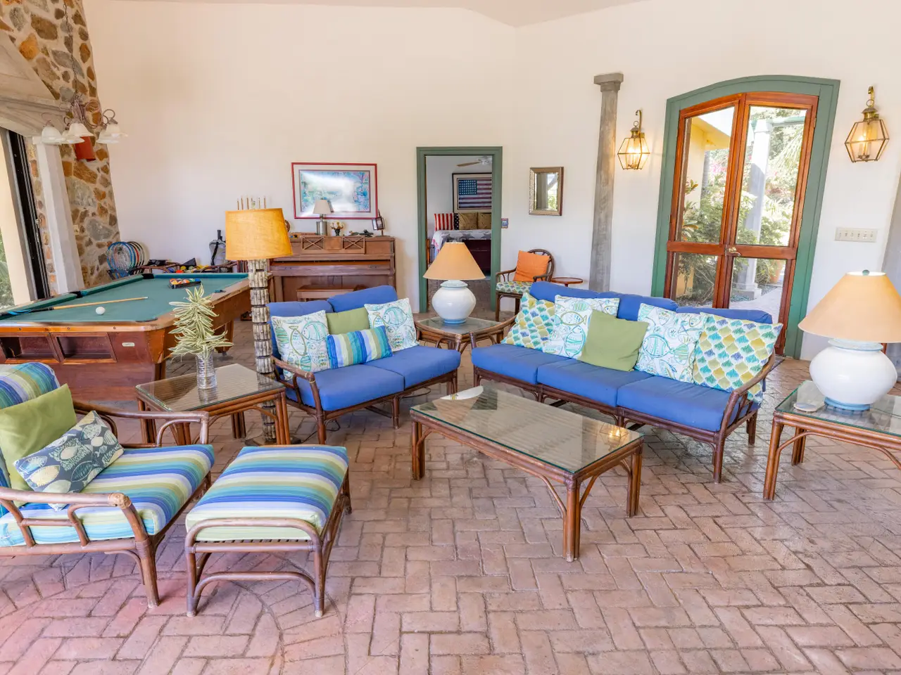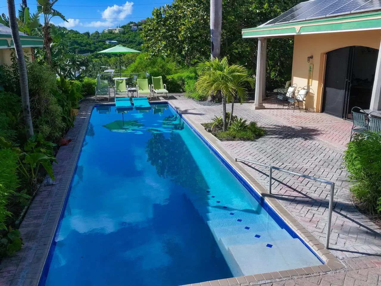 Tennis Villa is a classic Chocolate Hole estate offering an exceptional blend of space, privacy, and recreation. This single-level home features a gourmet kitchen, vaulted-ceiling living areas, and a sunny south-facing courtyard with a 43-foot pool. A detached pool house provides the 4th bedroom and bath. The regulation-sized tennis court was resurfaced in 2023 and includes pickleball markings. Solar panels with Tesla battery backup ensure year-round comfort and safety with a concrete roof. Enjoy lush landscaping setting, harbor views, and a prime location just minutes from Cruz Bay and walking distance to boating access in Great Cruz Bay.