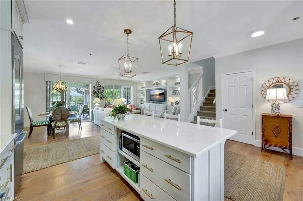 This Florida tropical home exudes charm and elegance with a brick-paver driveway framed by swaying palm trees, leading up to a fabulous two-story sanctuary that offers an ambiance of lush tropical landscaping. Inside, natural light pours through plantation shutters, illuminating a space that blends the warmth of hardwood flooring and indoor stairs that lead to the first level garage area. Stainless steel appliances adorn a modern kitchen with white cabinetry finished off with gold hardware, spacious kitchen island area that easily transitions into the living and dining areas. The outdoor screened-in lanai is the perfect setting to bathe in sunlight and visit with family and friends. The primary room is privately located upstairs and is complemented by a sunning deck ideal for relaxation and enjoying the summer breeze. Your guests will enjoy spacious guest rooms located on the main living level. The community pool is ideally located just steps from home. There is so much to enjoy at Bonita Bay including a private beach club, beach shuttle, walking/jogging trails, dog park, marina and waterfront restaurant, tennis, and golf with separate membership purchase and so much more creating a seamless blend of luxury and leisure. Start living your best life now!