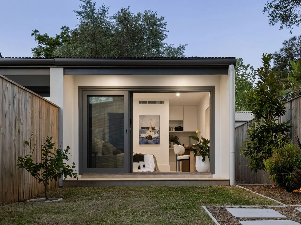 • North-facing backyard with ambient lighting