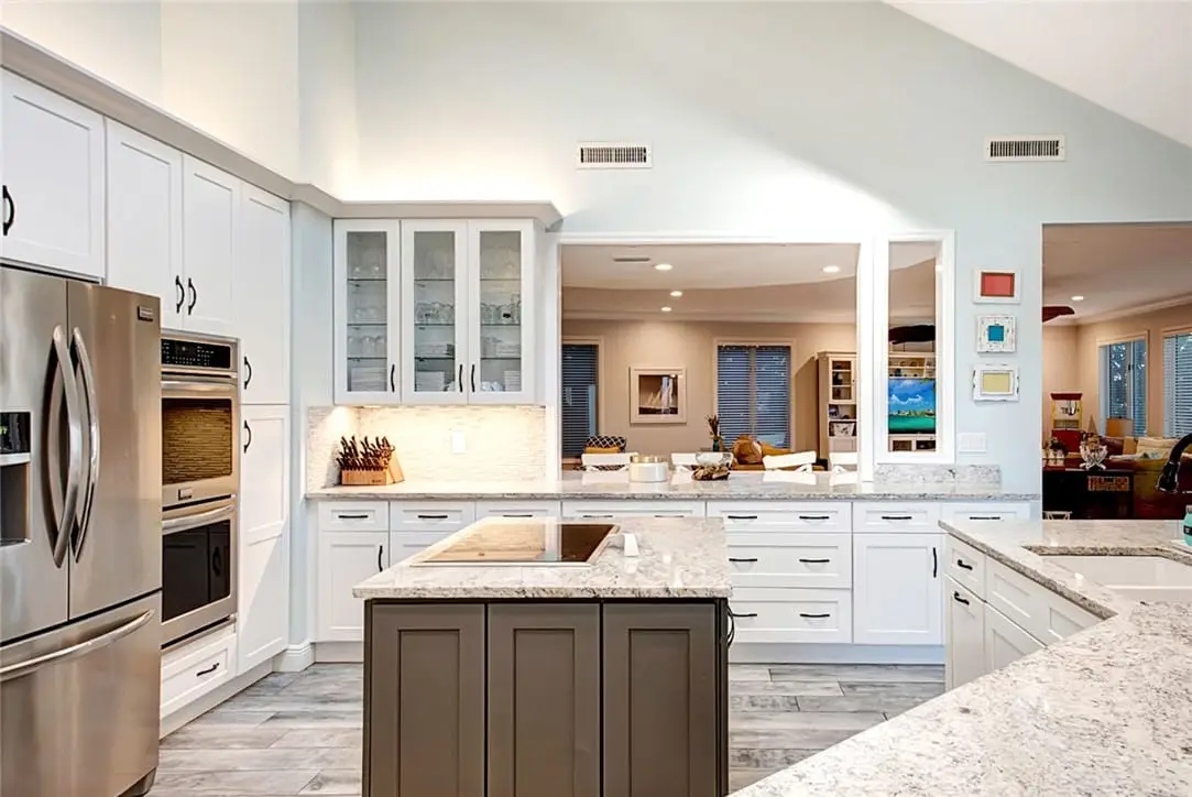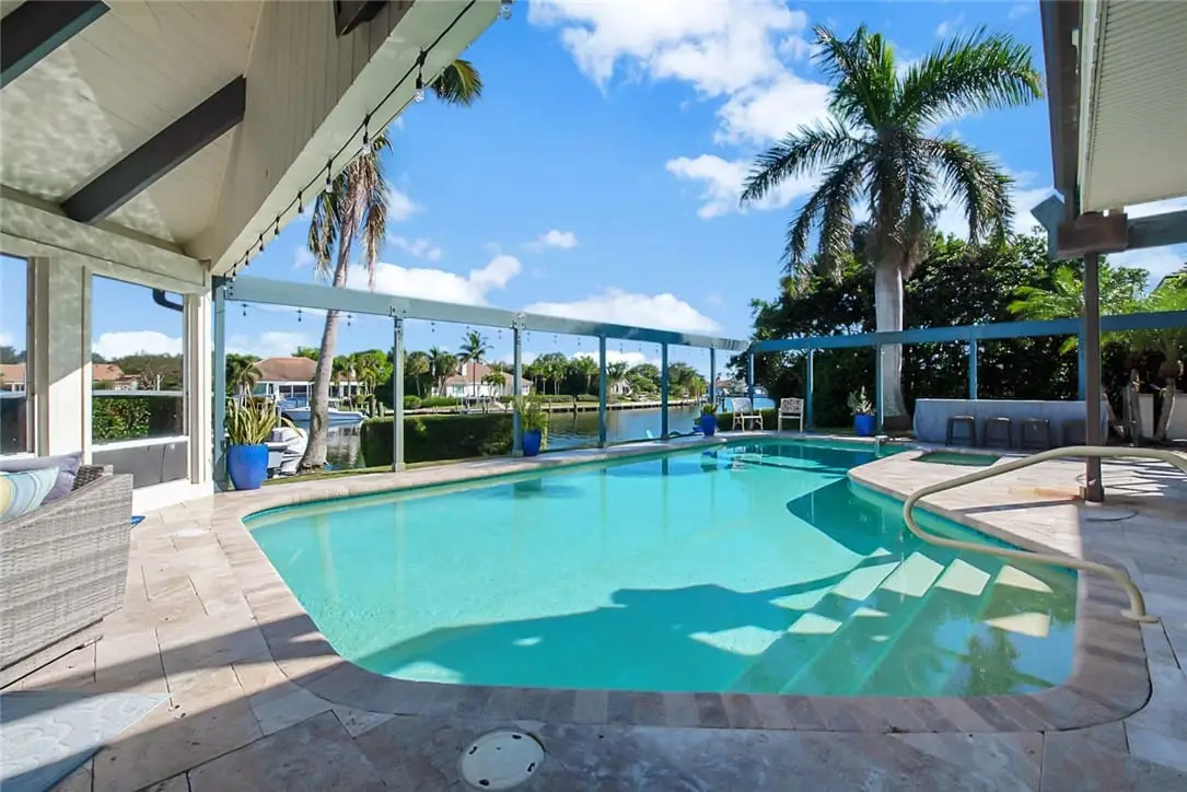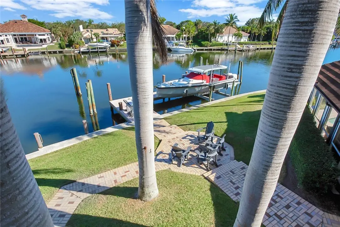 149 feet of sea-walled water frontage! Spacious five bedroom, 4.5 bathroom estate in the prestigious gated community of The Moorings. Expansive open-concept living area with soaring ceilings, and natural light flowing throughout. Large remodeled gourmet kitchen perfect for entertaining and everyday living. View from every room! Outdoor pool, patio, dock, and fire pit, ideal for enjoying sunset views or hosting guests. For boating enthusiasts, this property is a dream come true, boasting a deep-water dock with a 16,000 lb boat lift, ensuring easy access to the river. Sizes are approximate/subject to error.