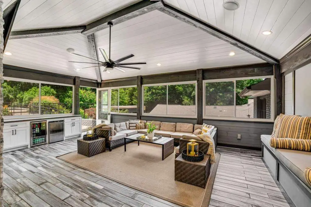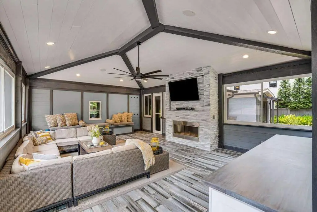 Resort-style backyard with deep-water pool and spa Covered patio with fireplace and indoor kitchen