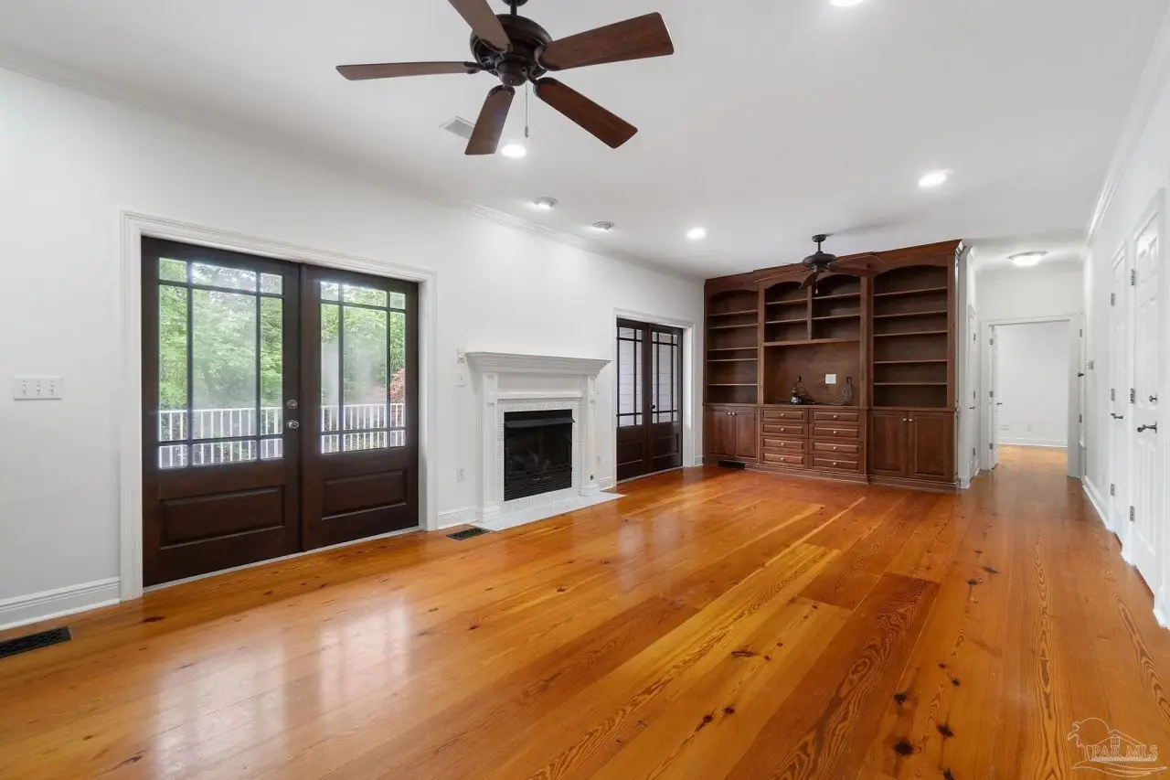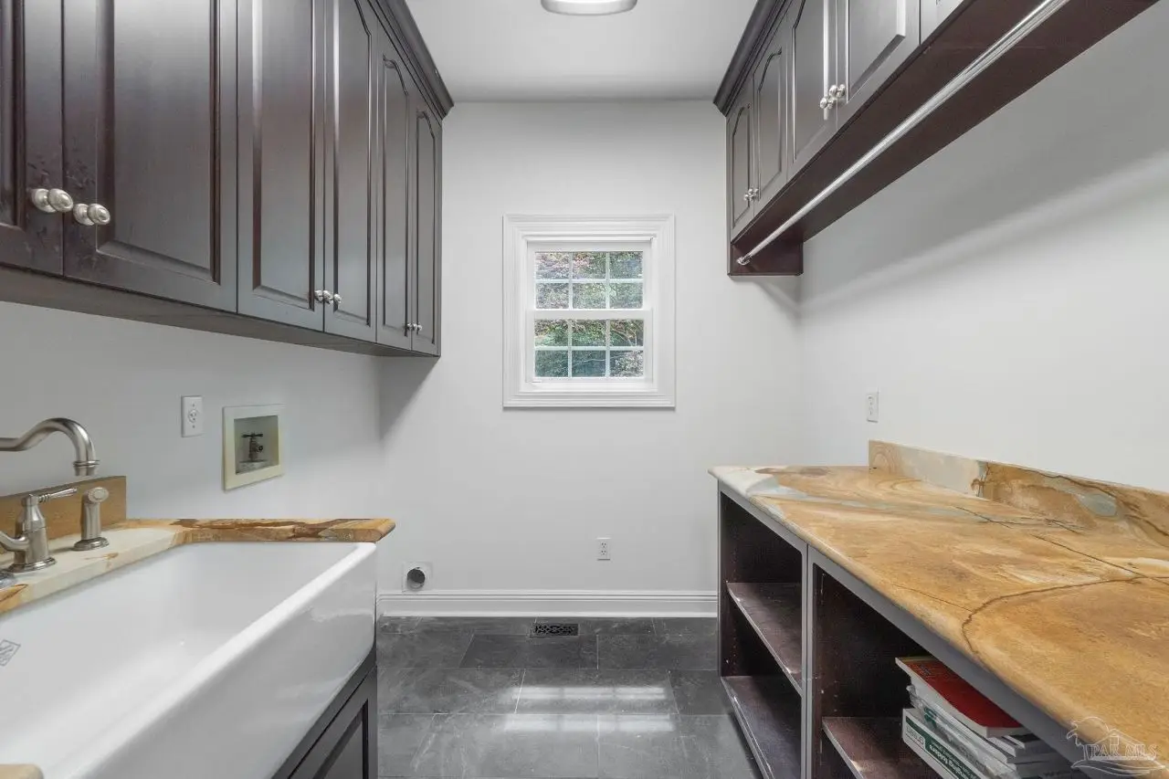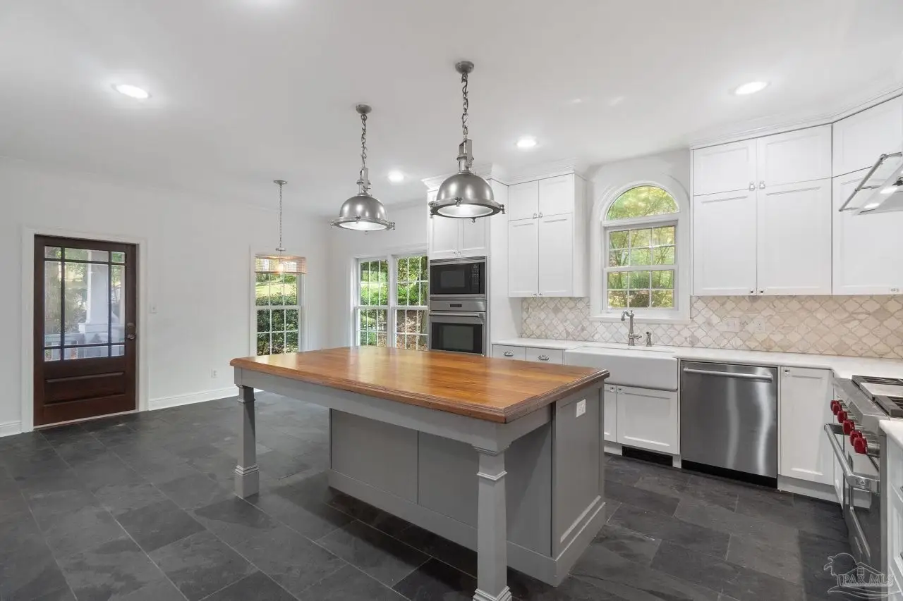 Opportunity awaits in Heritage Oaks with this distinctive pool home on a spacious lot bordered by mature woods, featuring a walkout basement and private studio apartment, offering an estate-like feel just minutes from downtown Pensacola. From the inviting curb appeal to the meticulously maintained grounds, this home blends character, functionality, and timeless design, ideal for multi-generational living. Inside, natural light fills the main living spaces, creating an effortless flow from the entryway to the formal dining room, office, and combined kitchen and den. Reclaimed heart-pine flooring and double doors leading to multiple outdoor living areas enhance the ambiance. The chef's kitchen is a true showstopper, featuring top-of-the-line stainless steel appliances, Marble countertops, ceiling-height white shaker cabinetry, and an elegant Arabesque tile backsplash. The custom oversized island offers generous prep space, while the beverage center includes a built-in wine refrigerator and serving station. An adjacent versatile area serves as an office/homework area, laundry room, and additional storage. The main-floor primary suite features a sophisticated ensuite with an expansive shower, Marble countertops, elegant Espresso cabinetry, and a soaking tub. Upstairs, additional bedrooms and beautifully appointed full baths continue the home's design aesthetic. In addition to the oversized two-car garage, a secondary three-car garage with upper-level living quarters and kitchenette offers endless possibilities-whether as a guest suite, art studio, or workout area. The home's outdoor entertaining space is equally impressive, with multiple areas designed for enjoying the pool. A covered porch with fireplace off the guest apartment offers convenient access to the pool changing area and shower, while a covered patio provides the ideal spot for lounging and escaping the sun. The pool deck and side yard with fire pit, make this home the ultimate year-round hosting space.