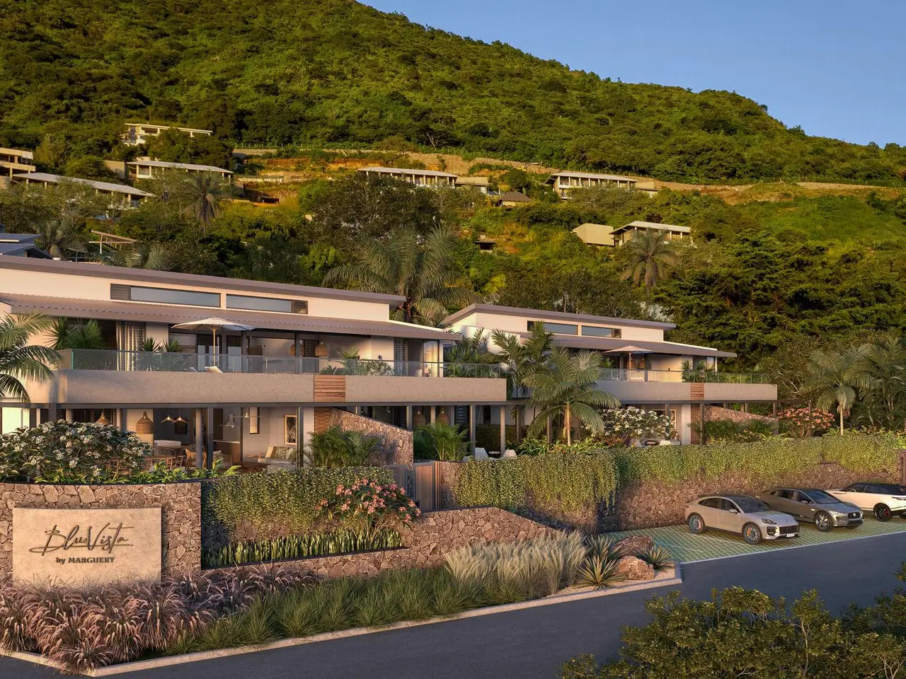 Discover Blue Vista, an exclusive address nestled between the lagoon and the western mountains, in the heart of Black River Bay. This small fishing village, rich in history, offers an idyllic living environment, perfectly located in the most sought-after area of Black River and Tamarin. Blue Vista enjoys a privileged location at the top of Plantation Marguery, with panoramic views of the ocean and the majestic Le Morne mountain. This part of the island has something for everyone: whale and dolphin diving, kitesurfing, sailing, hiking and more. Golf enthusiasts will love the five courses in the immediate vicinity, with the option of joining an 18-hole golf course just a five-minute drive from the development. The Blue Vista residences, perfectly integrated into their natural surroundings, offer an exceptional living environment where luxury and tranquillity meet. At the heart of Plantation Marguery, the homes benefit from large windows that flood the spaces with natural light and offer breathtaking views of the surrounding landscape. Every architectural detail has been designed to harmonise modern comfort with the authenticity of the island. Blue Vista is located in the immediate vicinity of the Ruisseau Créole shopping centre, which offers a variety of shops, restaurants and services to meet all your daily needs. Whether you want to go shopping, enjoy a meal in a quality restaurant, or simply enjoy an afternoon of relaxation, everything is within easy reach. Blue Vista's outdoor spaces are designed to provide a haven where residents can relax and enjoy the natural beauty of the island. Landscaped gardens with local plants create a soothing and charming atmosphere. The private swimming pools, with their green and blue highlights, add a touch of luxury and serenity to each residence. Living at Blue Vista means choosing an exceptional lifestyle in secure surroundings, where every day is an invitation to escape and relax. The open spaces, natural light and spectacular views make this a luxury retreat for the privileged few. Blue Vista is much more than a residence, it's a unique living experience, where modern comforts meet the natural beauty and authenticity of the island. Come and discover this haven of peace and let yourself be seduced by the elegance and tranquillity of this exceptional place. APARTMENTS : The light-filled flats will amaze you with their clean lines. Each of the private pools reflects shades of green and the blue of the ocean. PENTHOUSES The two penthouses open onto a wider panorama, each with a discreet, elegant pool. They exude a warm, friendly atmosphere, ideal for evenings out with family and friends. VILLAS Boasting breathtaking views, the 4 villas offer residents an idyllic living environment, blending harmoniously with the surroundings and exuding an atmosphere that is both relaxing and peaceful. Blue Vista, where luxury meets nature to create an exceptional and unforgettable living environment.