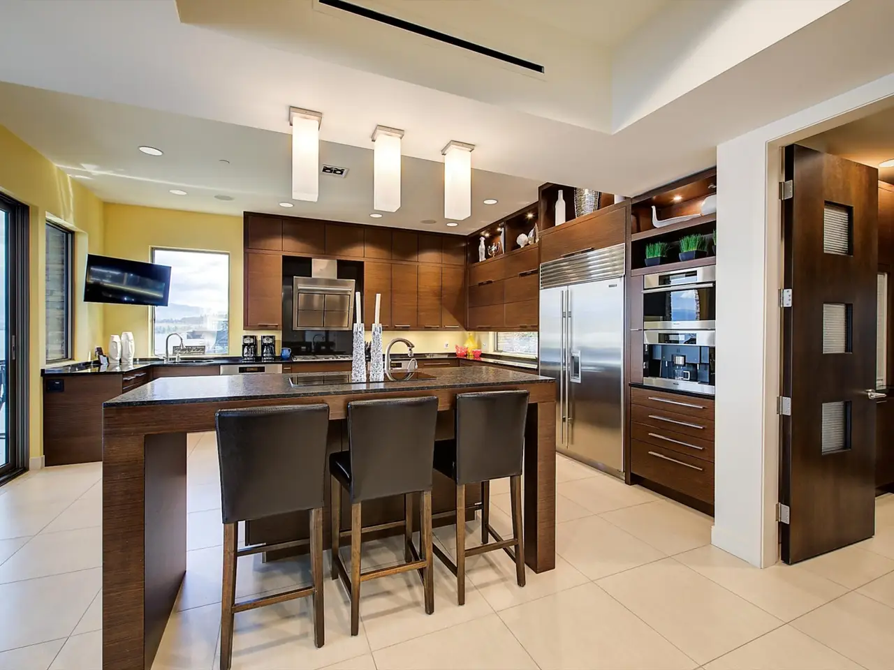 Listed by Unison Jane Hoffman Realty | Nestled in the exclusive gated community of Sailview Bay, just 10 minutes from downtown Kelowna, this stunning 8,007 sq. ft. 4-bedroom, 8-bathroom estate is a true architectural gem. Designed with elegance and precision, it seamlessly blends luxury and comfort. From the moment you step through the grand glass entrance, the home’s quality and craftsmanship are undeniable. Spanning four levels with an elevator for easy access, it offers an exceptional layout. The upper level features three guest suites, each with their own private washroom, a laundry room, and a custom office. A tandem garage completes this level. The main floor is the heart of the home, boasting a spectacular primary suite with a spa-like ensuite and walk-in closet. A soaring great room with dramatic lake views flows into the dining area and gourmet kitchen. A secondary laundry and pantry ensure effortless functionality, while a second double garage provides easy access. Designed for entertaining, the lower level features a stylish bar, theatre room, and spa-inspired bath with a steam shower. Expansive patio doors open to an infinity pool, hot tub, and stunning outdoor lounge. Below, a private wine cave and poker room, carved into the cliffside, create a one-of-a-kind retreat. Waterfront amenities include a deep-water dock with two boat lifts, two Sea-Doo lifts, and a beachfront cabana with a private washroom. Offering luxury, privacy, and convenience, this is one of Okanagan Lake’s finest estates.