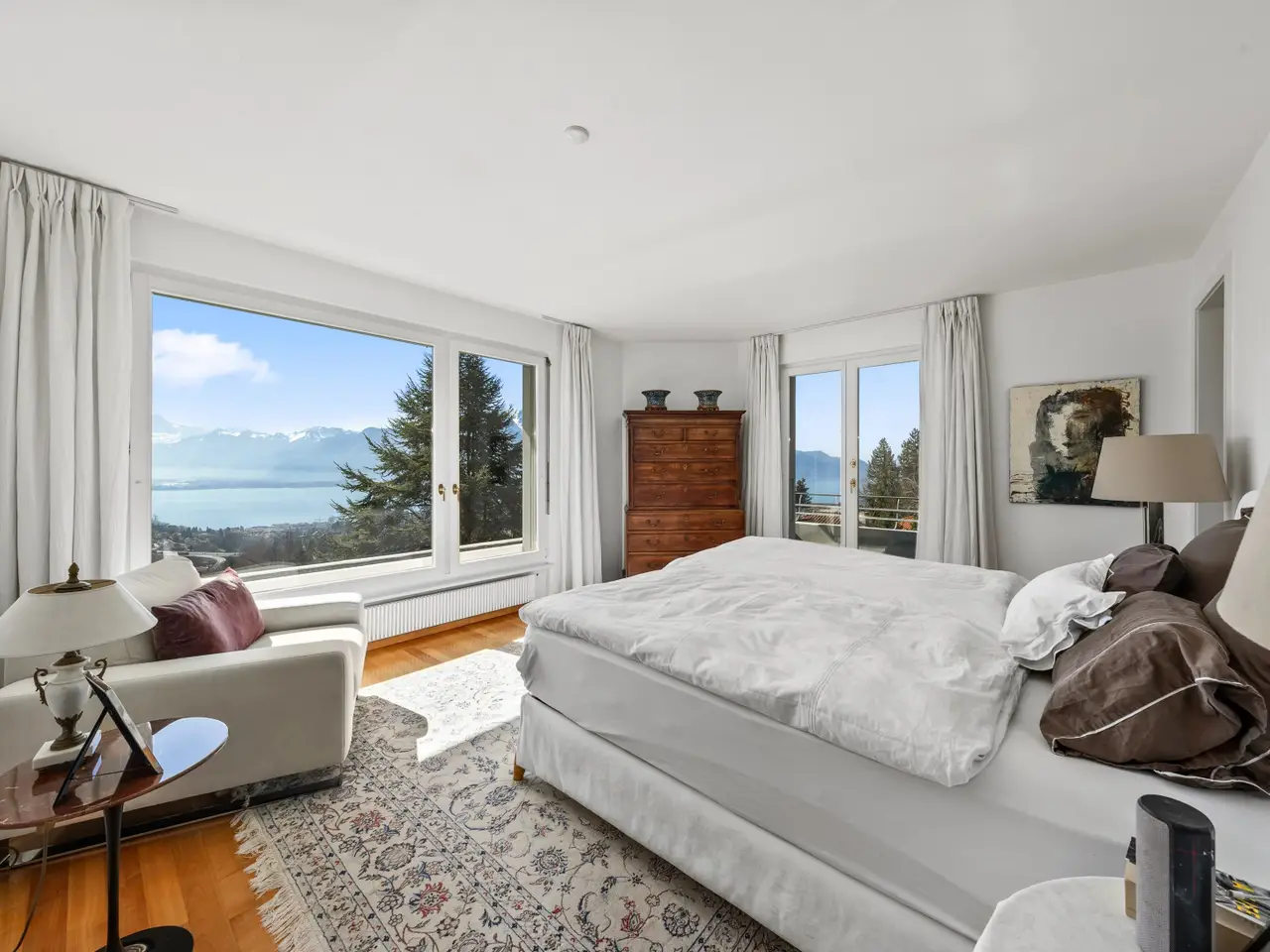 Located in a peaceful and green residential area, just a few steps from the heart of the village, this stunning 1930s property will captivate you with its exceptional panoramic view of the lake and mountains. Set on a beautifully landscaped plot of 1,578 m², fully enclosed, it offers privacy and tranquility. Regularly maintained and renovated over the years, the house features spacious rooms, fine finishes, and high-end materials. On the upper floor, you'll find a bright living room with a fireplace, a dining room, and a fully equipped kitchen. All these spaces open onto a large balcony, perfect for enjoying the breathtaking view of the Lake Geneva Basin. A small lounge and a guest WC complete this level. On the second floor, the spacious master suite includes two walk-in closets, a bathroom with a bathtub and shower, and a private balcony. Two additional bedrooms, sharing a balcony with an exceptional view of the lake, are also located here, along with a shared bathroom. The lower level features a wine cellar, a carnotzet with kitchen, and direct access to the terrace and garden, ideal for summer evenings. Two additional bedrooms, a shower room, a laundry room, and a BA shelter complete this floor, offering a perfect space for entertaining guests. The main building, originally built in the 1930s, was extended in 1980, forming this magnificent property.