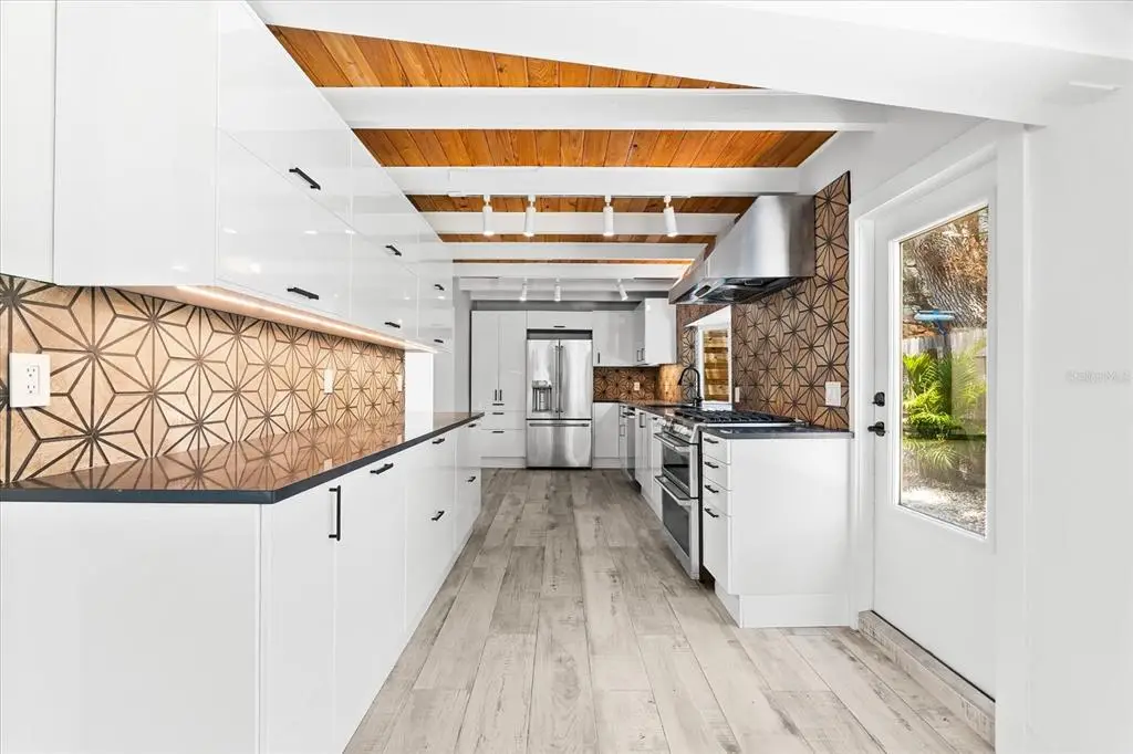 One or more photo(s) has been virtually staged. Welcome to The Blue Lagoon, a private modern coastal retreat perfectly positioned on Siesta Key's tranquil Heron Lagoon. This exceptional, gated quarter-acre compound offers the rare combination of serenity, design, and functionality, ideally located between Turtle Beach and Crescent Beach, just moments from the iconic Point of Rocks. Enter through a secure electric gate framed by custom wood fencing and arrive under a majestic live oak canopy that sets the tone for the natural beauty and privacy within. Designed to maximize indoor-outdoor living, the home features two expansive screened lanais, a sparkling private pool, an extensive wood deck, lush tropical landscaping, and a private dock where you can launch a paddleboard, kayak, or canoe directly into the peaceful lagoon. The single-level custom residence offers a thoughtfully designed 3-bedroom, 2-bath layout with wide-plank wood-look tile flooring in soft white and gray tones, crisp white walls, black metal hardware, and premium wood and metal ceiling fans throughout. Soaring ceilings are clad in hand-cut cypress wood shiplap, adding both natural warmth and acoustic insulation. The gourmet kitchen is a chefÆs dream, featuring high-gloss European cabinetry, quartz countertops, a striking wood-grain tile backsplash, and CafT Series stainless steel appliances including a six-burner gas range with a double oven and a counter-depth French door refrigerator with filtered and instant hot water. A whole-home water filtration system ensures pure water at every tap. The spacious master suite is a true sanctuary with a double-closet hallway, soaring ceilings, and a large window and sliding glass door that open to the lanai. The spa-inspired en suite bath features floating dual white European vanities, a luxurious rainwater shower with Kohler gold fixtures, floor-to-ceiling ôblue skiesö tile, and organic gray cobbled stone flooring. The peaceful sound of rainfall on the metal roof at the rear of the home enhances the retreat-like experience. The guest bath offers equally sophisticated design, with iridescent honeycomb tile behind a deep soaking tub and rich gray tilework throughout. Every detail of this home has been carefully curated to reflect the essence of the Siesta Key lifestyle, luxurious, relaxed, and deeply connected to nature. Whether you're looking for a full-time residence or a seasonal escape, The Blue Lagoon offers a once-in-a-lifetime opportunity to own a coastal property where water views, natural beauty, and modern comforts unite in perfect harmony. In addition to being a stunning private residence, this property is also ideal for seasonal use or as a high-performing vacation rental. Similar properties on Siesta Key routinely generate over $100,000 per year in rental income, making this an excellent opportunity to enjoy the home while having it support itself or even contribute toward paying it off. Use it as a vacation retreat while earning income and always have a beautiful place to stay on Siesta Key. And if your long-term vision includes building your dream home, please inquire directly about available building plans for the lot by Island Series with Yoder Homes. Visit the link for a 3D tour, video and floor plan. https://nextlevelmediasrq.hd.pics/8234-Midnight-Pass-Rd/idx