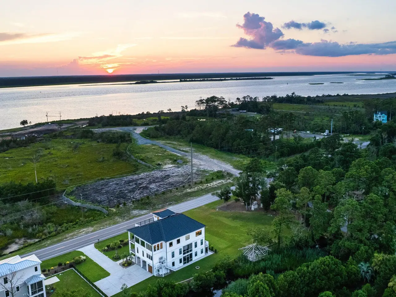 Imagine gliding home along River Road at golden hour, the Cape Fear River blazing with color as your 4-Story modern masterpiece appears. Clean lines, copper flashes, and railings catching every ray. Press a button and the hydraulic elevator lifts you from the epoxy finished 3 bay garage to the main level, where 10 ft ceilings and floating white oak stairs frame and unobstructed river panorama. Dinner simmers on a 48'' ZLINE dual-fuel range while conversation flows around the quartz waterfall island. A built in Signature Suite Fridge, twin beverage coolers, Samsung AirDresser and reverse-osmosis prep sink keep everything (and everyone) perfectly refreshed. Slide open DP-Rated glass walls and the porch transforms into an al-fresco lounge lit by fiery skies and a 62'' linear fireplace. Upstairs, the primary retreat rivals a boutique spa: 70'' limestone soaking tub, wall mounted bidet, remote shades, custom closet and a ocean-quiet Carrier HVAC- one of three zoned systems paired with a whole house dehumidifier, six smart thermostats, and a full water filtration. Two additional guest levels offer dry bars, a glass-walled office with gigabit wiring and a rec room cooled by a 20-SEER mini-split. Outside, marine grade cable rails, Duxxbak decking, stamped concrete, and a hot and cold shower stand up to salt and sun, while a 22 kw Generac generator, 500 gal propane tank, and 400 amp service keep life seamless. PGT impact windows, standing seam metal roof, fiber cement siding and copper flashing promise decades of low maintenance luxury. Bonus: There is an additional lot that can be purchased next to the property- perfect for a pool and/or a 1 bedroom accessory dwelling or in-law suite, making this already rare offering even more exceptional. There's nothing like it on the market. Schedule your private sunset tour today!