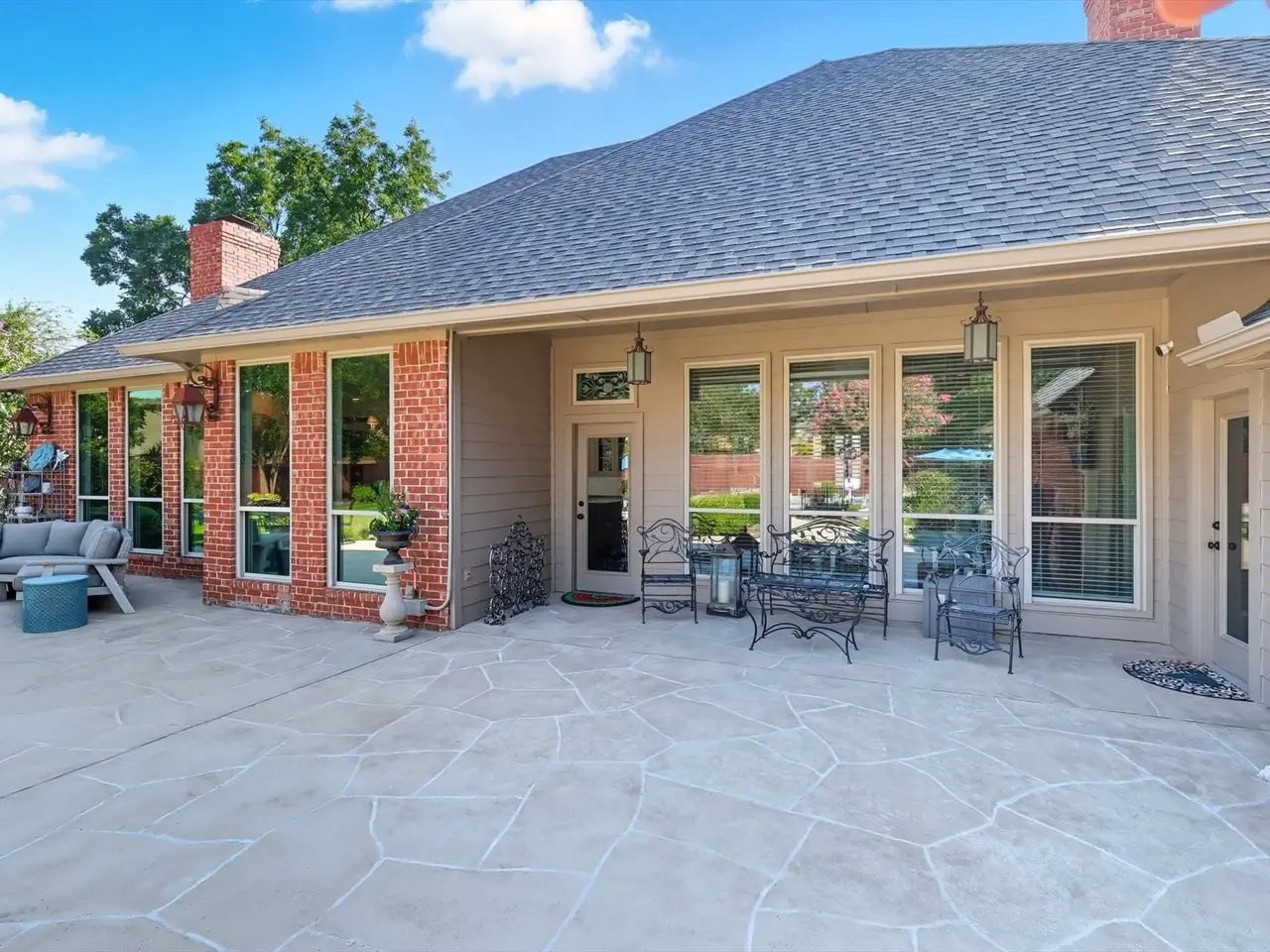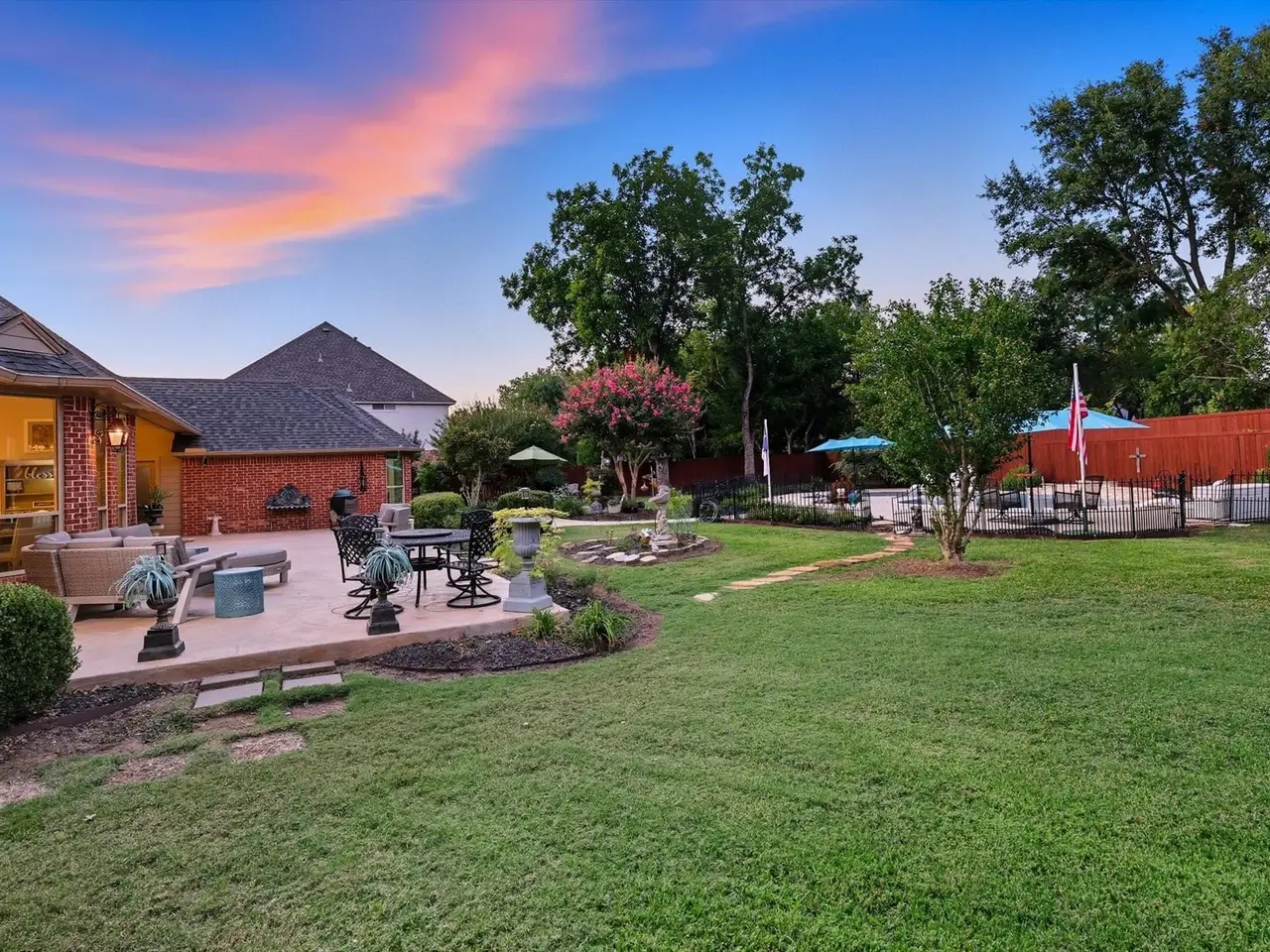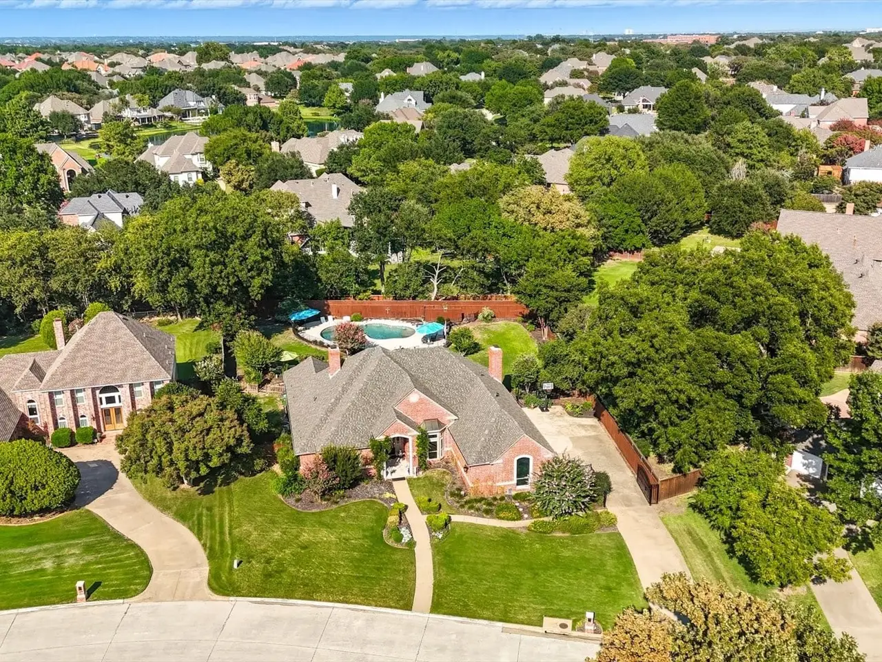 Life in Southridge Lakes means weekends by the pool, evening pickleball matches with neighbors, and an easy commute to DFW Airportall while being part of award-winning Carroll ISD. This single-story home captures that lifestyle with timeless style, thoughtful updates, and a quiet cul-de-sac setting. Step inside to hardwood floors throughout, two fireplaces for added charm, and a bright eat-in kitchen with granite counters, ample white cabinetry, gas cooktop, and a Kinetico K5 drinking station. A wall of windows in the breakfast area and adjoining family room fills the space with natural light and frames a beautiful pool view. Entertaining comes naturally here: enjoy a spacious patio with a built-in gas line for outdoor cooking, plus an additional gathering area overlooking the manicured yard and sparkling pool with an app-controlled waterfall. The privacy fence and gated driveway create a sense of retreat, while the drainage easement behind the property provides extra separation from neighbors. Practical and energy-efficient upgrades bring peace of mind, upgraded Class four roof, HVAC units with iWaveR ionization air cleaners, double-pane replacement windows, an epoxy-finished garage floor, and a whole-home water softener. Southridge Lakes residents enjoy resort-style amenities such as a community pool, tennis and pickleball courts, a playground, and a clubhouse. The home is minutes from shopping, dining, parks, and entertainment, making it an ideal blend of convenience, community, and comfort. With only two owners, this home has been meticulously maintained and is ready for its next chapter, just in time to enjoy Southridge Lakes famous trick-or-treat night.