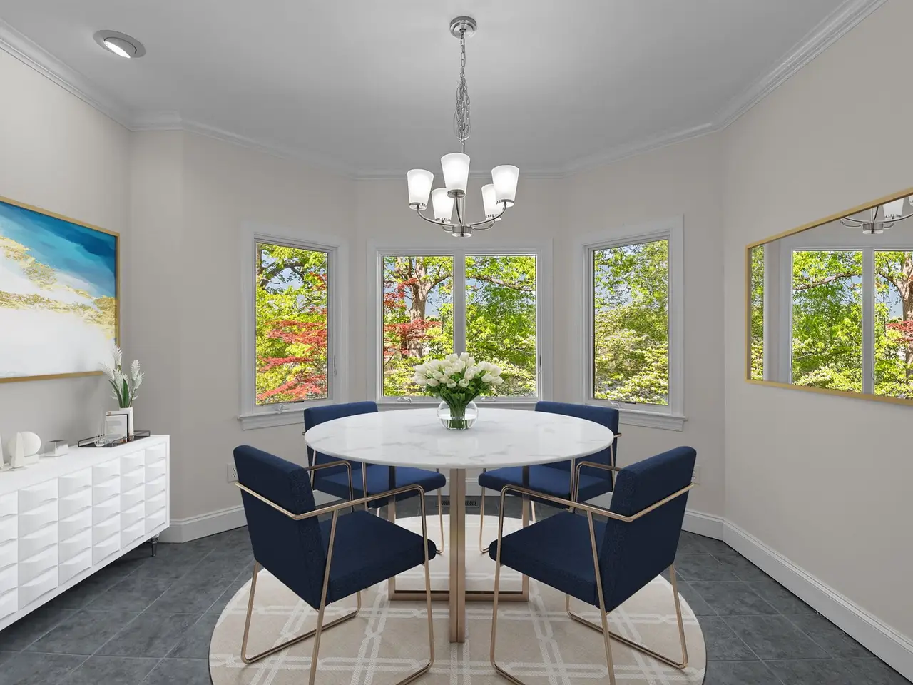 • Custom millwork and coffered ceilings