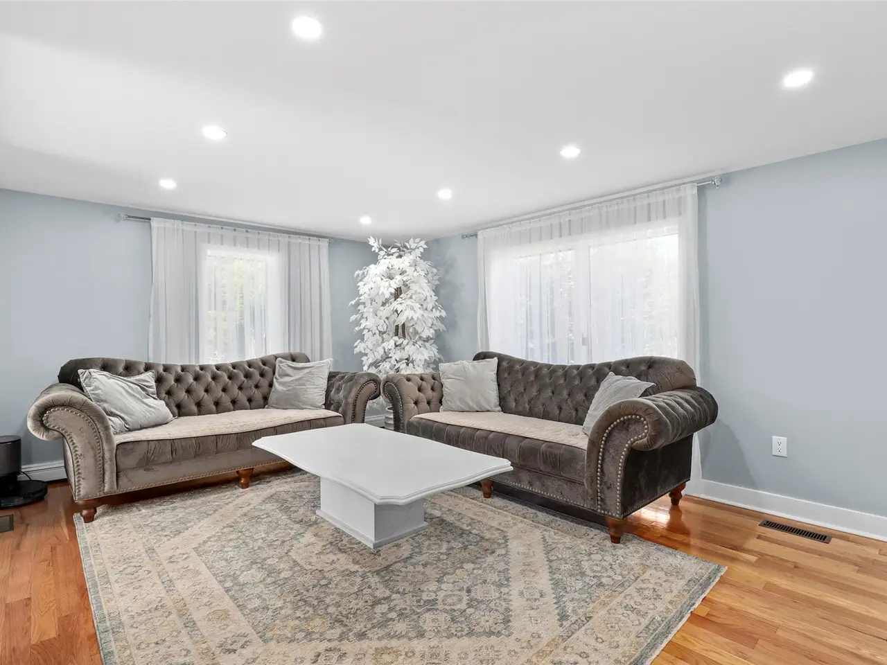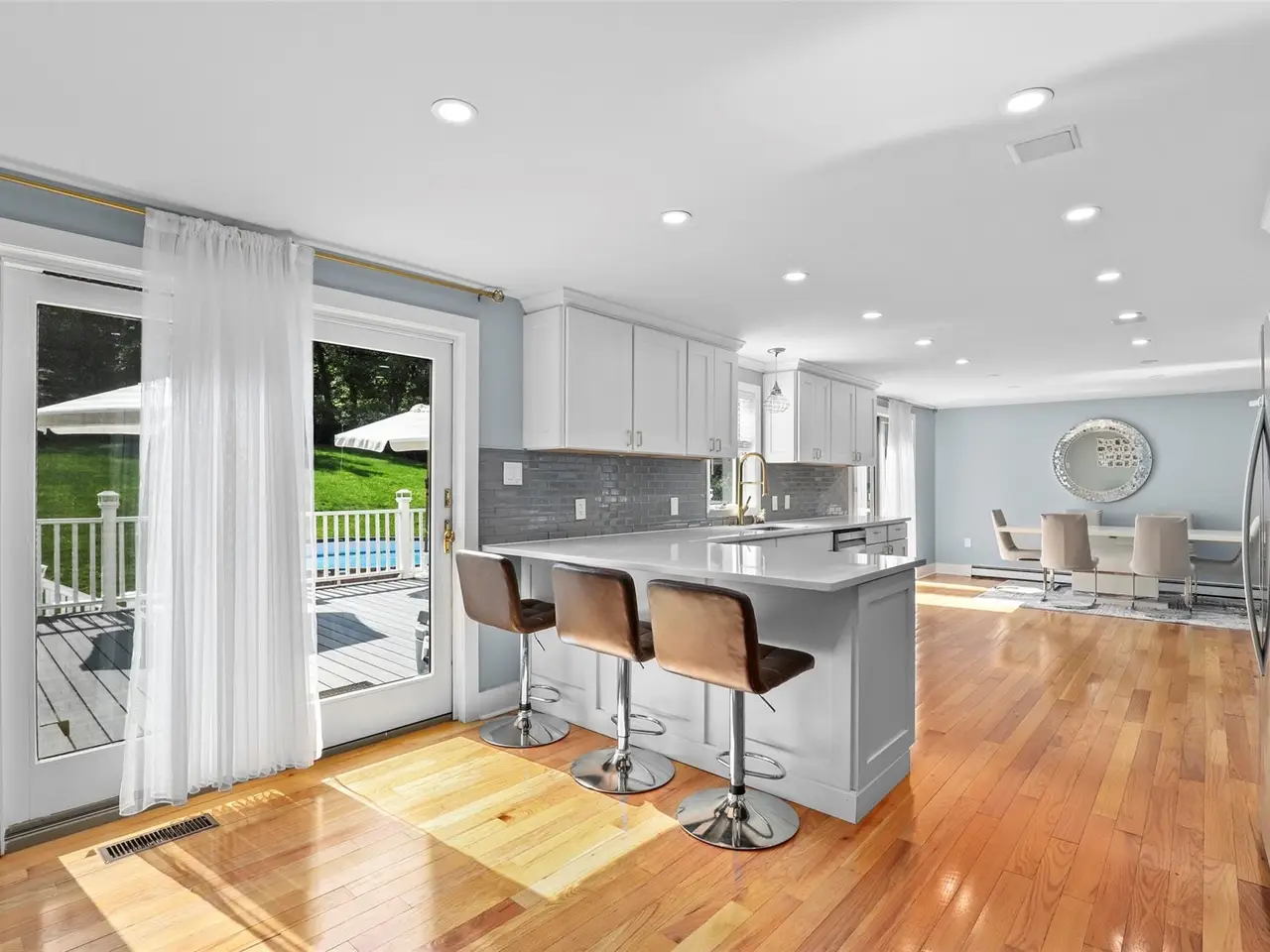 GLEAMING WITH PRIDE! Naturally light-filled Yorktown home with a range of custom, high quality updates by current owner. Your move into this gem comes with peace-of-mind and nothing to do! Newness surrounds this expansive 3 bedroom Contemporary (that lives like a 4). Bursting with charm and slick custom upgrades like TWO beautiful fireplaces, a huge eat-in-kitchen accented by stunning white granite counter tops and a sink window overlooking the expansive private backyard. The floor plan offers a large dining area, living room and a family room all on one floor. Gleaming hardwood flooring throughout. Skylights brighten up the cathedral entry hall area. The multiple-speaker system on the main floor is a nice touch as is the rows of recessed lighting. The primary bedroom is huge, accompanied by a marble laced shower bath. Let's keep going...there's a generator hookup in the two-car garage. You won't believe the custom stone work surrounding the long, expansive driveway (recently re-sealed)! Want more? The house is waterproofed and comes equipped with an enhanced drainage system directing water away from the house. The owner recently installed high end fencing with green camouflage that perfectly blends in with the lush nature surrounding the property. Two SGD's off the kitchen lead to a nice deck overlooking the pool and fire pit with plenty of privacy. Lots of exterior custom lighting, too. Escape & enjoy peace-and-quiet after a long day at this one-of-a-kind retreat that is enhanced by being situated on a quiet cul-de-sac.